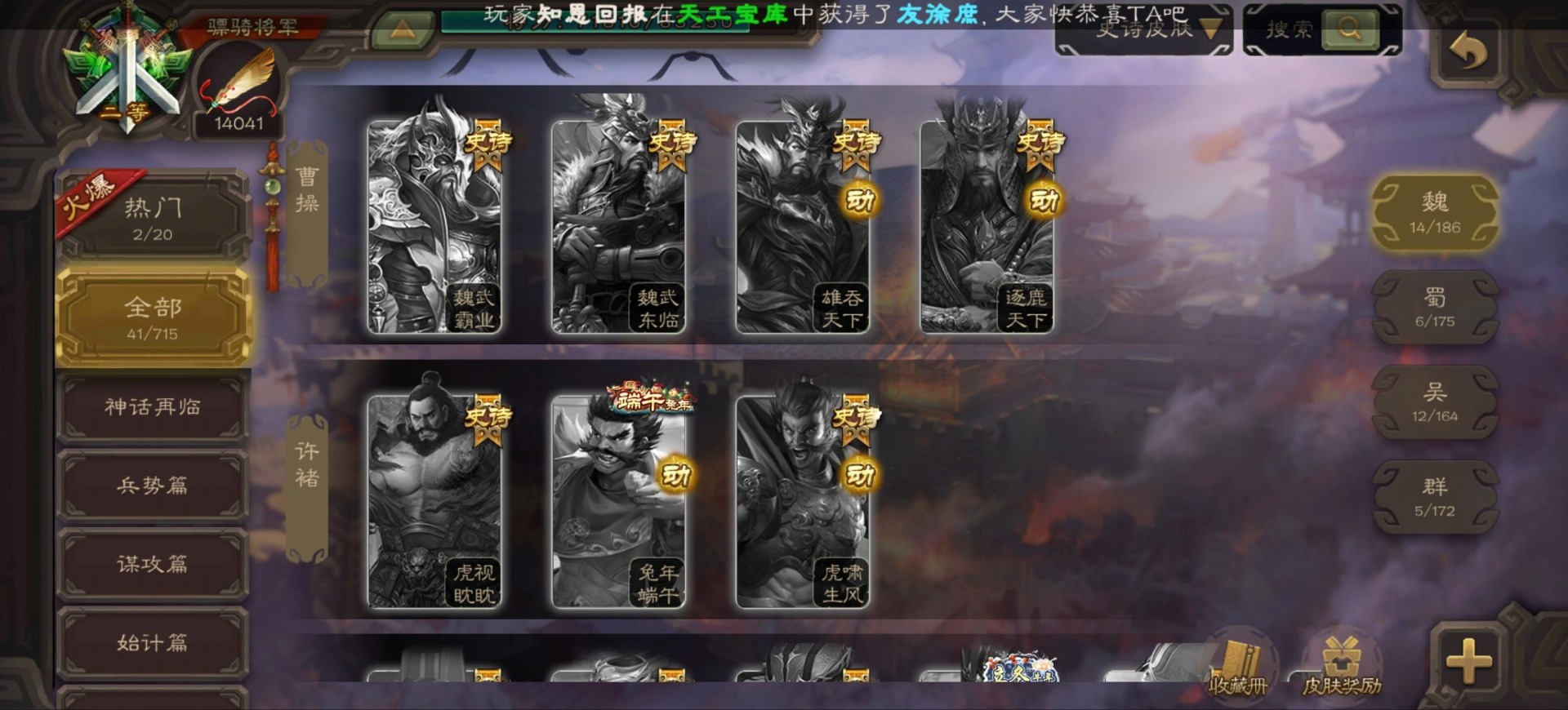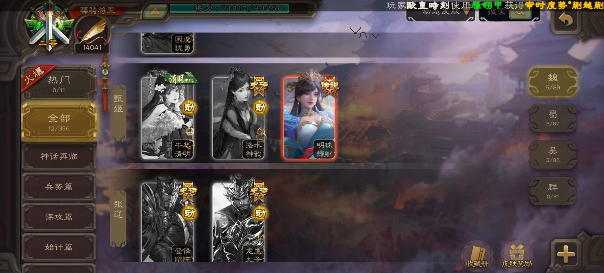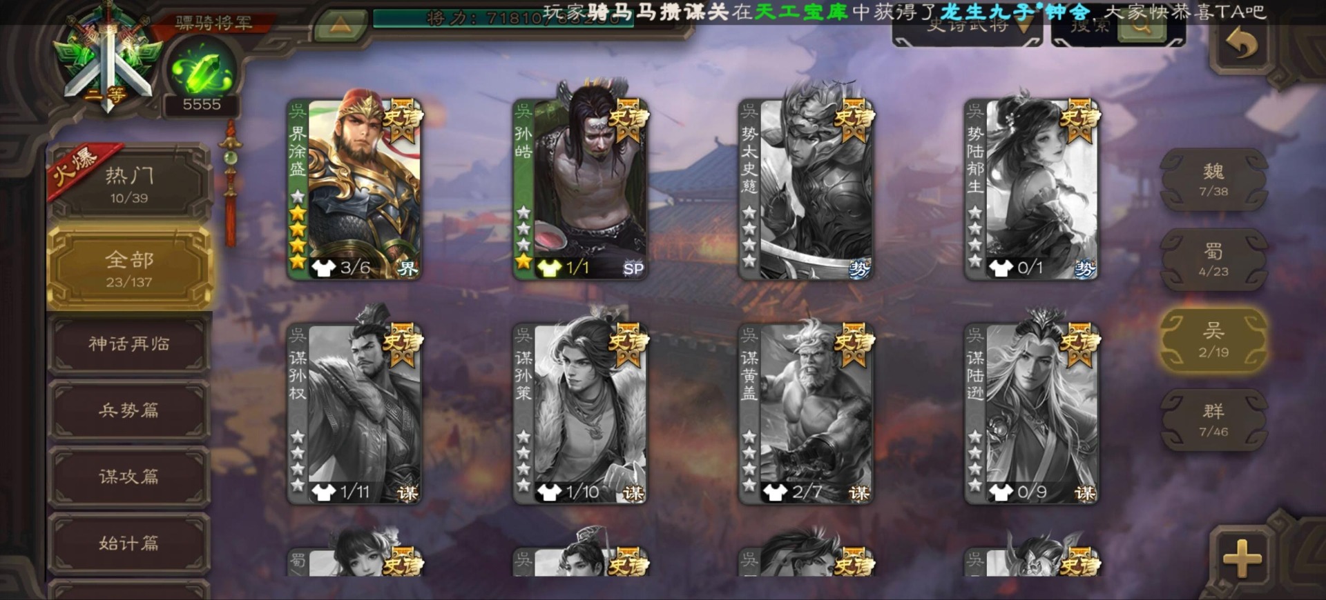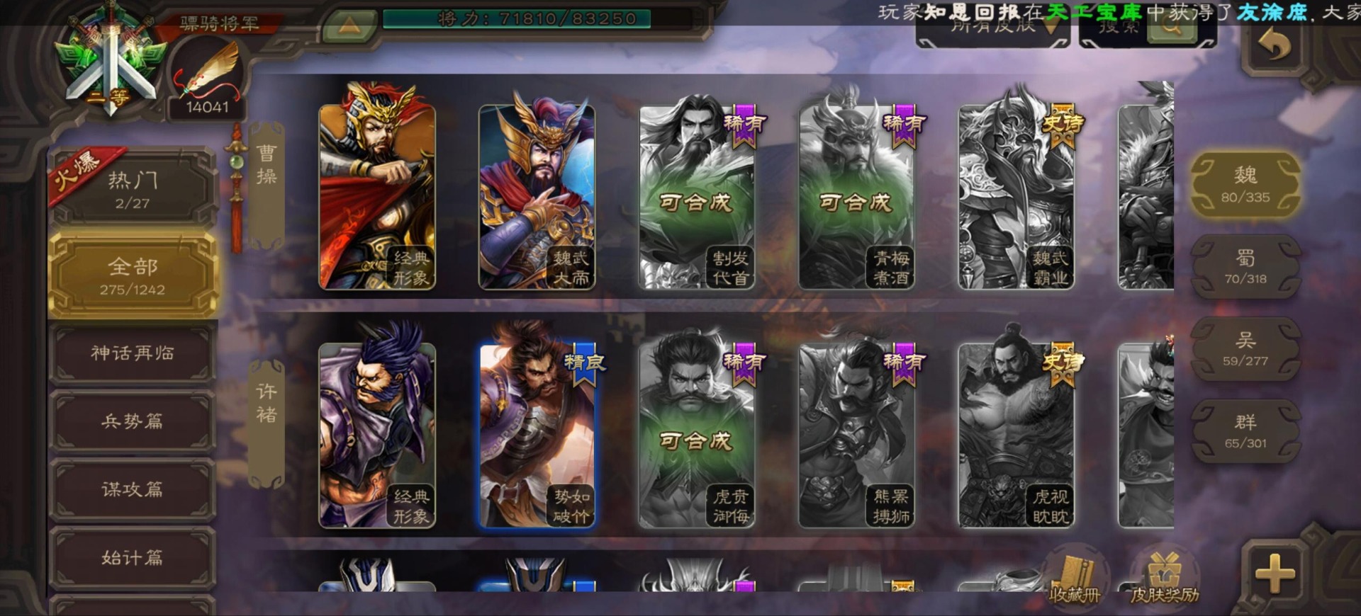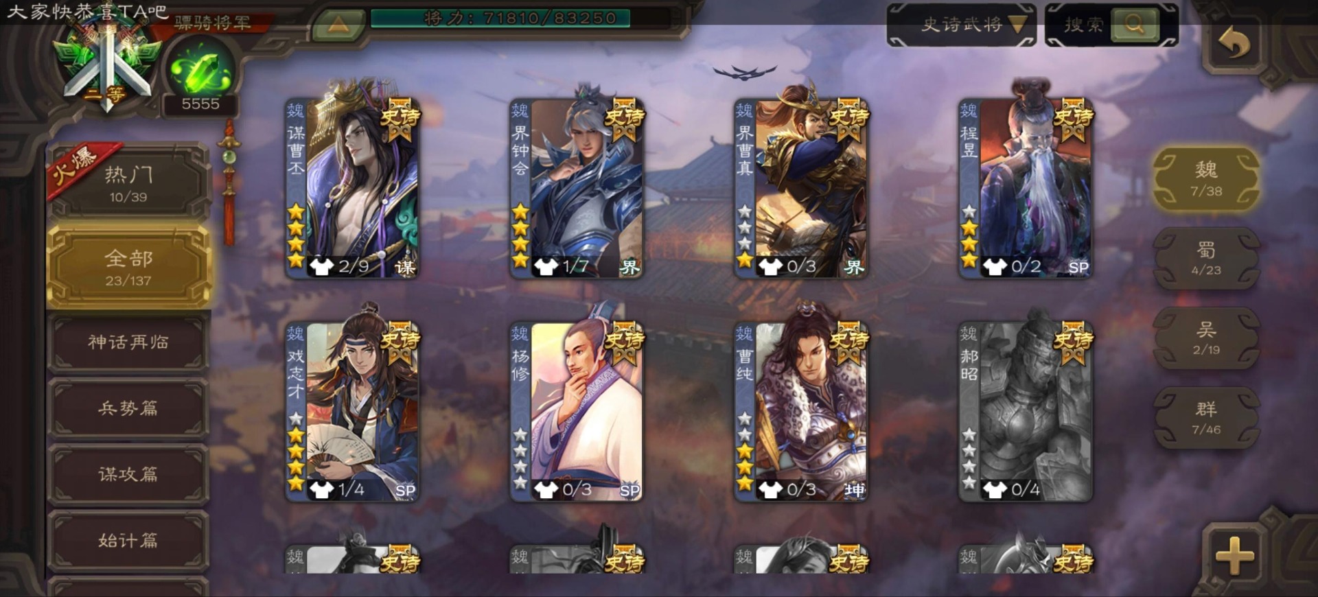 [16334299]vip8 骠骑将军 273武将 12动态皮肤 23史诗武将 【神将】神赵云神张辽神孙策 【魏国武将】杨修界钟会界曹真程昱曹纯戏志才谋曹丕甄姬司马懿许褚夏侯惇郭嘉曹仁曹操张辽 【蜀国武将】谋马超诸葛瞻沙摩柯花鬘 【吴国武将】孙皓界徐盛 【群国武将】左慈张让星黄忠兀突骨沮授界左慈界李儒