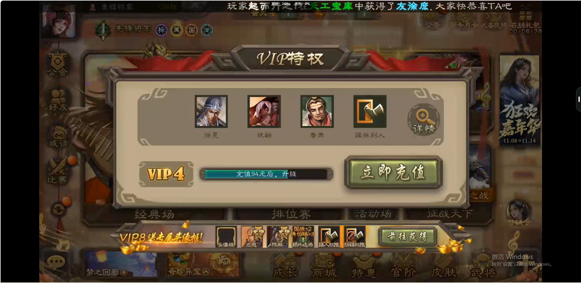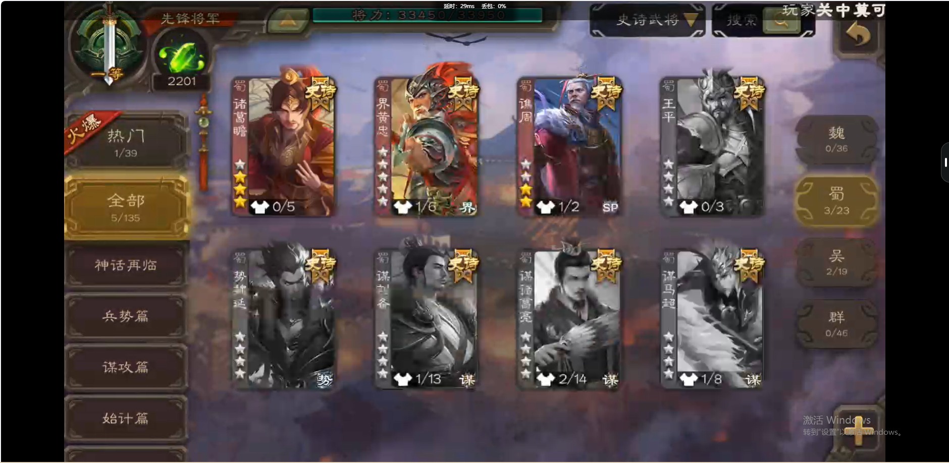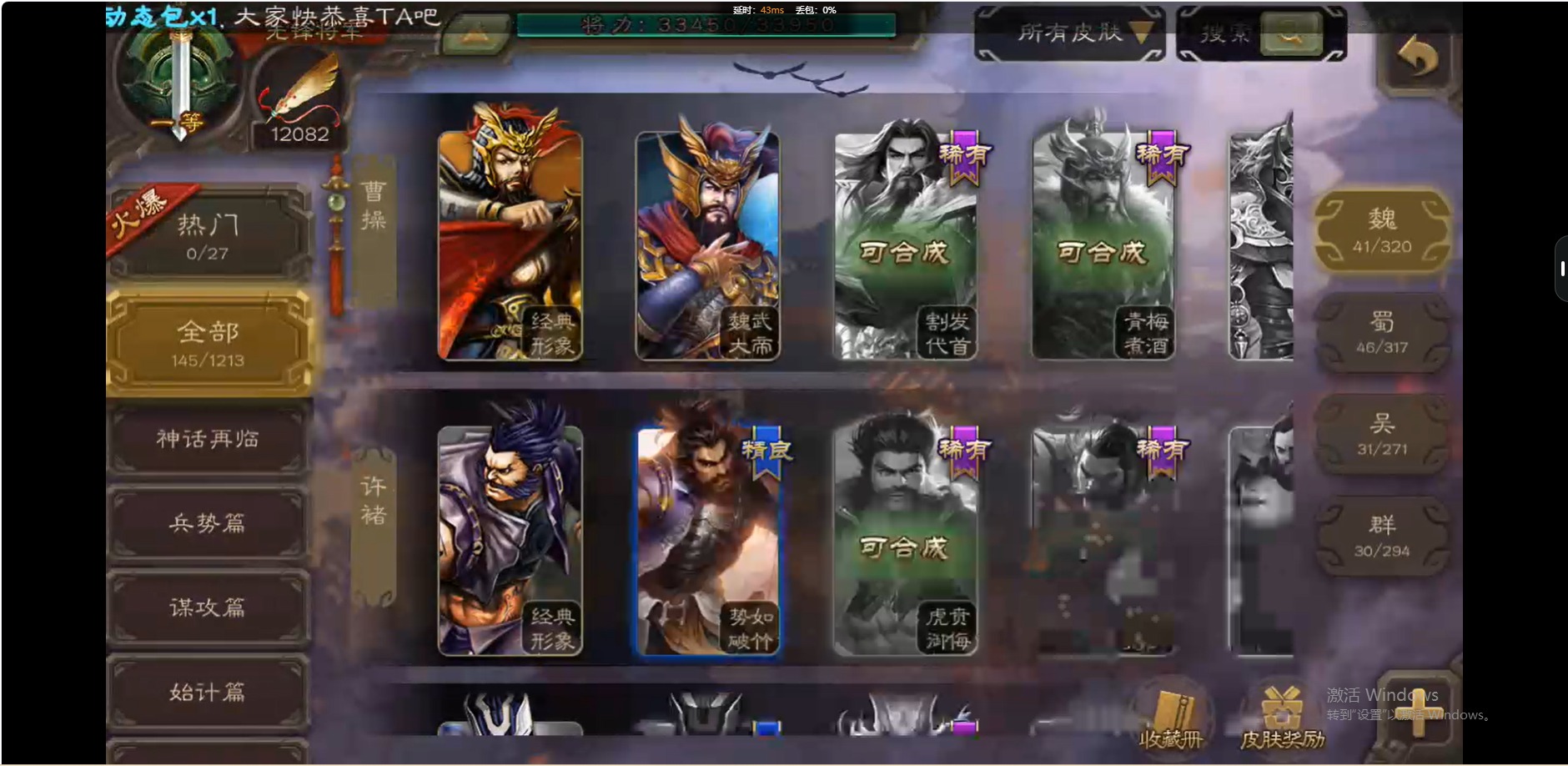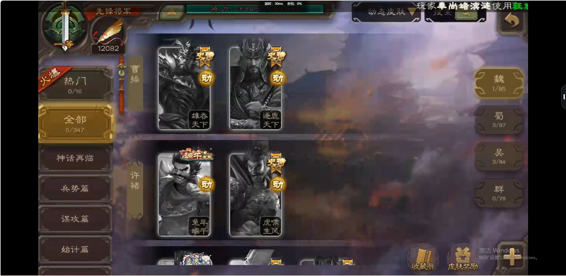 [16341547]vip4 先锋将军 5武将 269动态皮肤 5史诗武将 3宝珠 【魏国武将】:许褚曹操 【蜀国武将】:诸葛瞻谯周界黄忠关银屏 【吴国武将】:势太史慈周处
