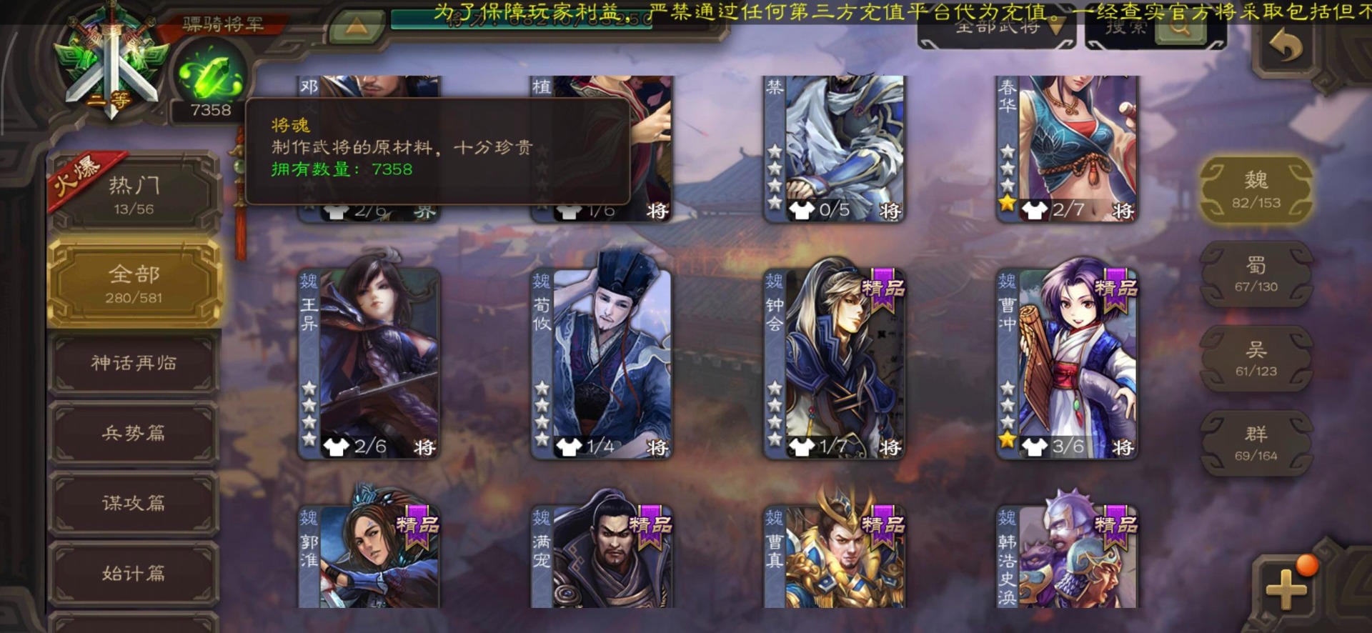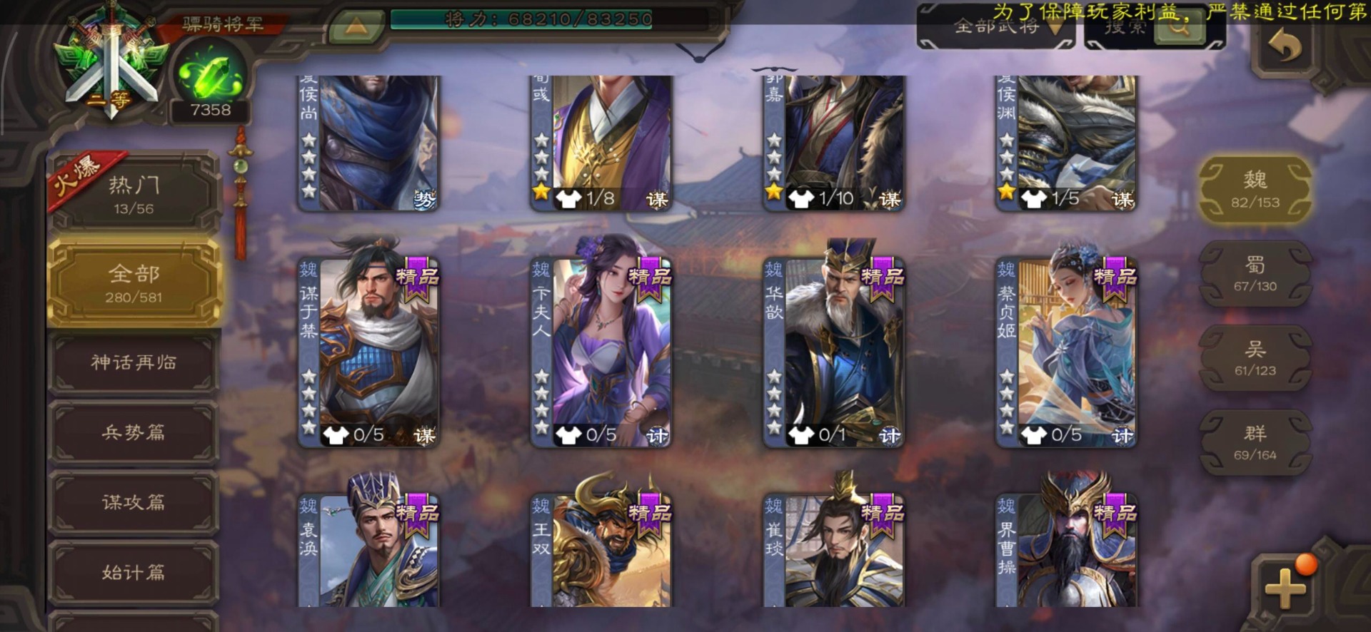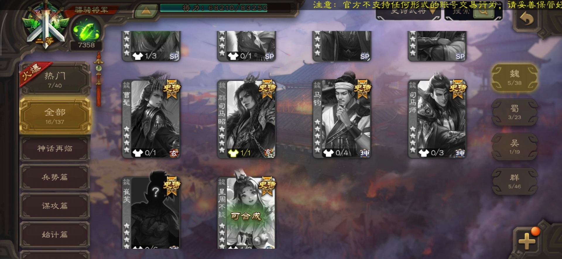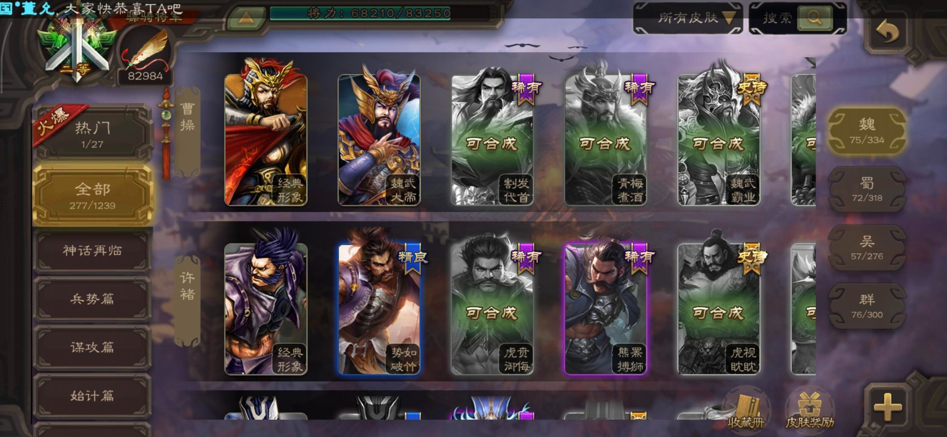 [16342824]vip0 骠骑将军 280武将 19动态皮肤 16史诗武将 【神将】:神吕布神郭嘉 【魏国武将】:清河公主郝昭程昱曹纯戏志才典韦甄姬司马懿张郃许褚夏侯惇荀彧曹仁曹操