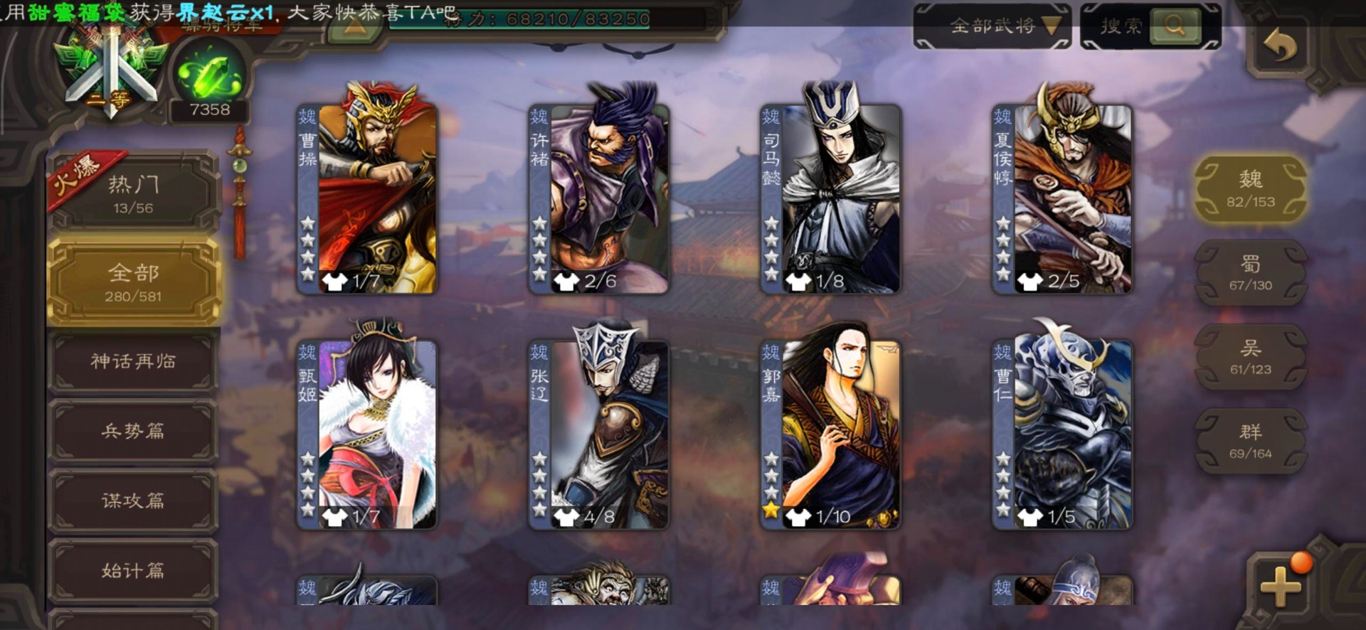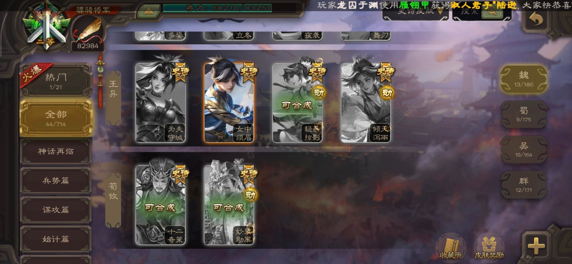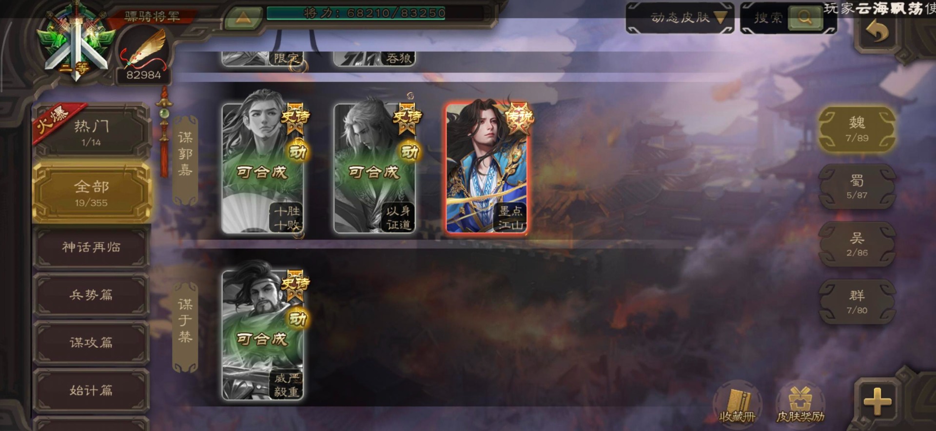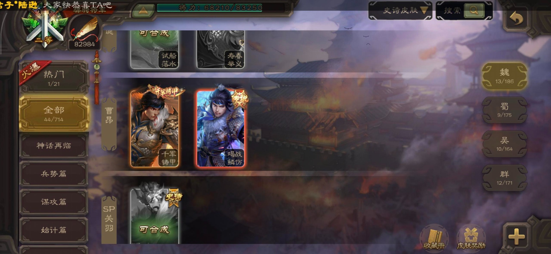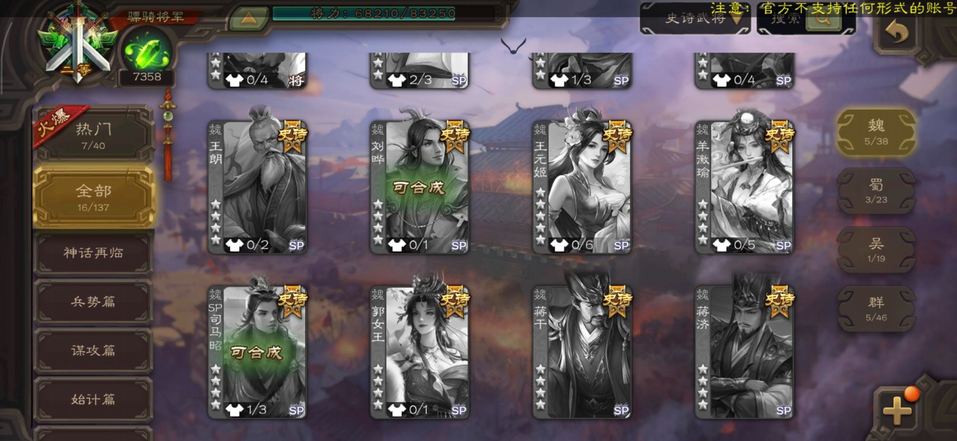 [16342824]vip0 骠骑将军 280武将 19动态皮肤 16史诗武将 【神将】:神吕布神郭嘉 【魏国武将】:清河公主郝昭程昱曹纯戏志才典韦甄姬司马懿张郃许褚夏侯惇荀彧曹仁曹操