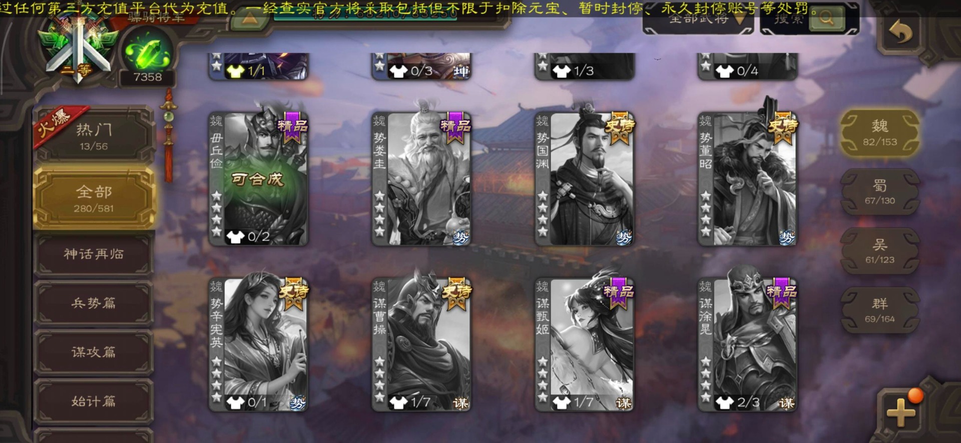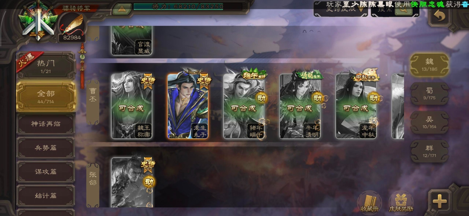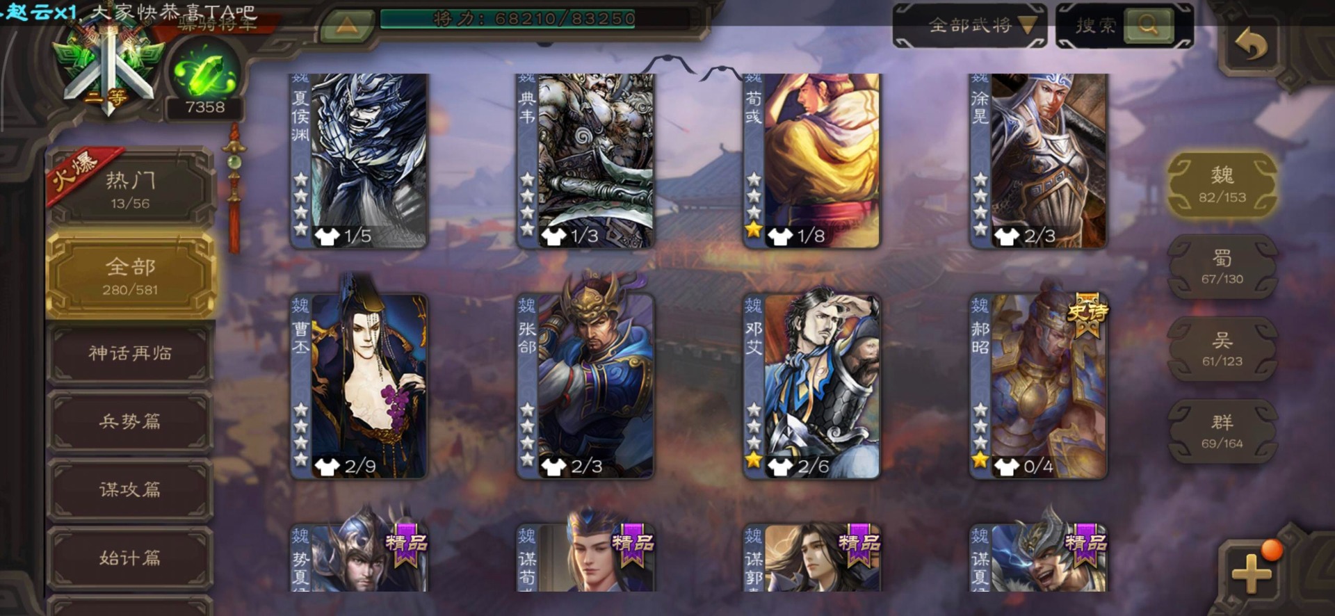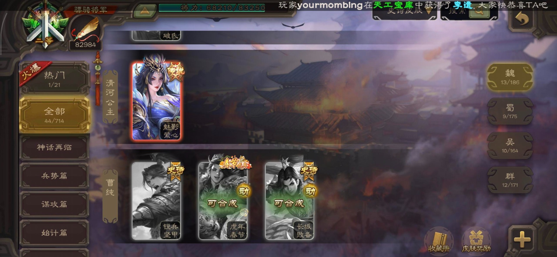 [16342824]vip0 骠骑将军 280武将 19动态皮肤 16史诗武将 【神将】:神吕布神郭嘉 【魏国武将】:清河公主郝昭程昱曹纯戏志才典韦甄姬司马懿张郃许褚夏侯惇荀彧曹仁曹操