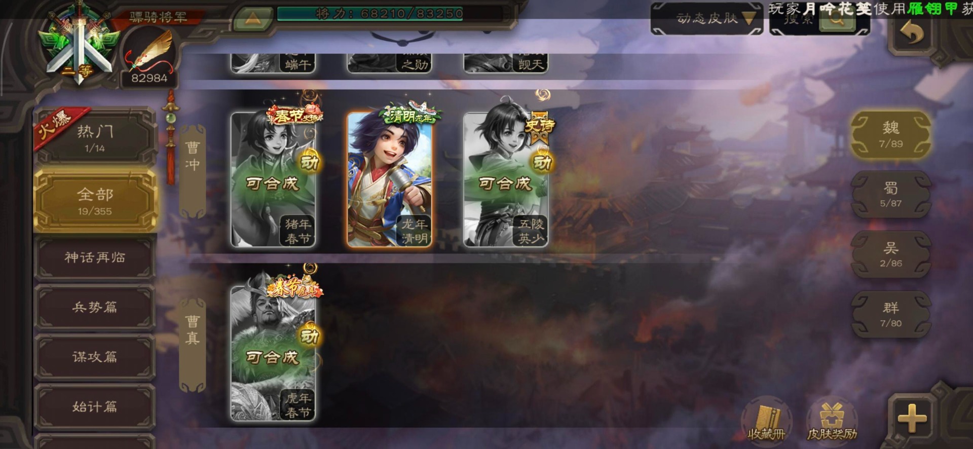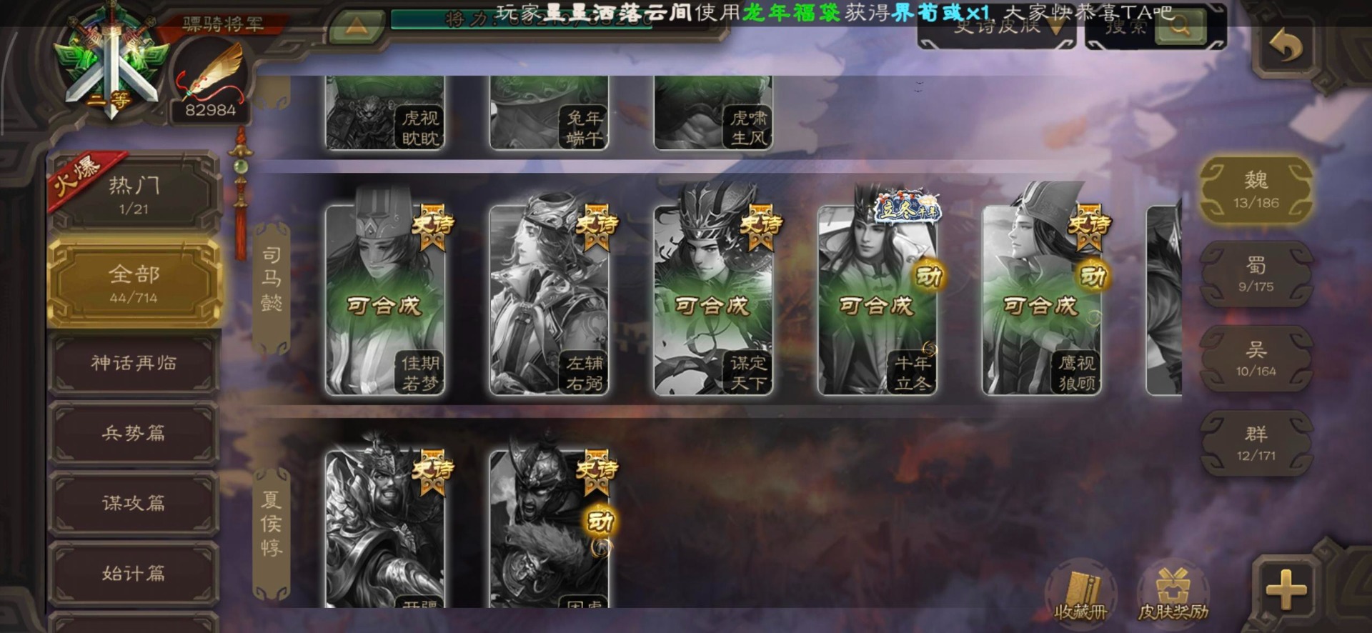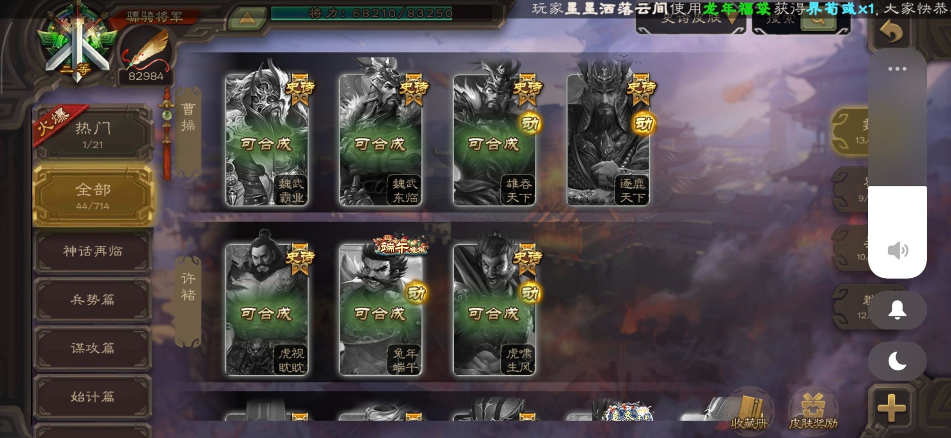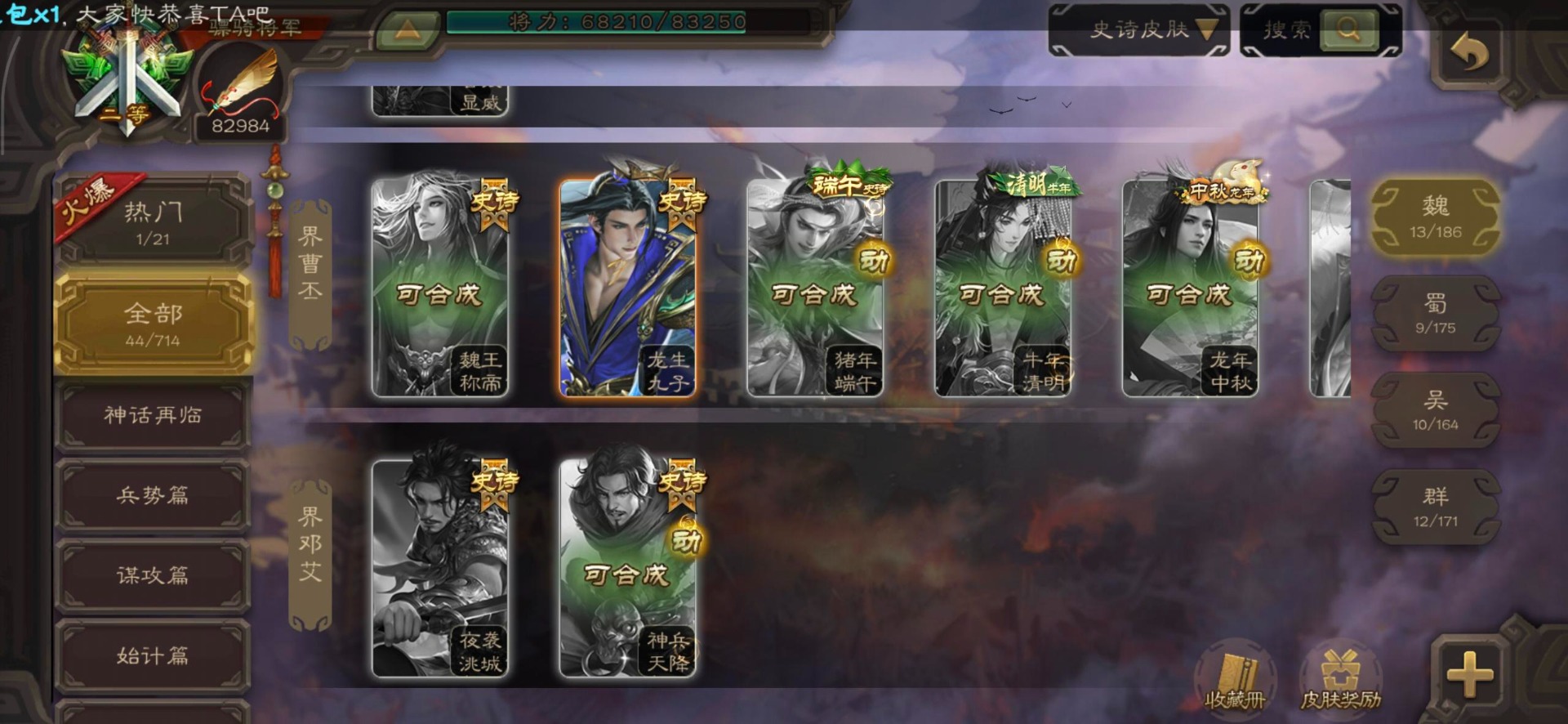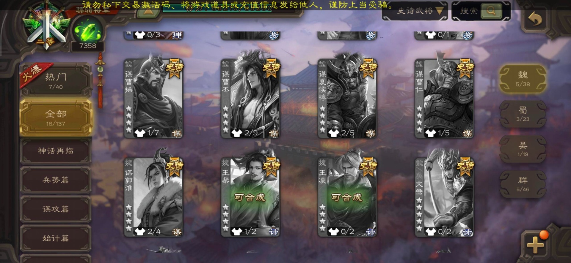 [16342824]vip0 骠骑将军 280武将 19动态皮肤 16史诗武将 【神将】:神吕布神郭嘉 【魏国武将】:清河公主郝昭程昱曹纯戏志才典韦甄姬司马懿张郃许褚夏侯惇荀彧曹仁曹操