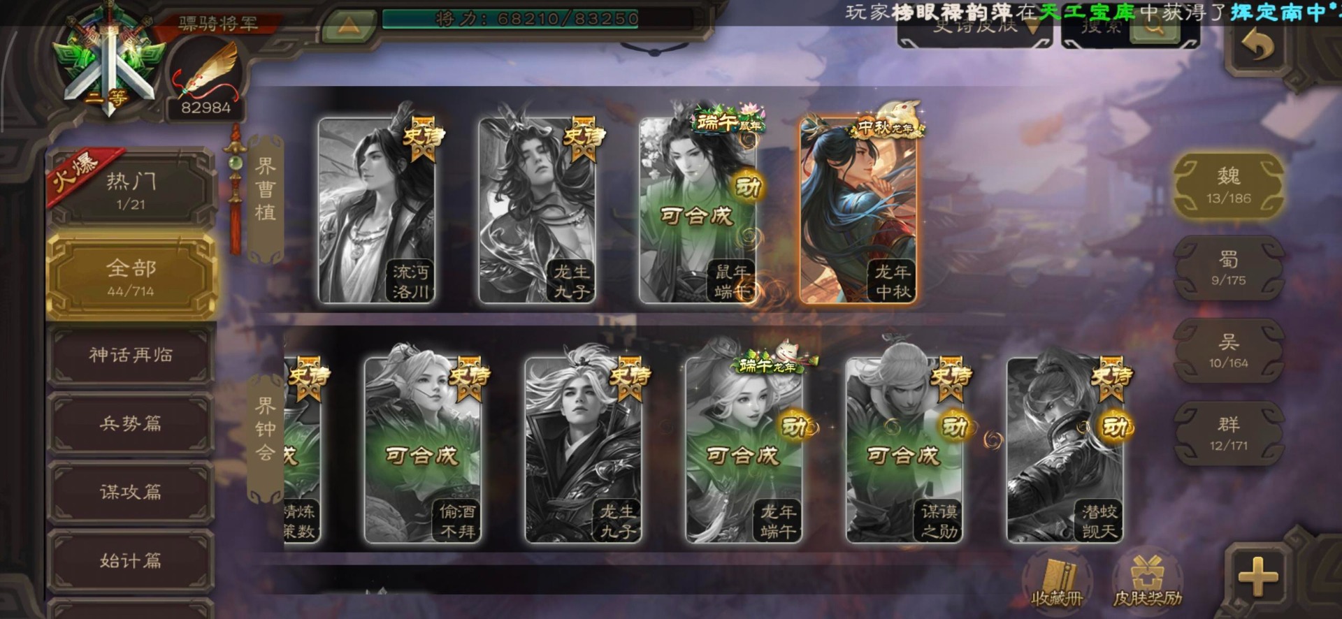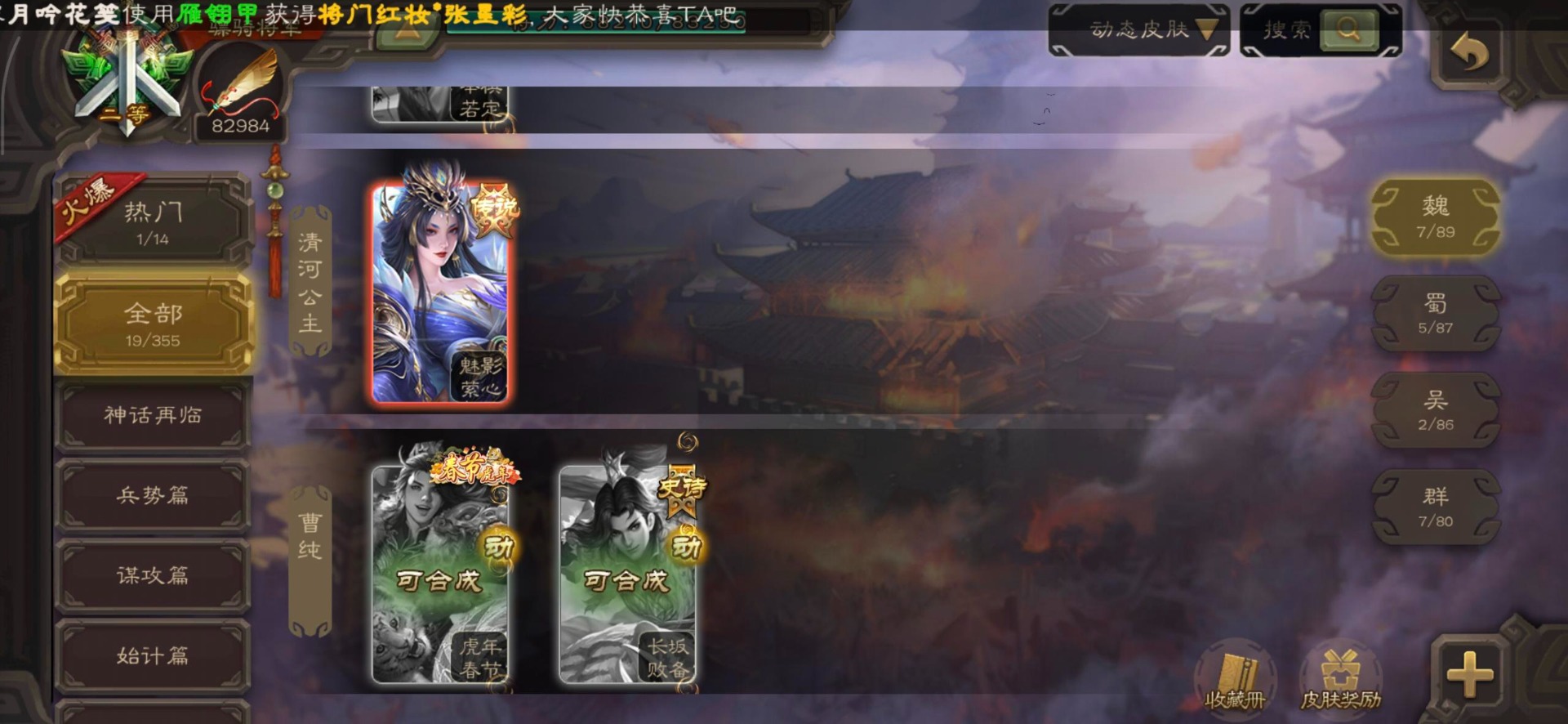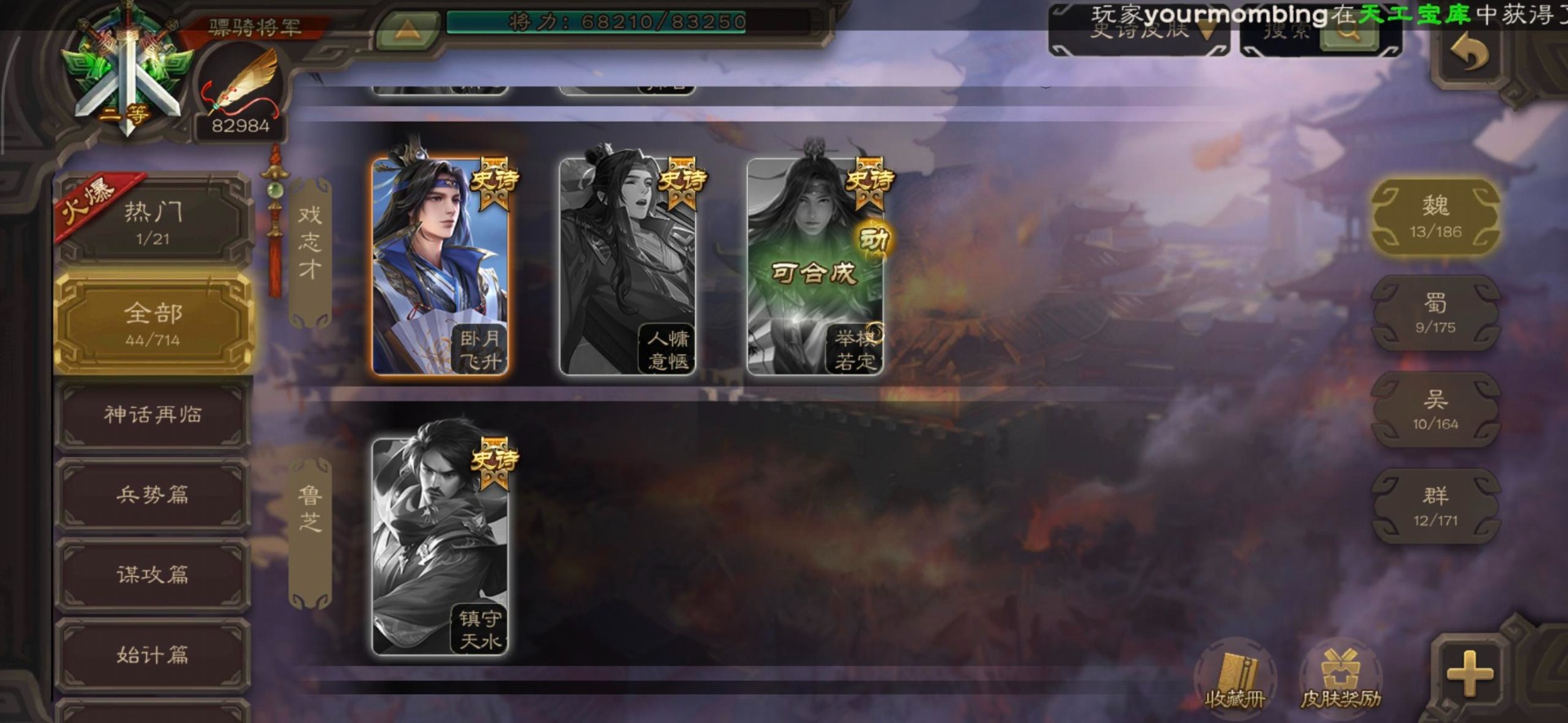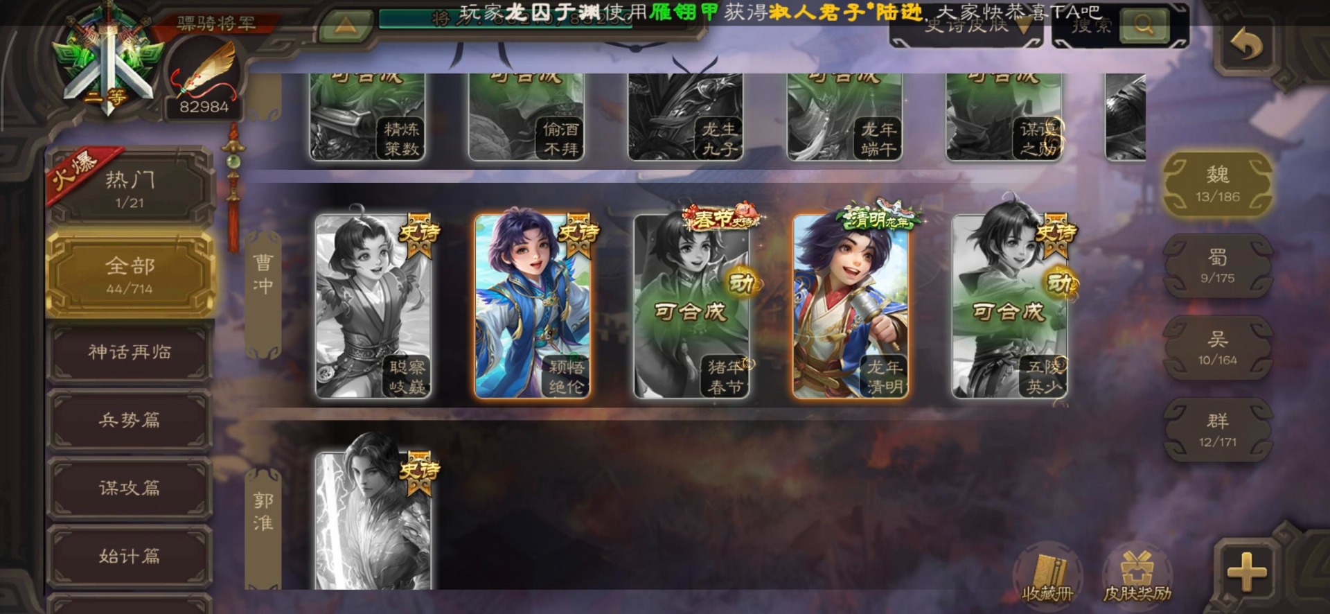 [16342824]vip0 骠骑将军 280武将 19动态皮肤 16史诗武将 【神将】:神吕布神郭嘉 【魏国武将】:清河公主郝昭程昱曹纯戏志才典韦甄姬司马懿张郃许褚夏侯惇荀彧曹仁曹操