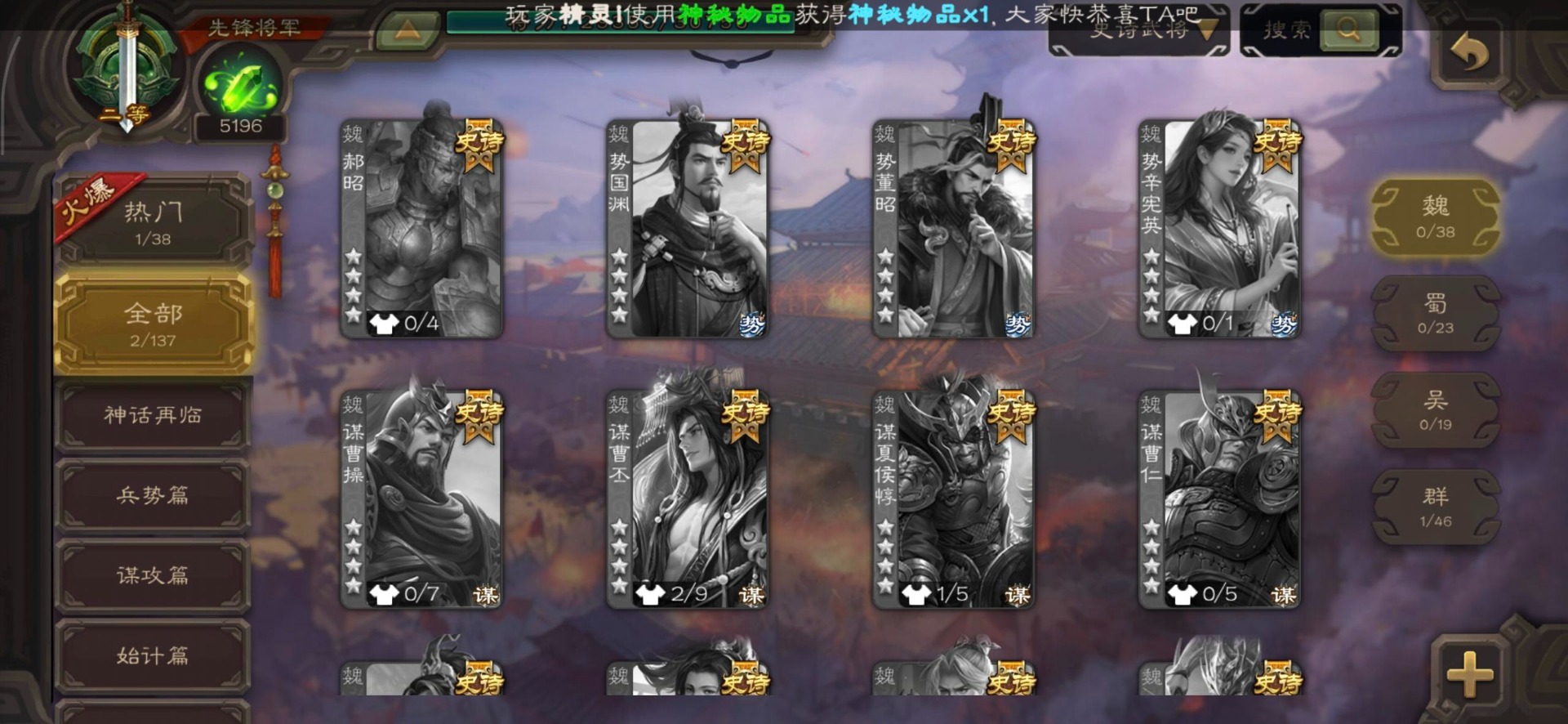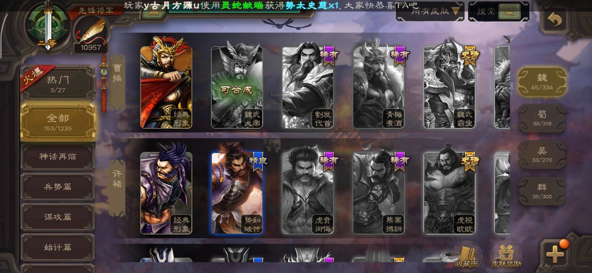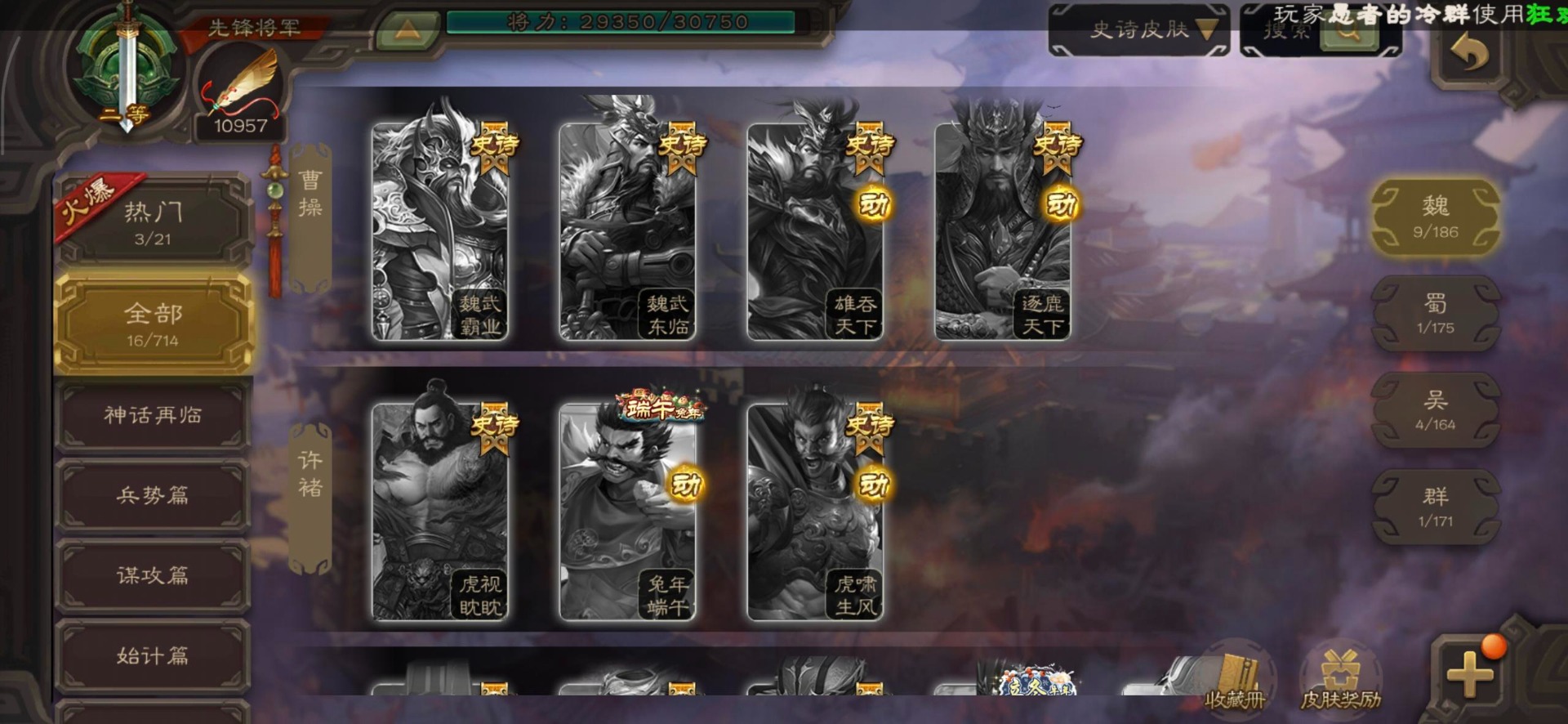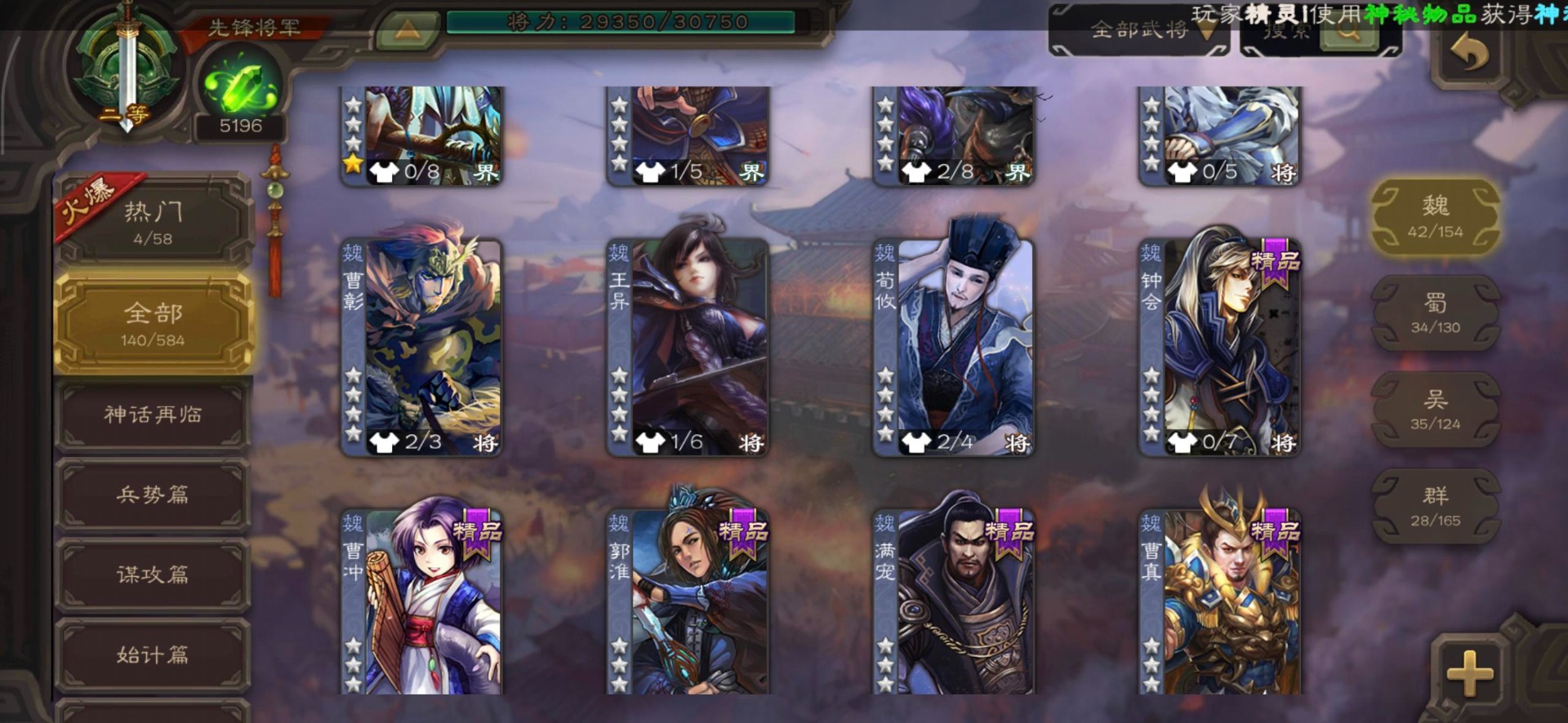 [16350490]vip3 先锋将军 140武将 3动态皮肤 2史诗武将 【神将】神司马懿 【魏国武将】界司马懿于禁界夏侯惇界张辽界曹操卞夫人邓艾张郃