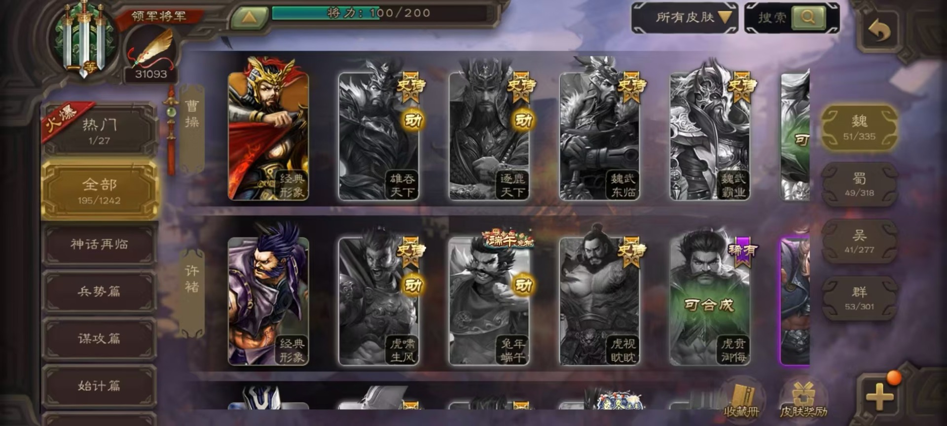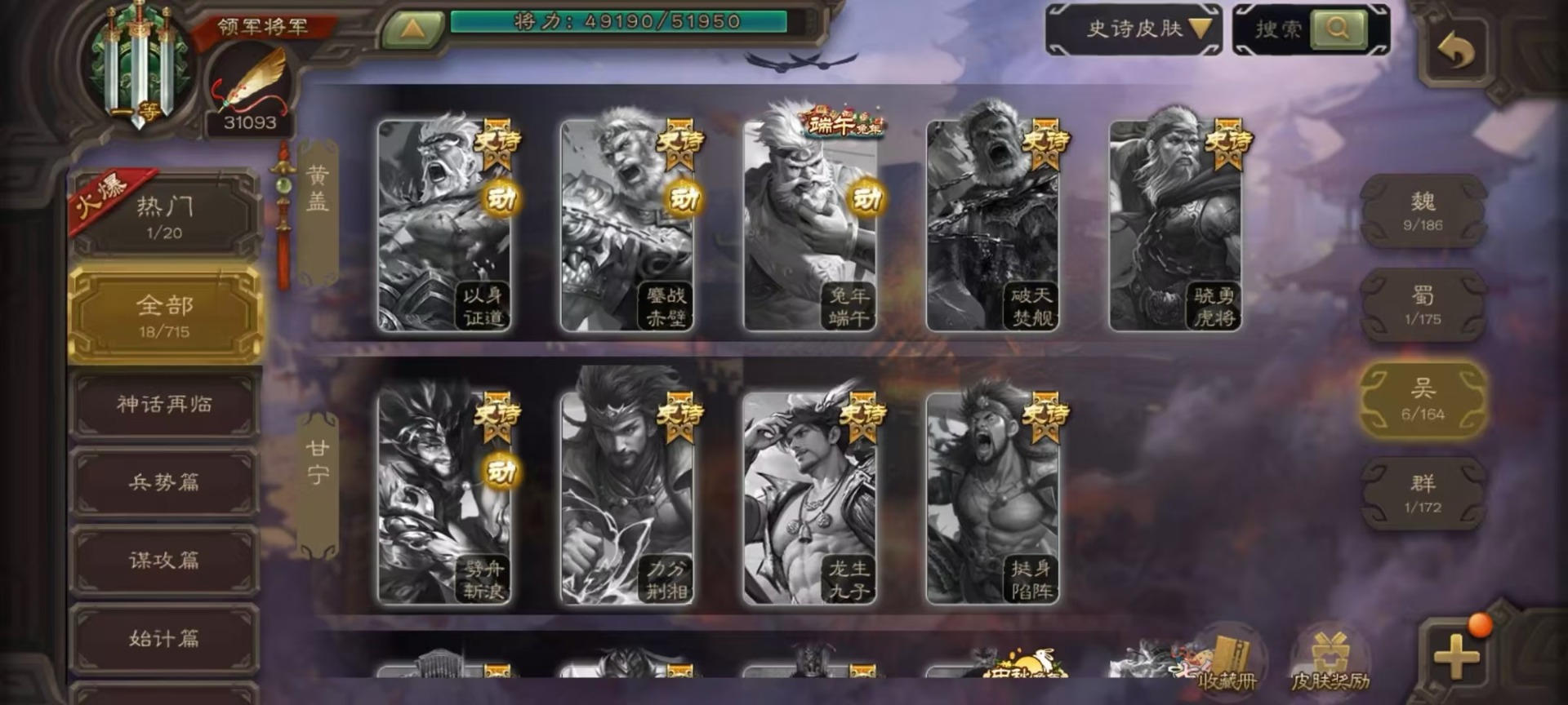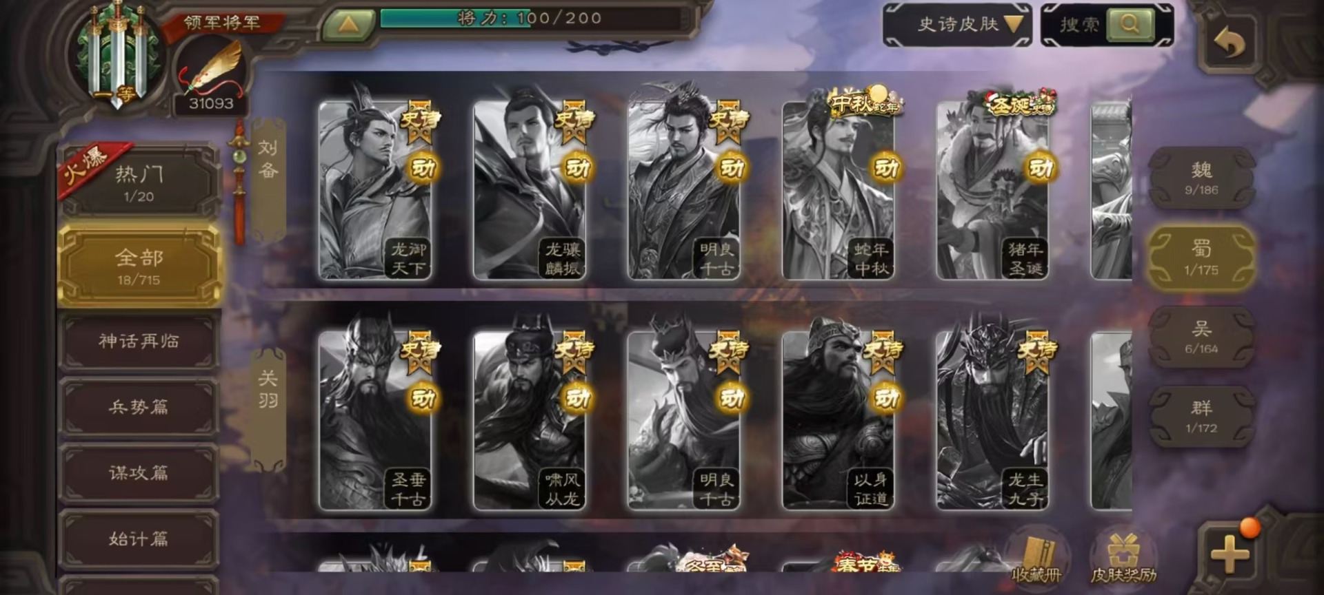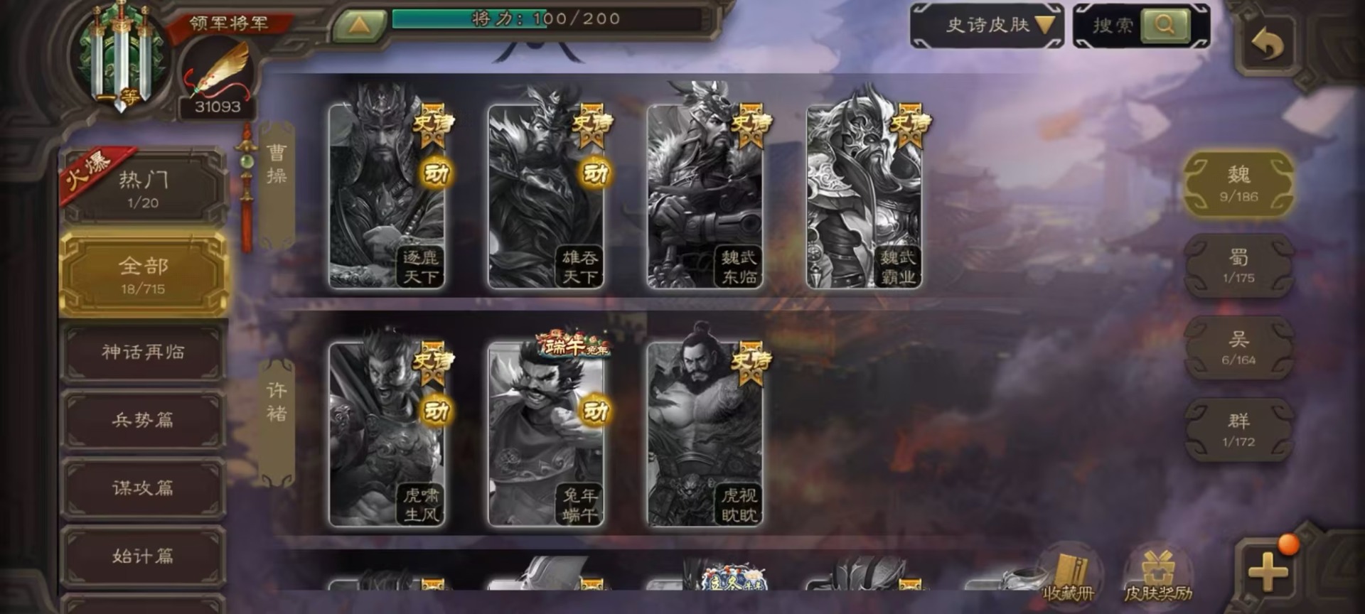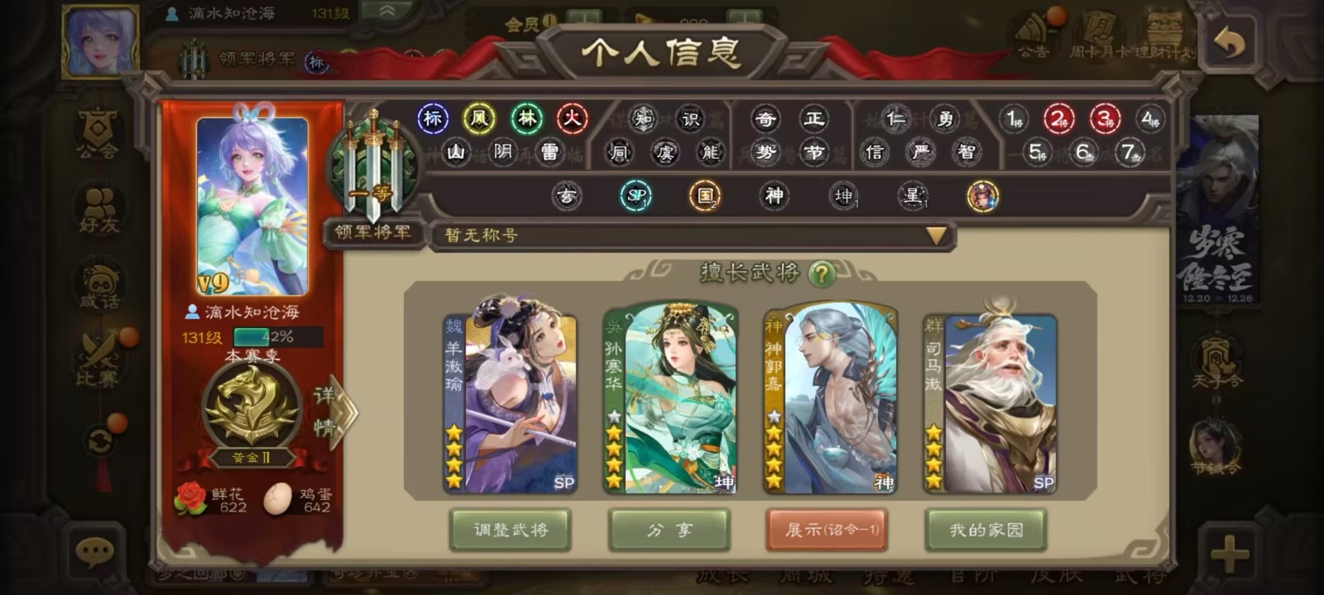 [16352084]vip9 领军将军 219武将 7动态皮肤 12史诗武将 1宝珠 【神将】:神陆逊神郭嘉 【魏国武将】:羊徽瑜程昱曹纯甄姬司马懿许褚夏侯惇郭嘉曹仁曹操张辽 【蜀国武将】:界黄忠 【吴国武将】:吴景孙寒华骆统界朱然 【群国武将】:左慈司马徽