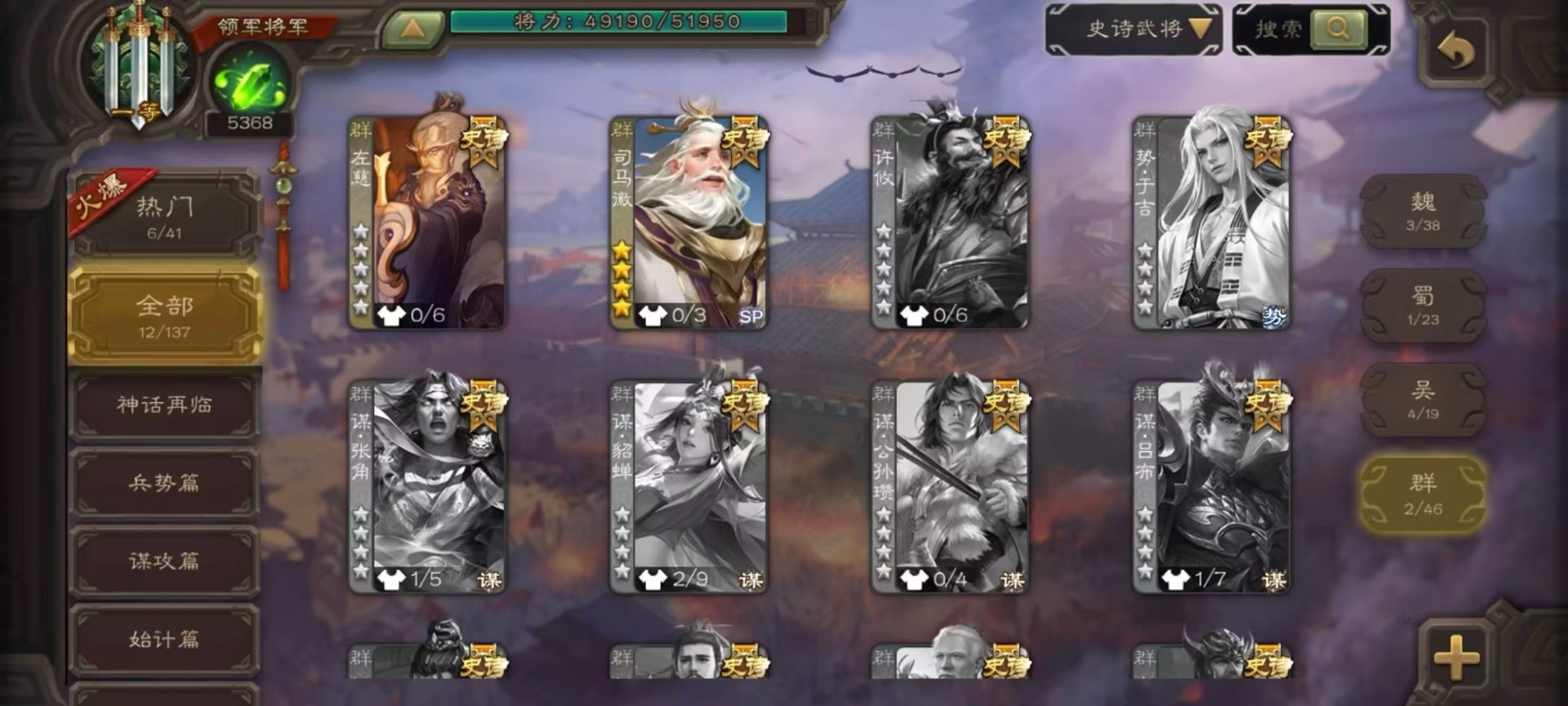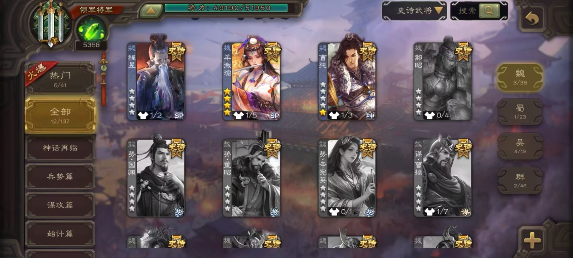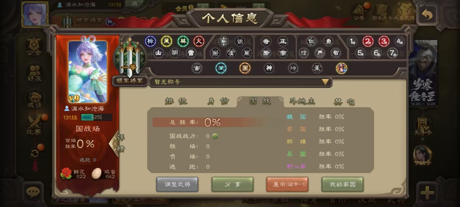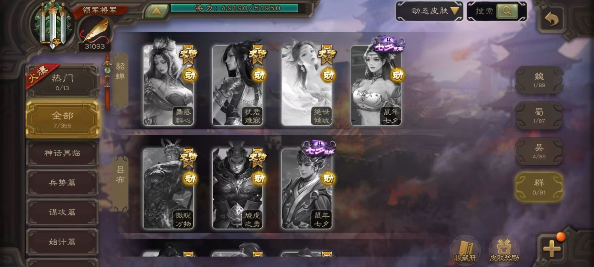 [16352084]vip9 领军将军 219武将 7动态皮肤 12史诗武将 1宝珠 【神将】:神陆逊神郭嘉 【魏国武将】:羊徽瑜程昱曹纯甄姬司马懿许褚夏侯惇郭嘉曹仁曹操张辽 【蜀国武将】:界黄忠 【吴国武将】:吴景孙寒华骆统界朱然 【群国武将】:左慈司马徽