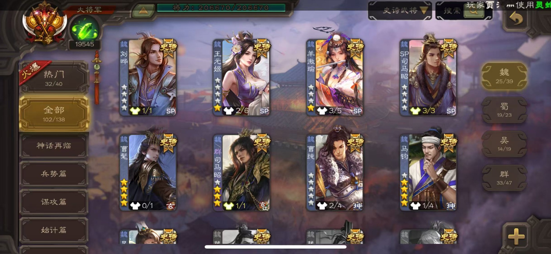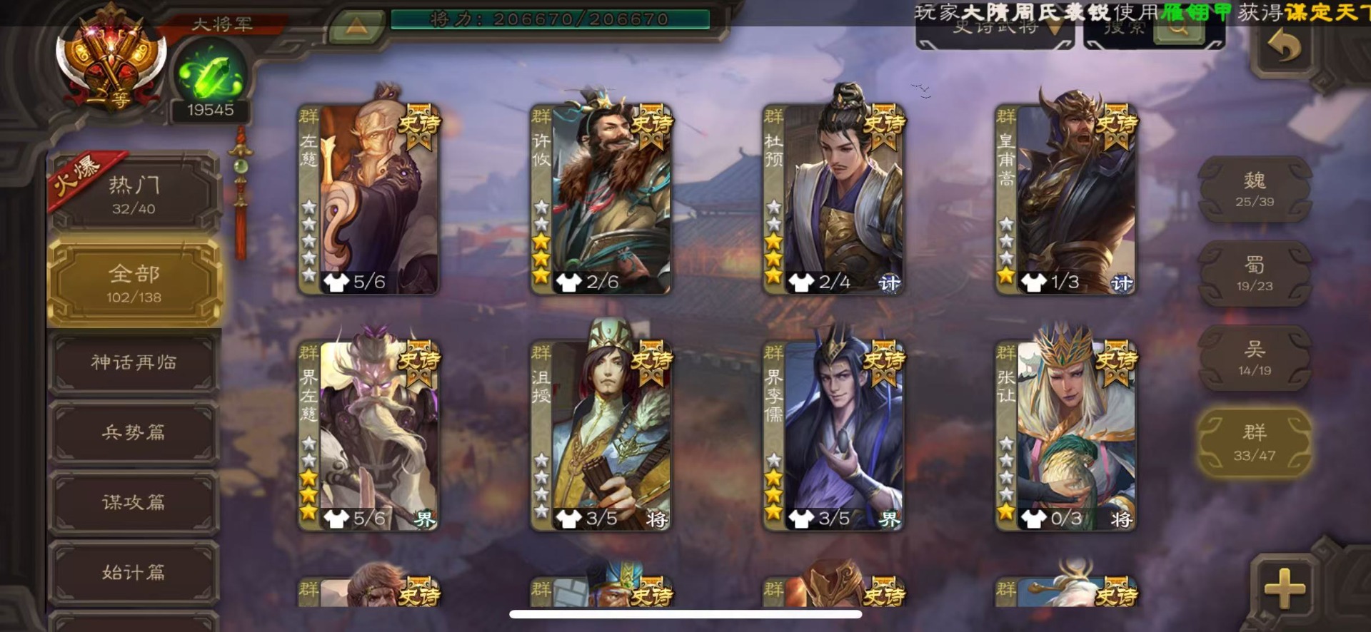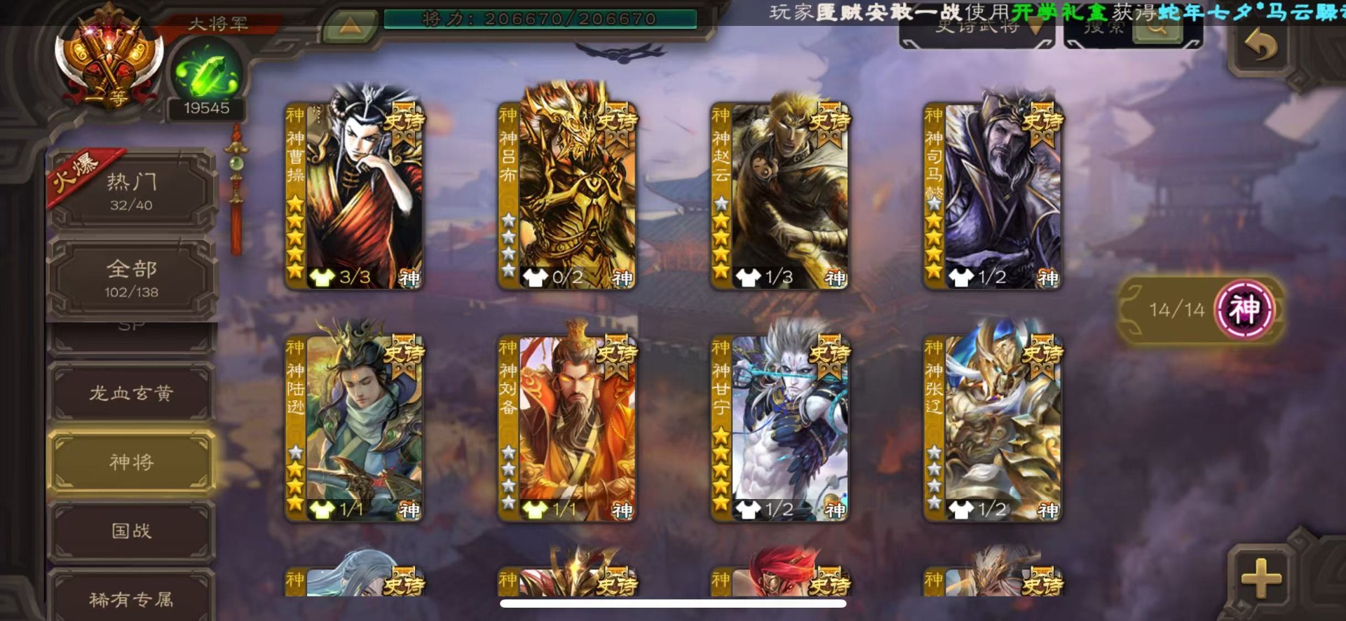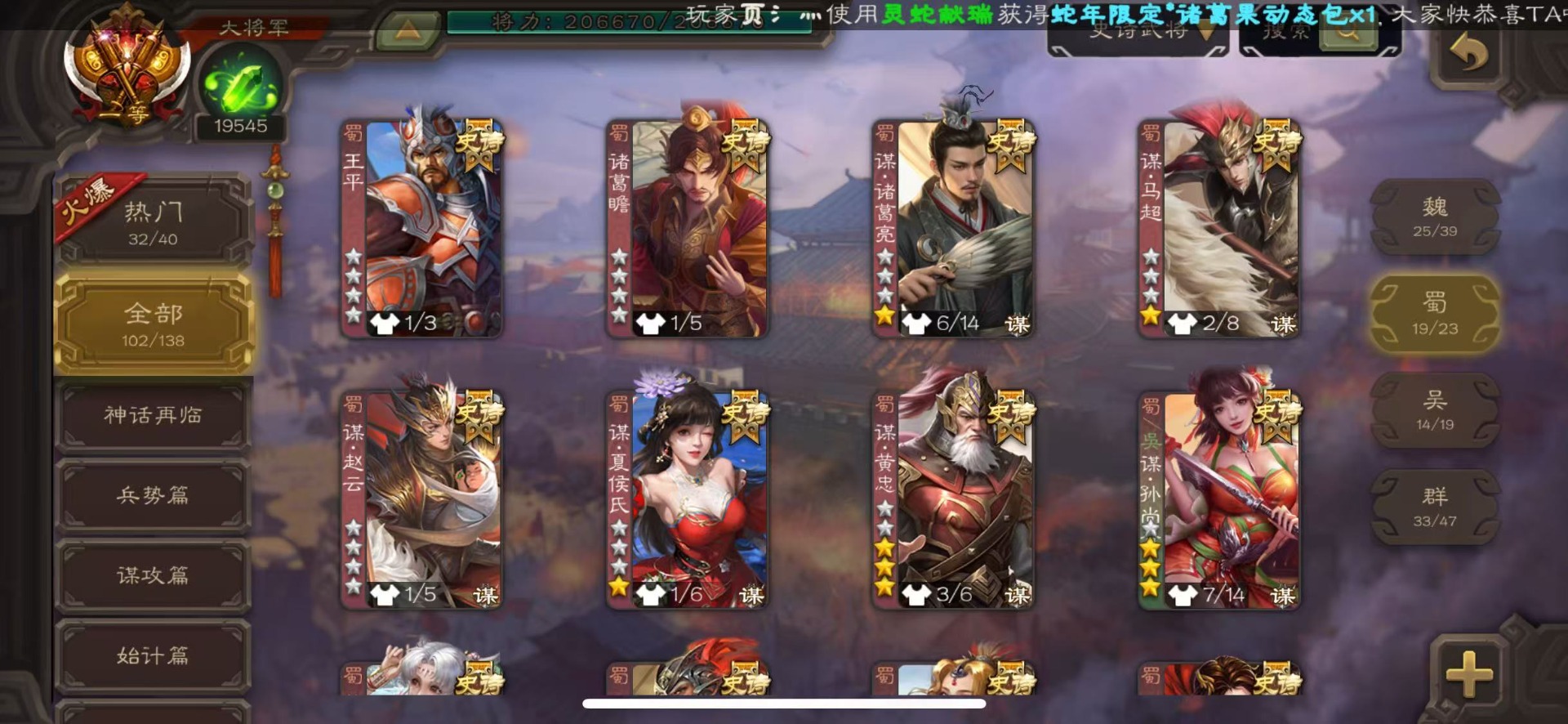 [16367808]vip16 大将军 496武将 87动态皮肤 102史诗武将 32宝珠 【神将】神曹操神吕布神赵云神陆逊神刘备神甘宁神张辽神郭嘉神太史慈神孙策神荀彧神华佗神鲁肃 【魏国武将】sp司马昭曹髦星周不疑谋曹仁王粲谋曹操杨修羊徽瑜文鸯王元姬王凌王朗魏-司马昭马钧界钟会界于禁界曹真嵇康郝昭程昱陈琳曹婴曹纯戏志才刘晔 【蜀国武将】谋诸葛亮马云騄蜀-谋孙尚香谋黄忠谋夏侯氏谋赵云谋马超诸葛瞻周群赵襄张星彩王平沙摩柯谯周傅佥界黄忠花鬘关索董允 【吴国武将】谋陆逊张奋文鸯吴-谋孙尚香周处吴景孙皓孙寒华骆统留赞界朱然界徐盛界步练师贺齐 【群国武将】友诸葛亮群-司马昭十常侍裴秀皇甫嵩左慈郑玄张让张琪瑛杨彪徐荣星黄忠星甘宁兀突骨王允陶谦苏飞司马徽士燮审配麹义庞德公南华老仙祢衡刘焉沮授界左慈界李儒公孙康杜预陈登卑弥呼许攸