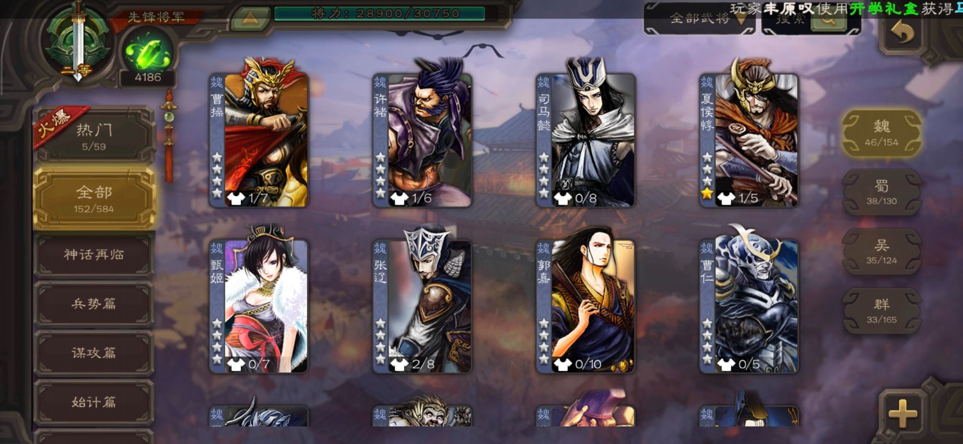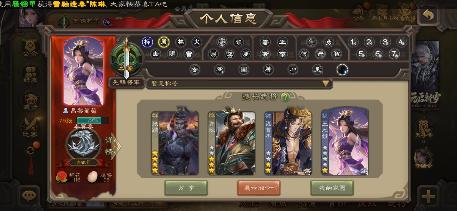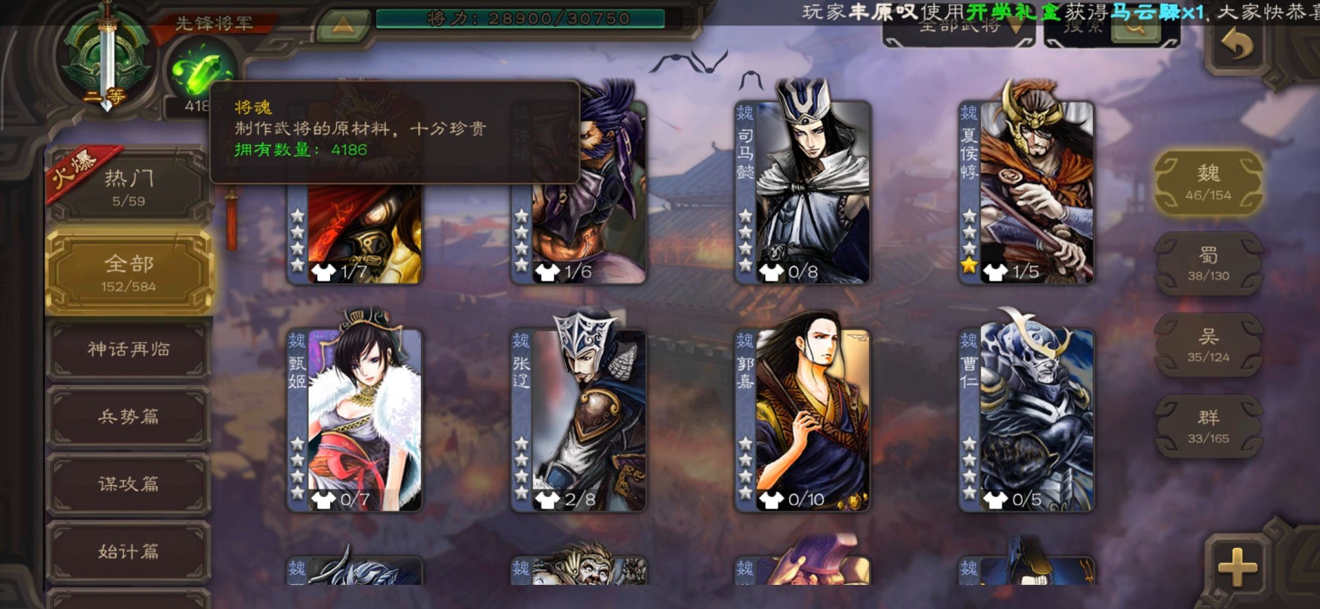 [16368151]vip4 先锋将军 152武将 5动态皮肤 3史诗武将 【魏国武将】王元姬谋曹丕甄姬司马懿许褚夏侯惇郭嘉曹仁曹操张辽 【群国武将】许攸
