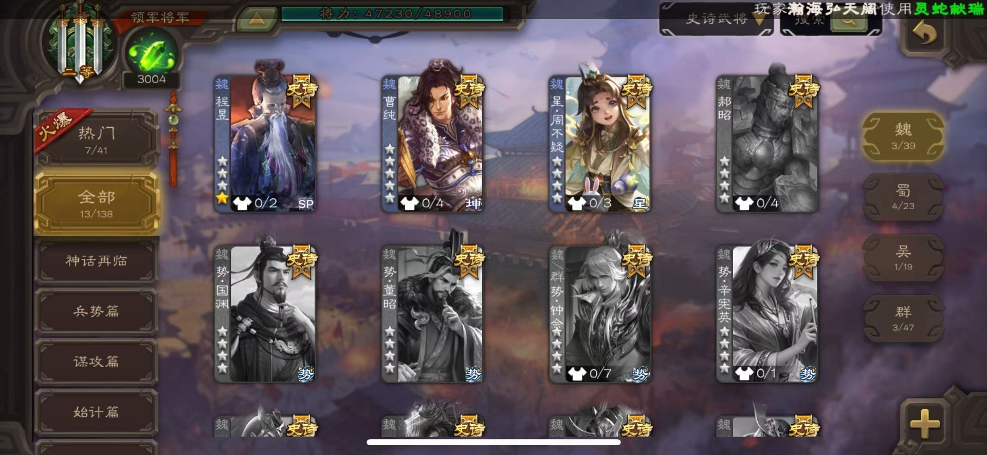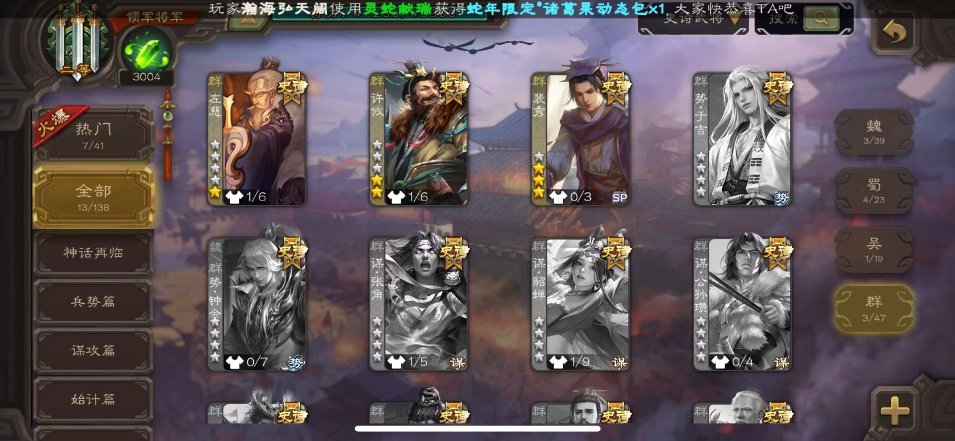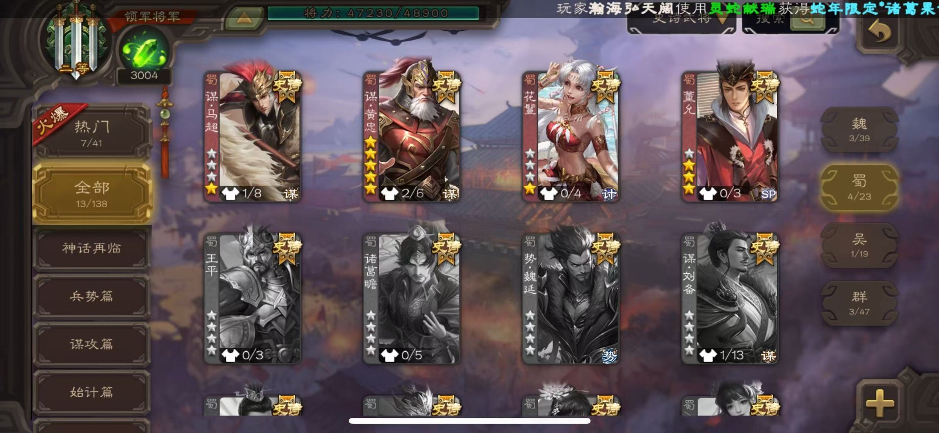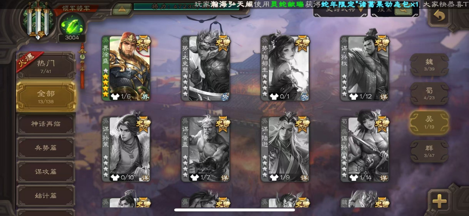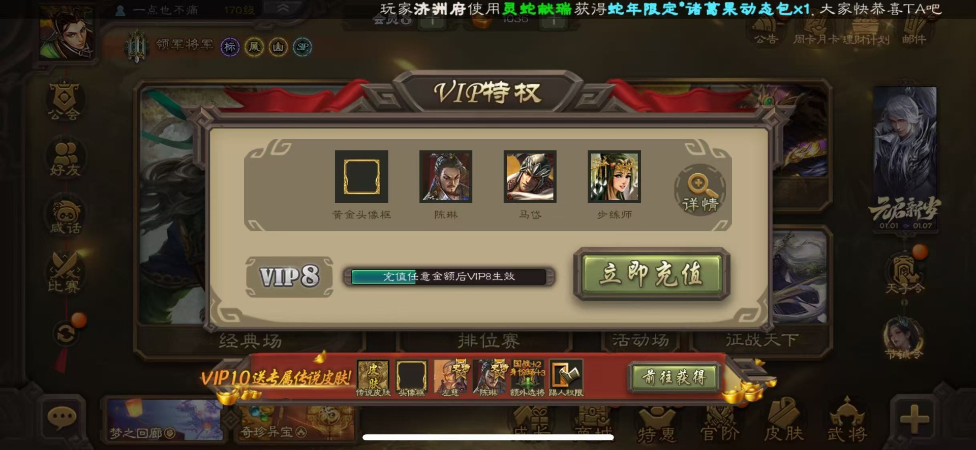 [16386020]vip8 领军将军 203武将 6动态皮肤 13史诗武将 【神将】神吕布神赵云 【魏国武将】星周不疑程昱曹纯 【蜀国武将】谋黄忠谋马超花鬘董允 【吴国武将】界徐盛 【群国武将】裴秀左慈许攸