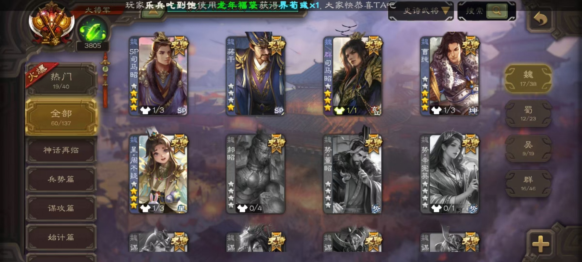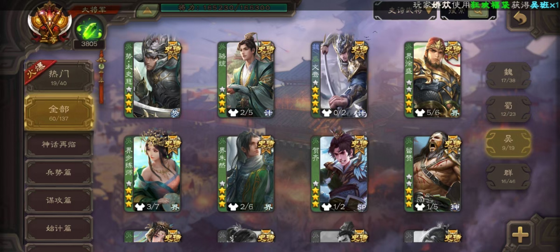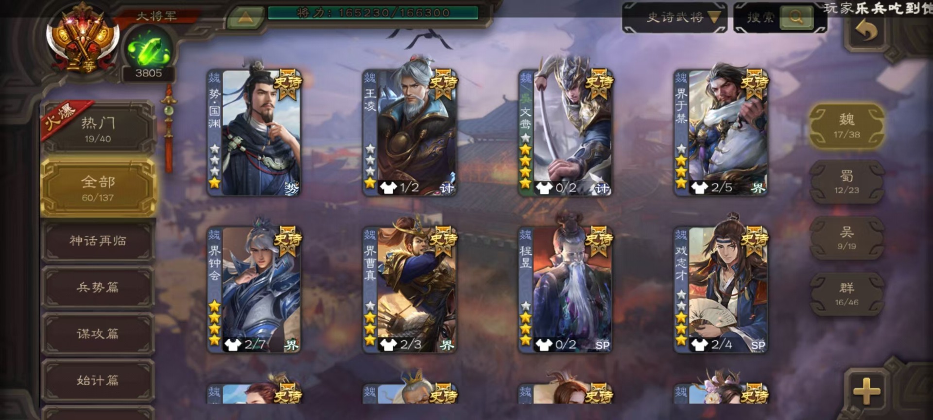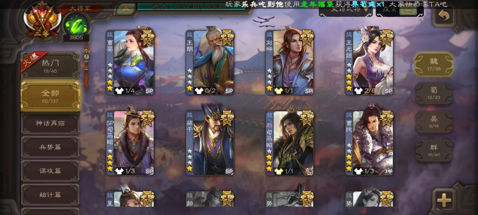 [16417833]vip9 大将军 427武将 69动态皮肤 60史诗武将 51宝珠 【神将】神吕布神赵云神司马懿神陆逊神张辽神郭嘉神太史慈神孙策 【魏国武将】sp司马昭星周不疑王元姬王朗魏-司马昭曹婴曹纯刘晔蒋干 【蜀国武将】马云騄谋赵云谋马超诸葛瞻赵襄张星彩王平沙摩柯谯周界黄忠花鬘董允 【吴国武将】势太史慈文鸯孙寒华骆统留赞界朱然界徐盛界步练师贺齐 【群国武将】星董卓群-司马昭裴秀左慈张让星黄忠星甘宁兀突骨苏飞麹义南华老仙沮授界李儒公孙康谋张角许攸