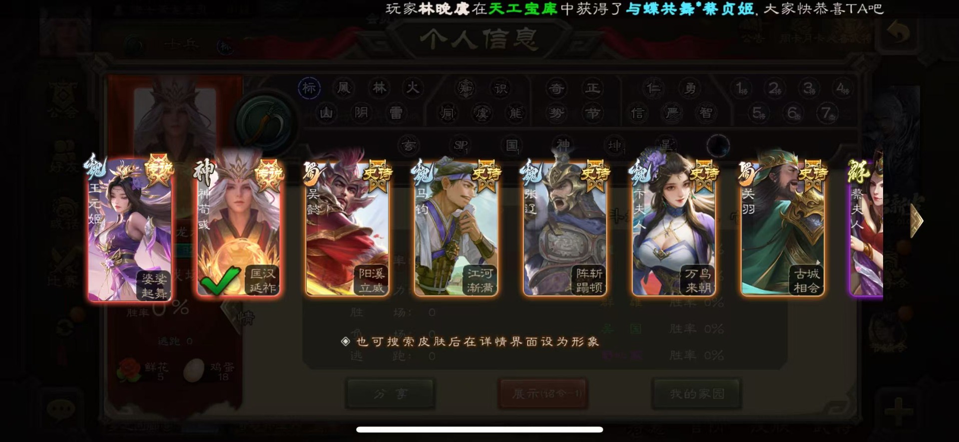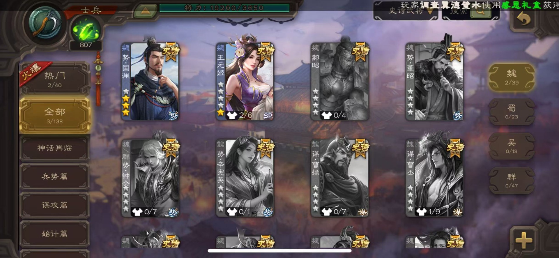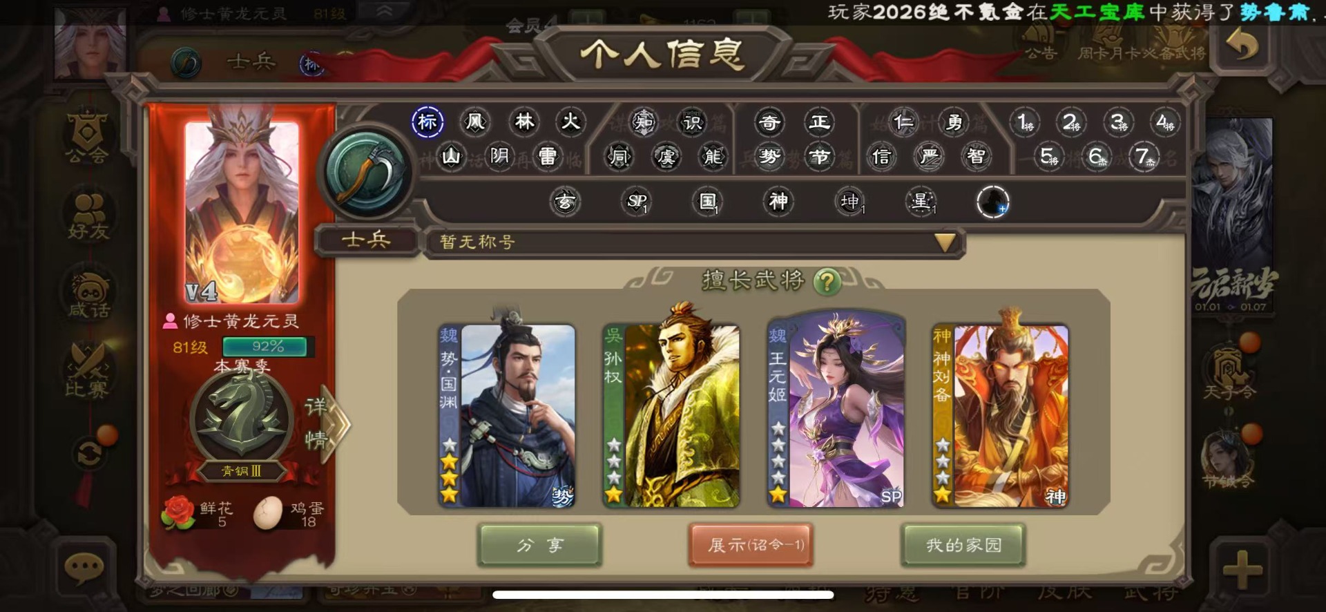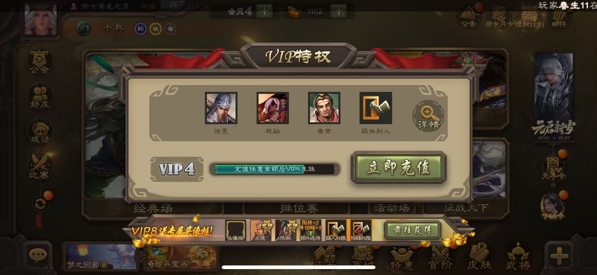 [16418263]vip4 士兵 86武将 2动态皮肤 3史诗武将 【神将】神刘备 【魏国武将】势国渊王元姬
