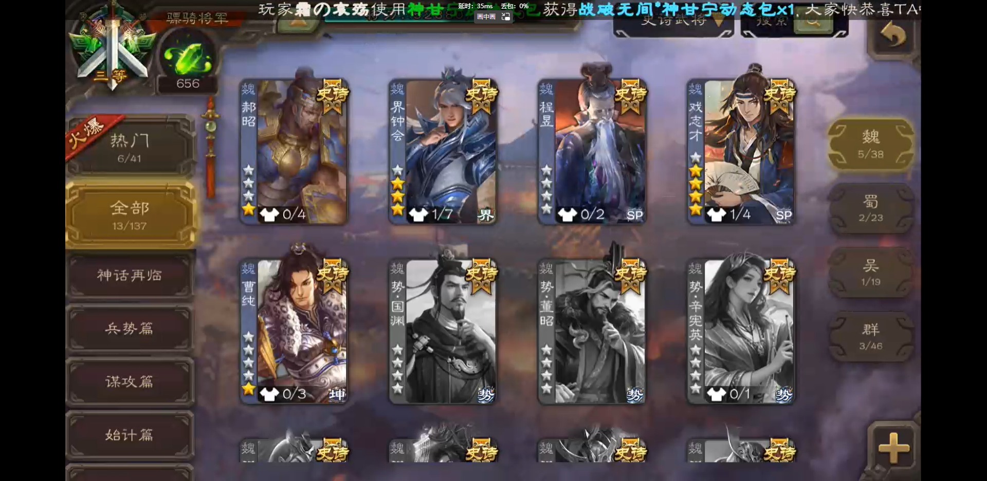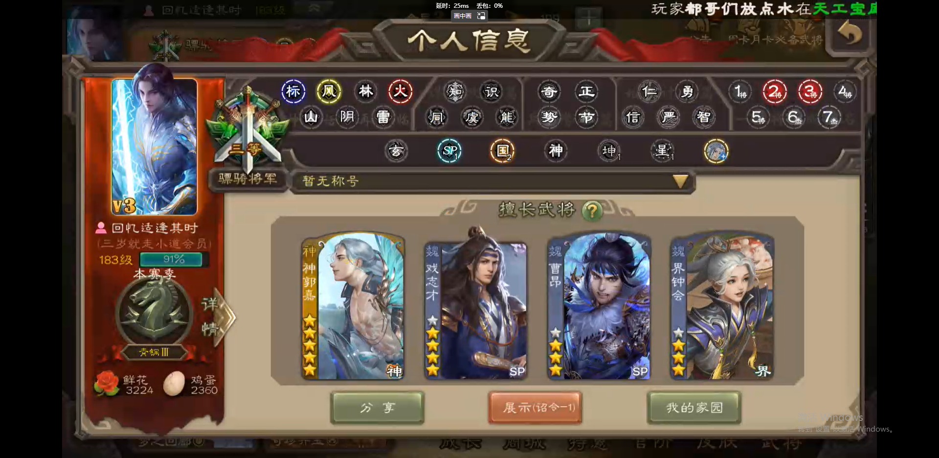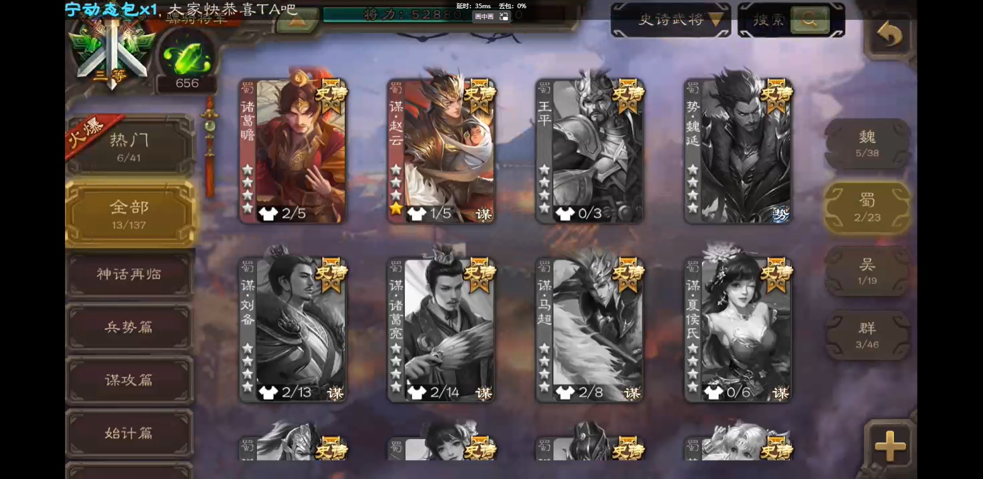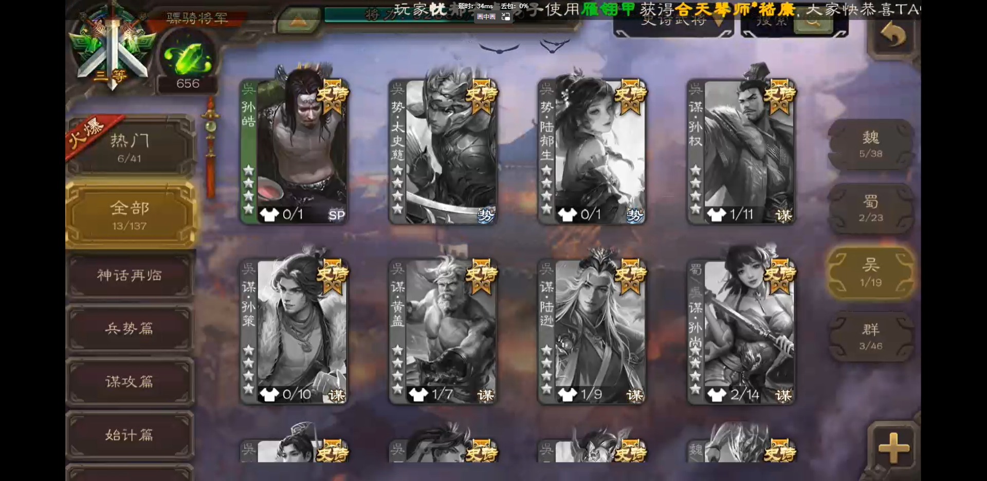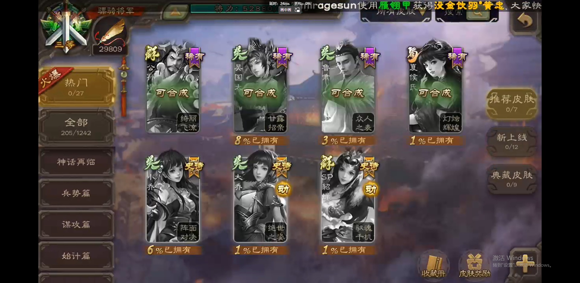 [16418797]vip3 骠骑将军 243武将 9动态皮肤 13史诗武将 【神将】:神吕布神郭嘉 【魏国武将】:界钟会郝昭程昱曹纯戏志才 【蜀国武将】:谋赵云诸葛瞻 【吴国武将】:孙皓 【群国武将】:星董卓左慈兀突骨