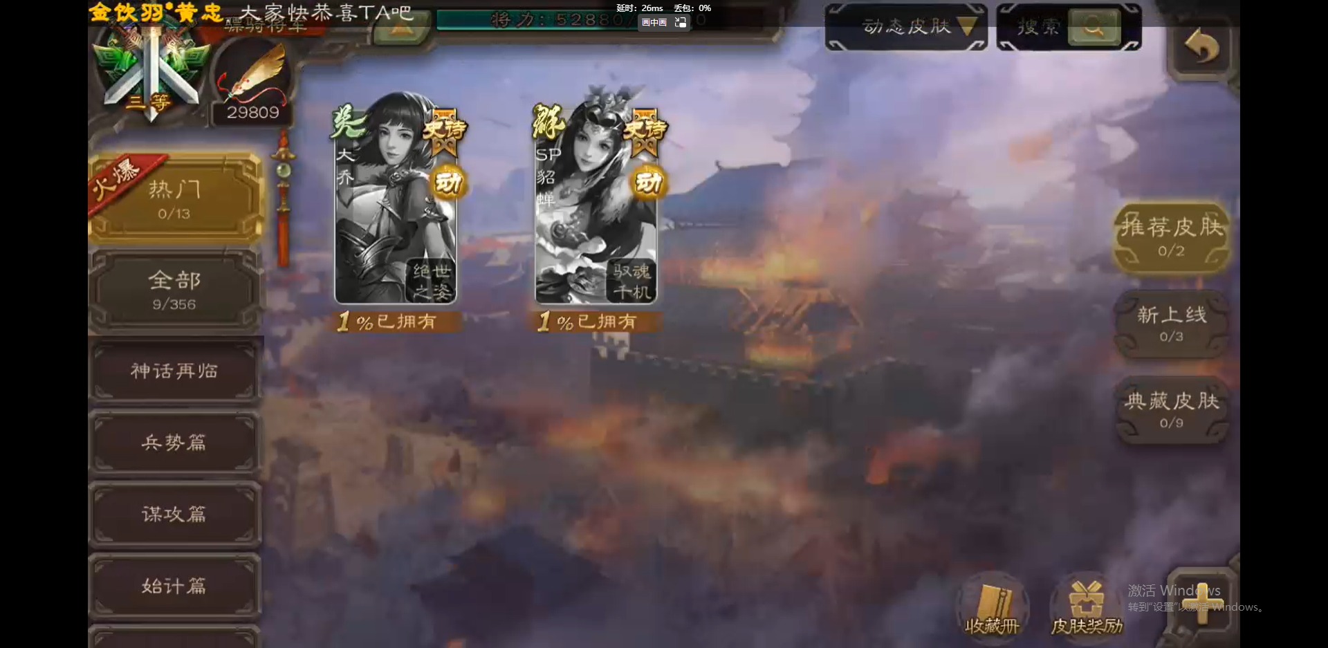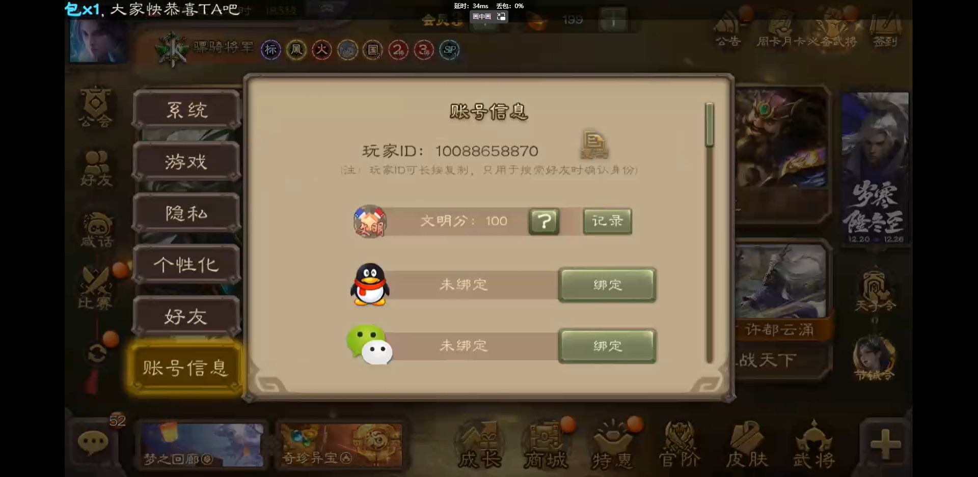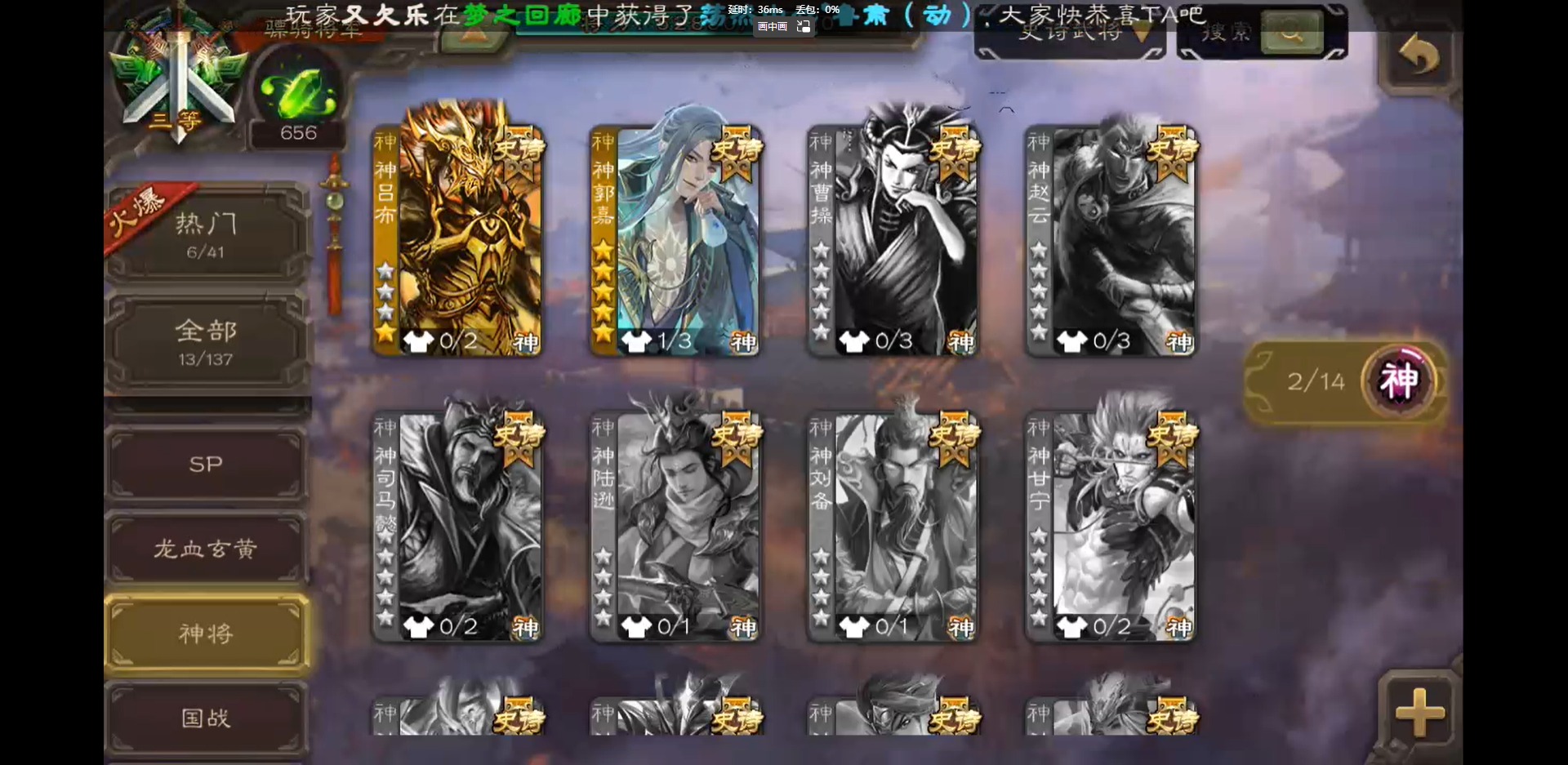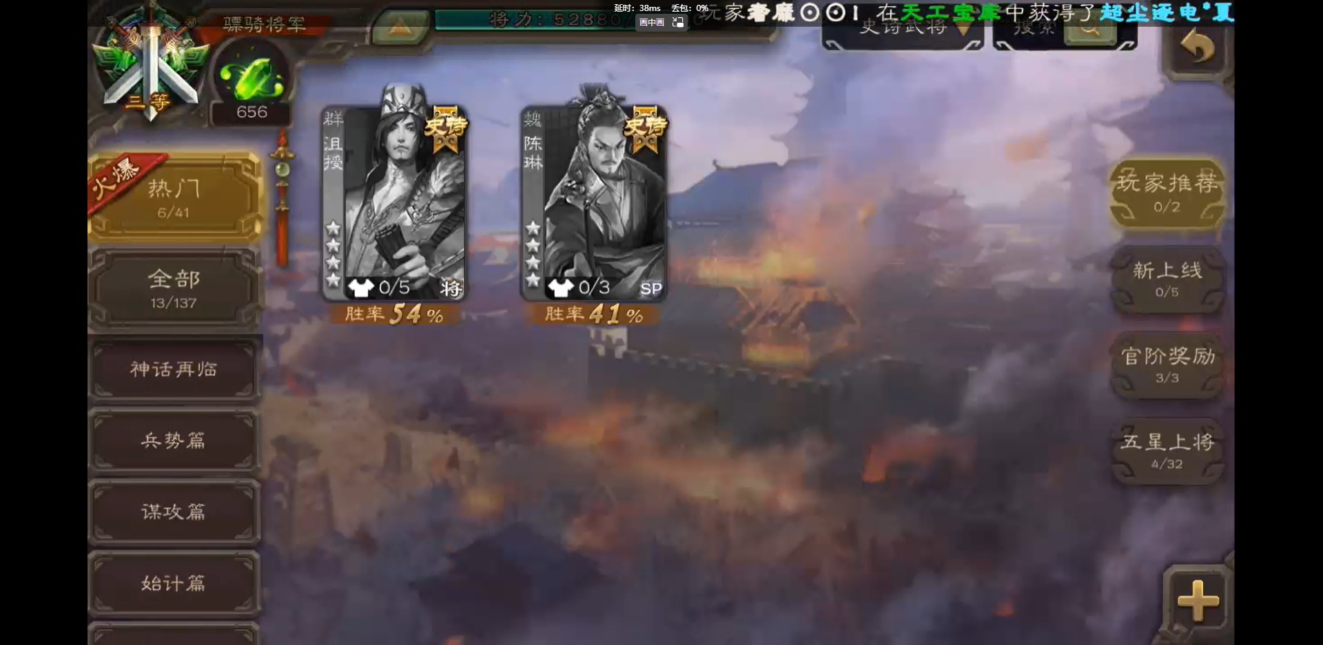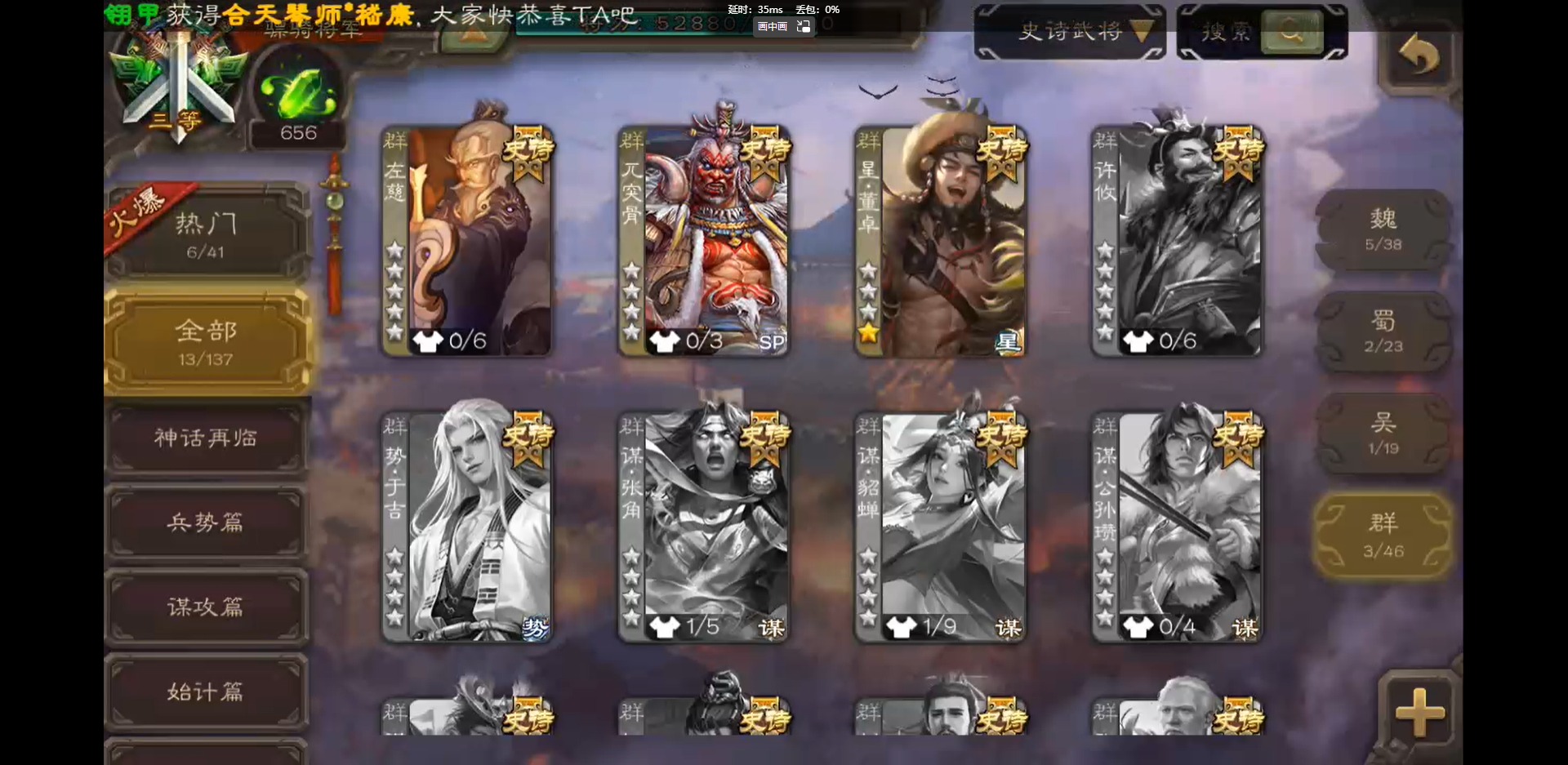 [16418797]vip3 骠骑将军 243武将 9动态皮肤 13史诗武将 【神将】:神吕布神郭嘉 【魏国武将】:界钟会郝昭程昱曹纯戏志才 【蜀国武将】:谋赵云诸葛瞻 【吴国武将】:孙皓 【群国武将】:星董卓左慈兀突骨