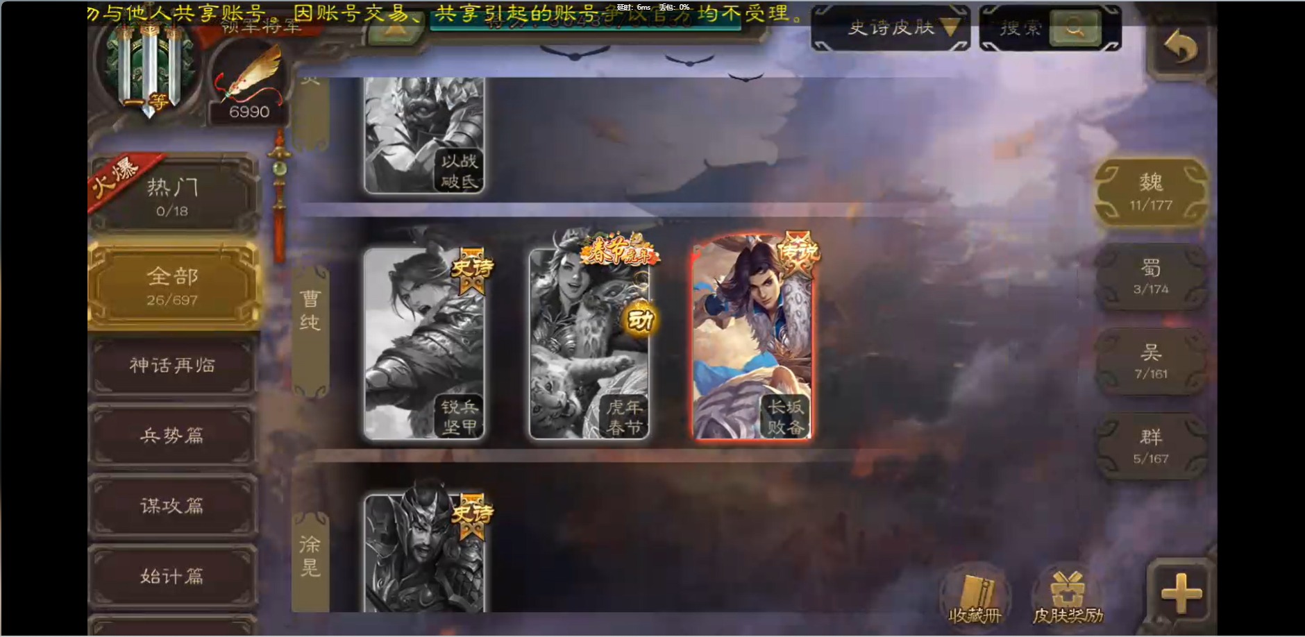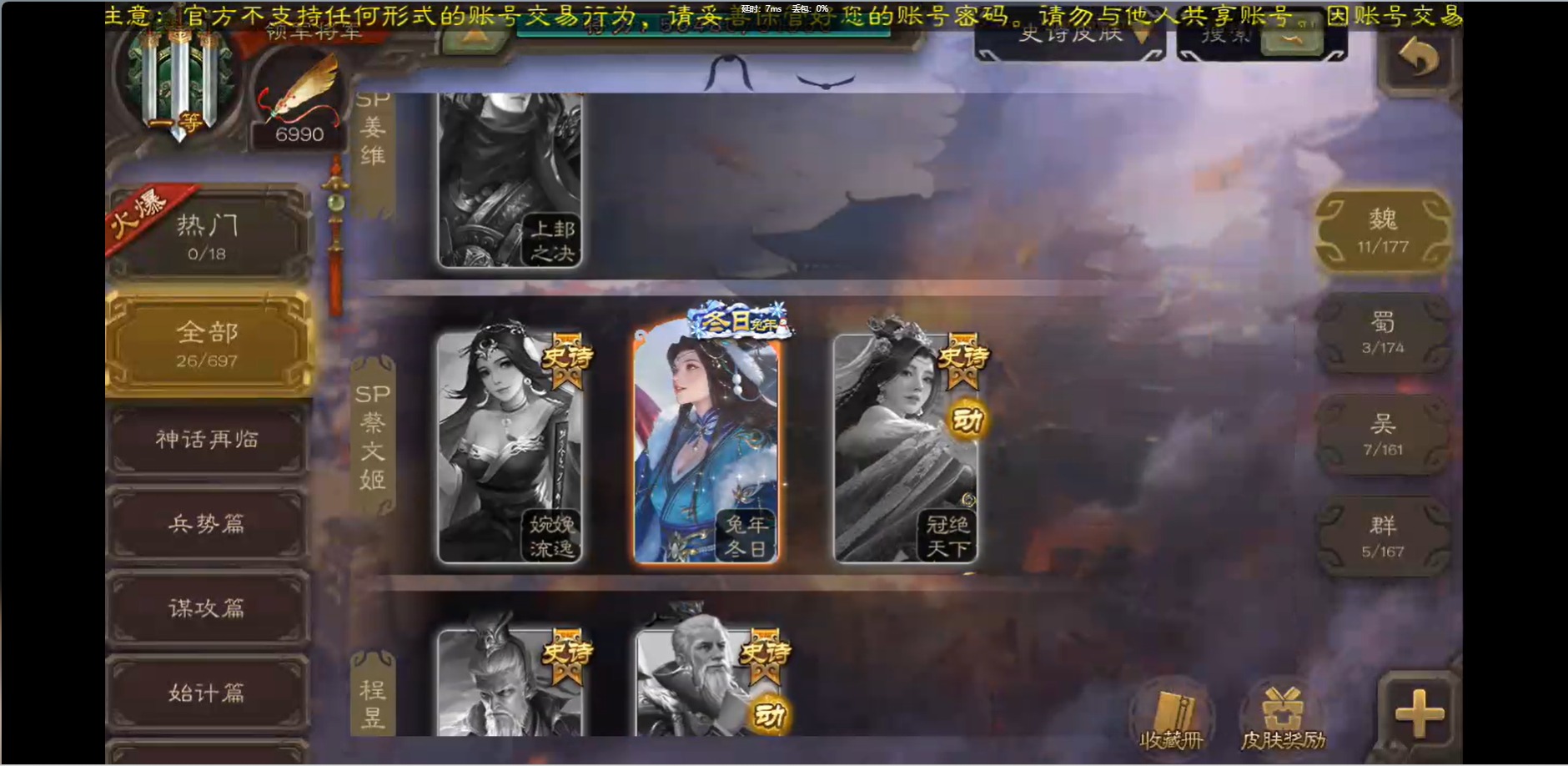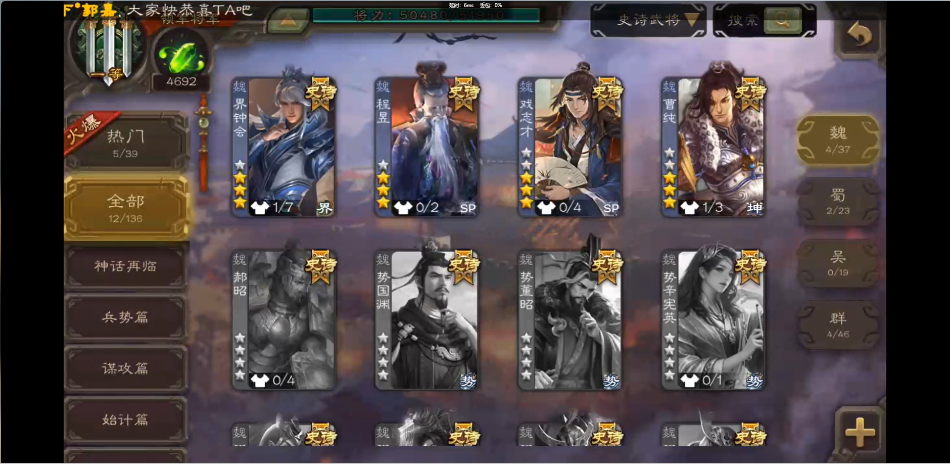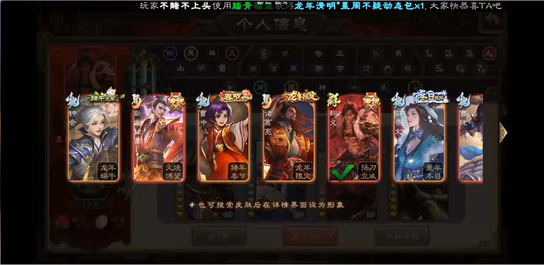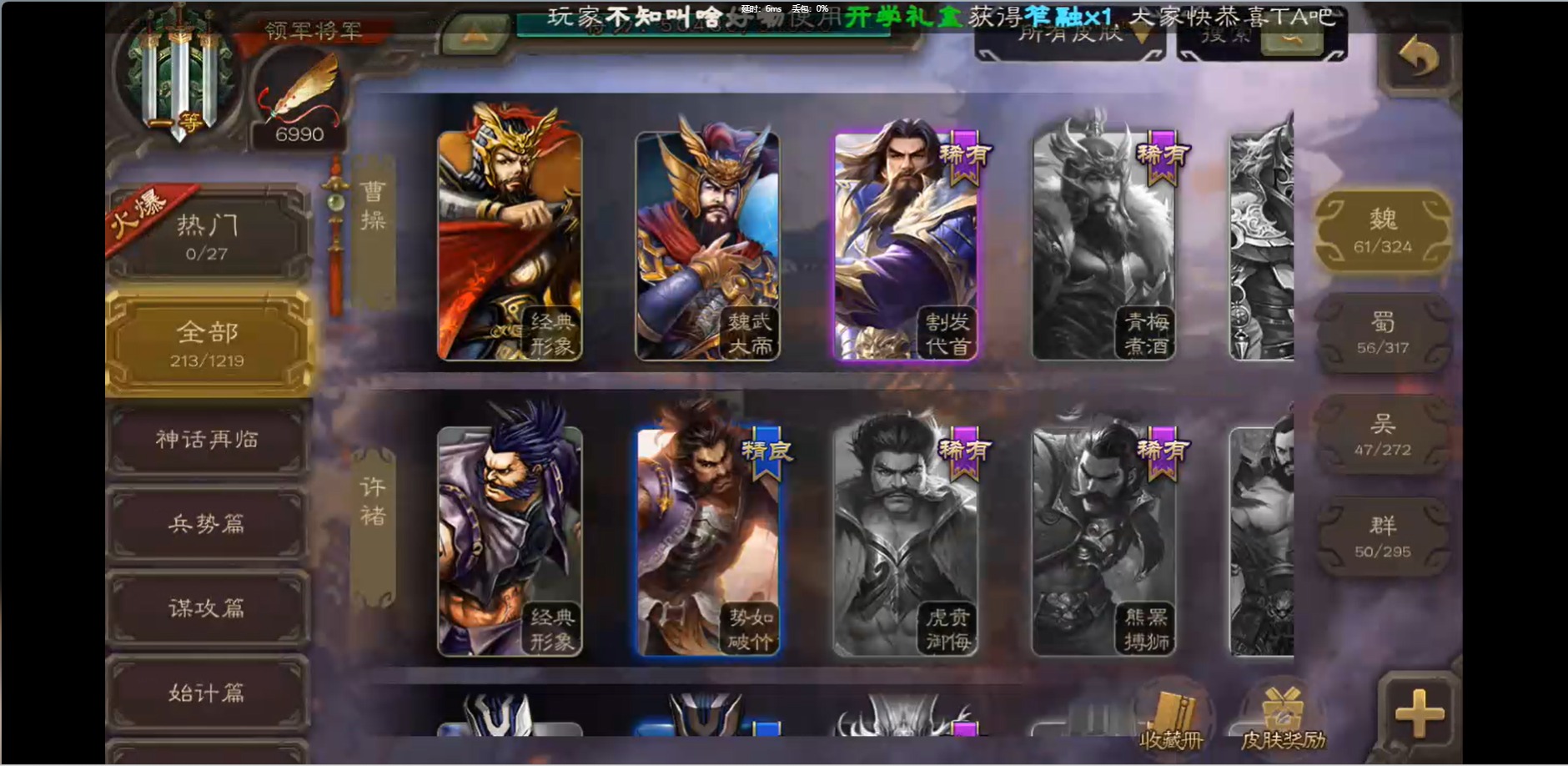[16426275]vip1 领军将军 214武将 10动态皮肤 12史诗武将 38宝珠 【魏国武将】:界钟会程昱曹纯戏志才甄姬司马懿许褚夏侯惇郭嘉曹仁曹操张辽 【蜀国武将】:花鬘董允 【群国武将】:麹义刘焉沮授界李儒