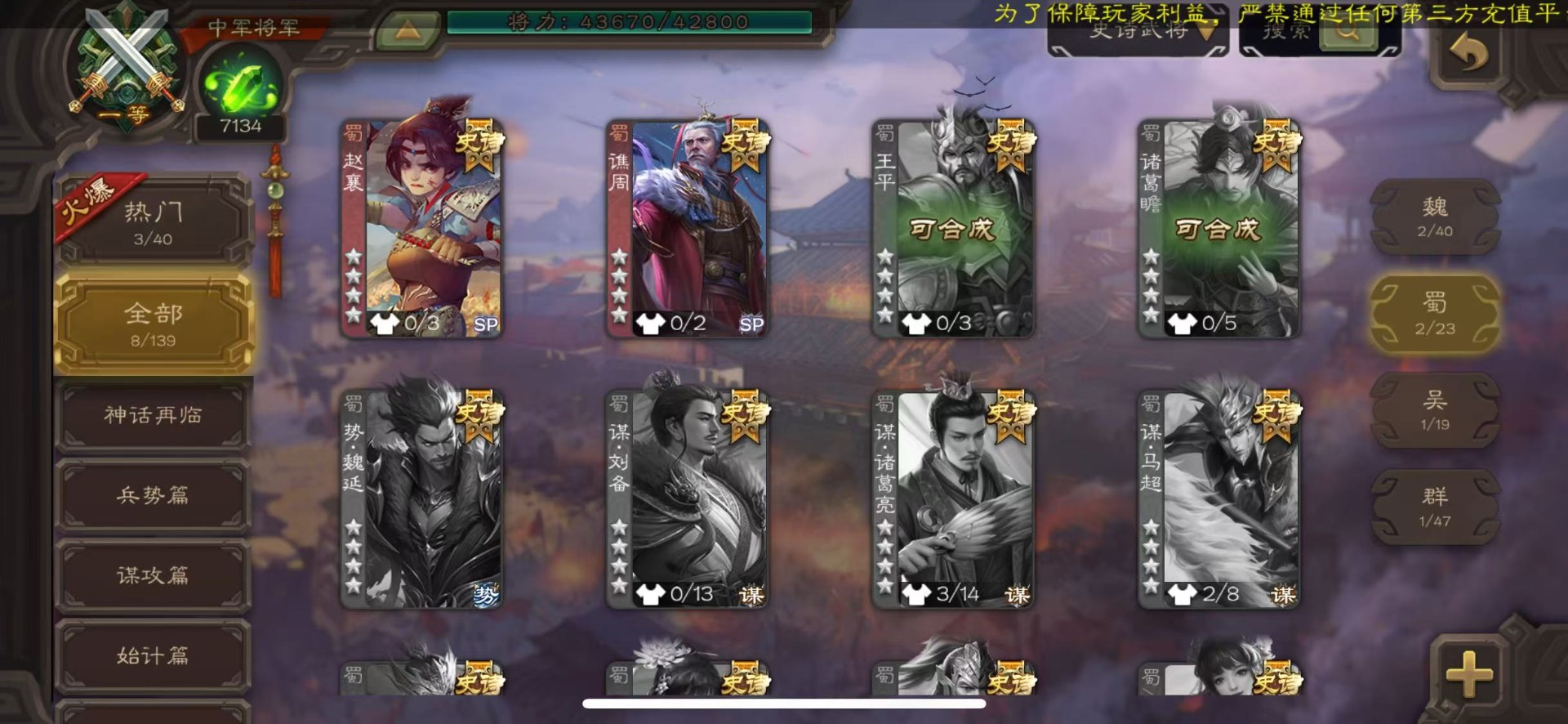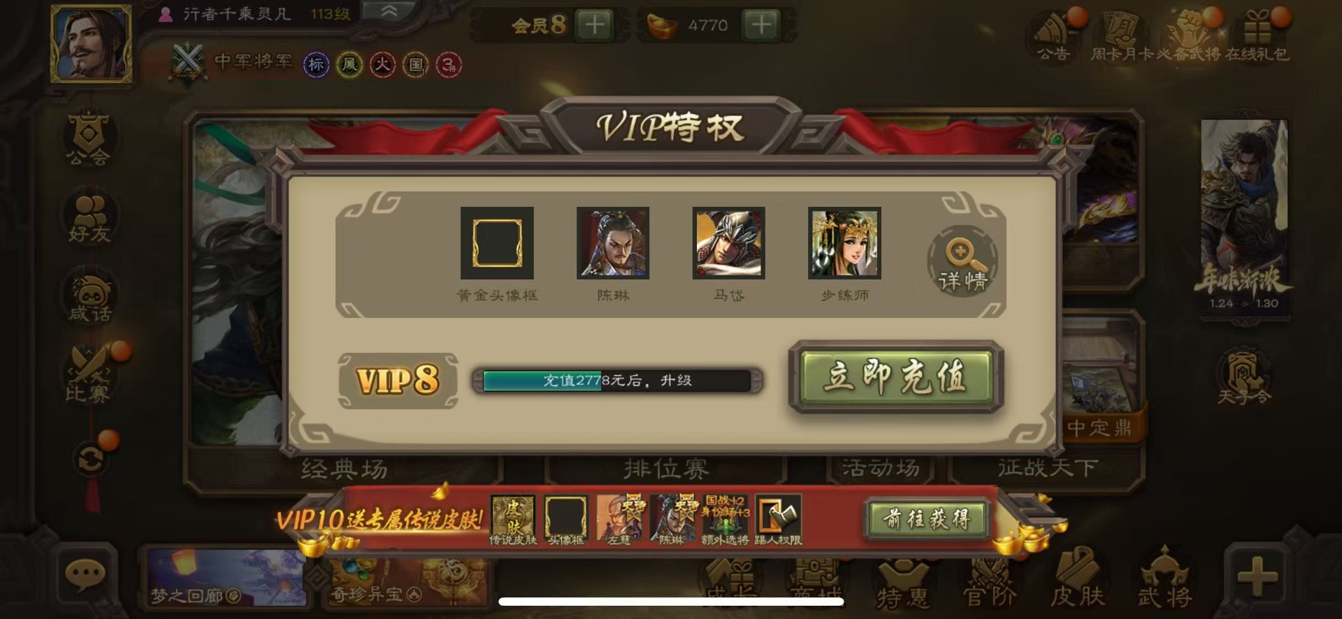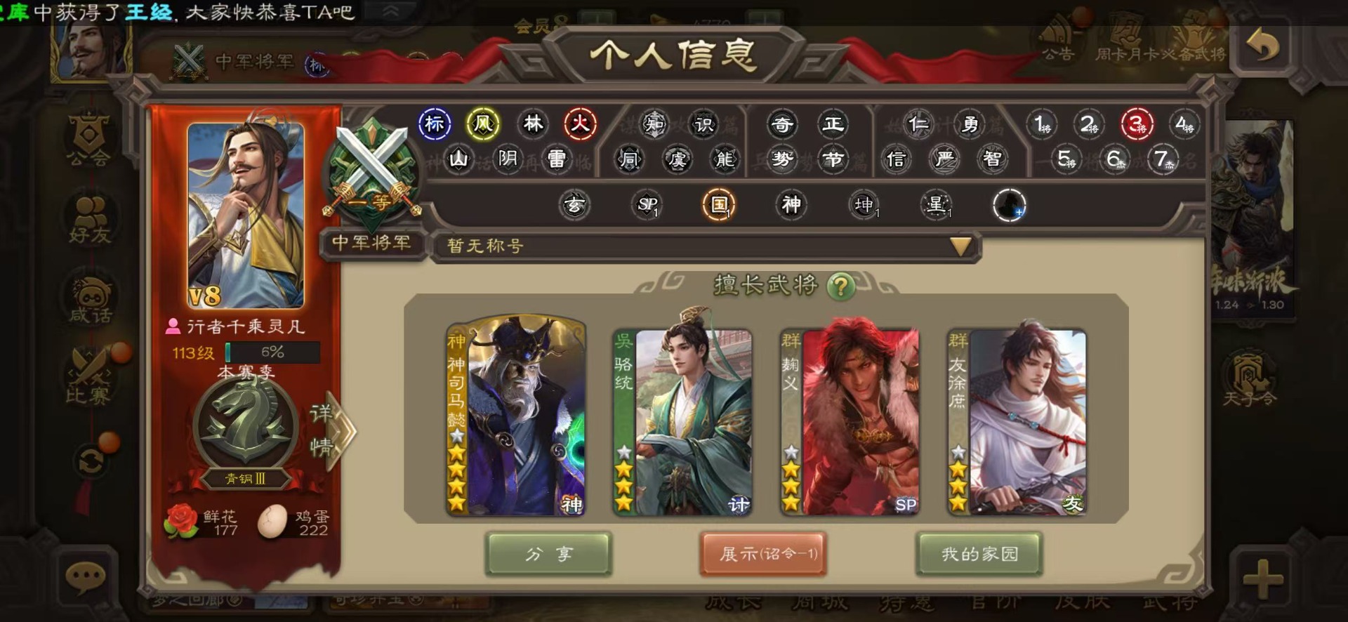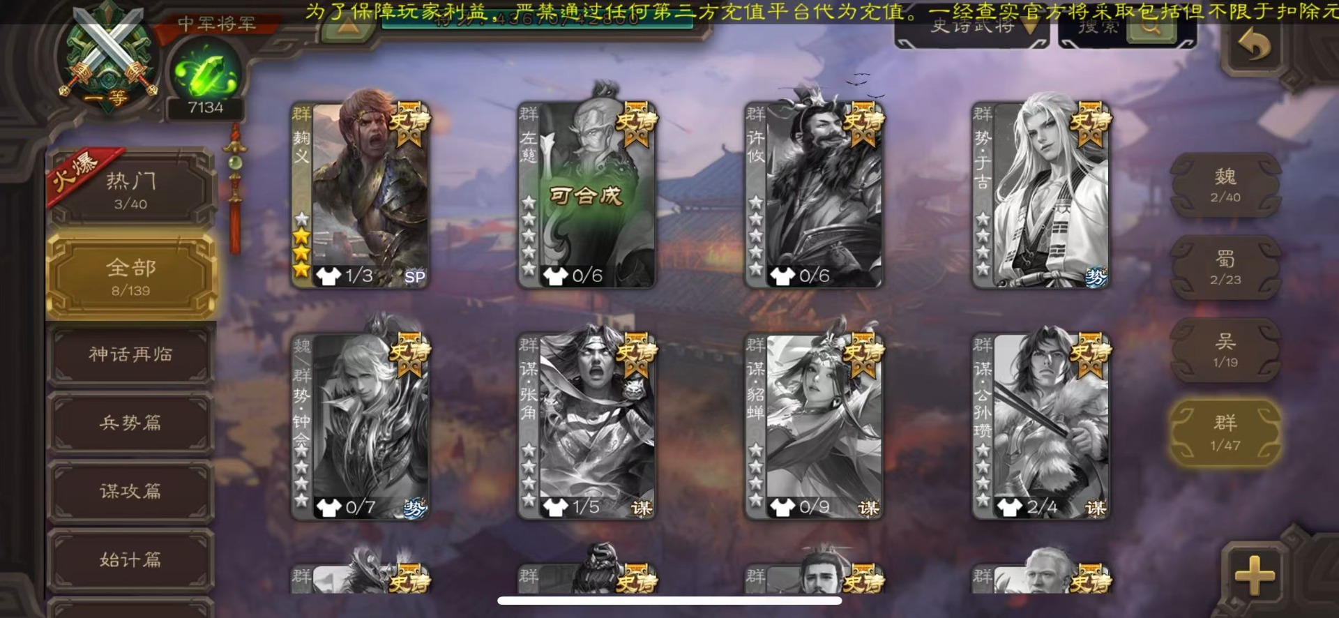 [16435947]vip8 中军将军 193武将 7动态皮肤 8史诗武将 【神将】神司马懿神太史慈 【魏国武将】王经司马伷王元姬张春华徐晃钟会界张辽崔琰界郭嘉钟繇鲁芝曹嵩曹昂邓艾夏侯渊谋荀彧典韦甄姬许褚夏侯惇荀彧郭嘉荀攸曹仁张辽 【蜀国武将】势陈袛甘夫人界马超关平sp孙尚香界赵云界法正糜竺刘封界刘备张松界关羽刘备庞统刘禅关羽黄月英 【吴国武将】朱桓势鲁肃孙权界甘宁鲁肃界黄盖蒋钦谋周瑜界孙尚香孙策黄盖小乔孙坚太史慈孙尚香界全琮吕蒙 【群国武将】友徐庶贾充界吕布谋卢植陈宫sp赵云颜良文丑貂蝉张角庞德吕布