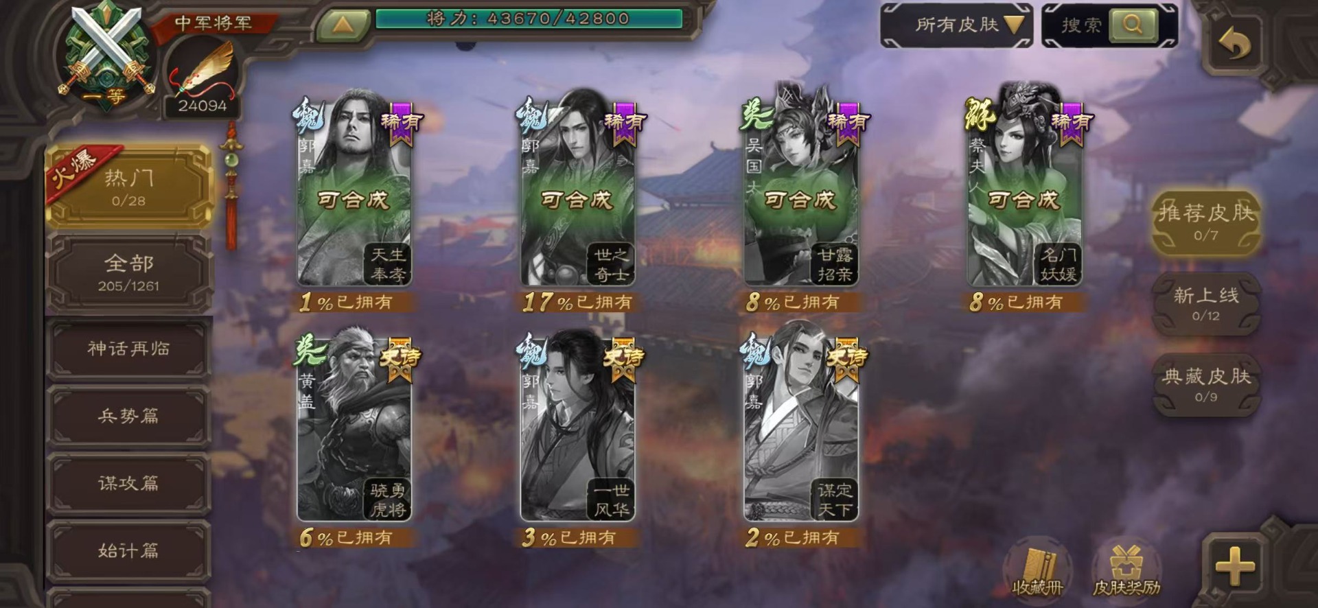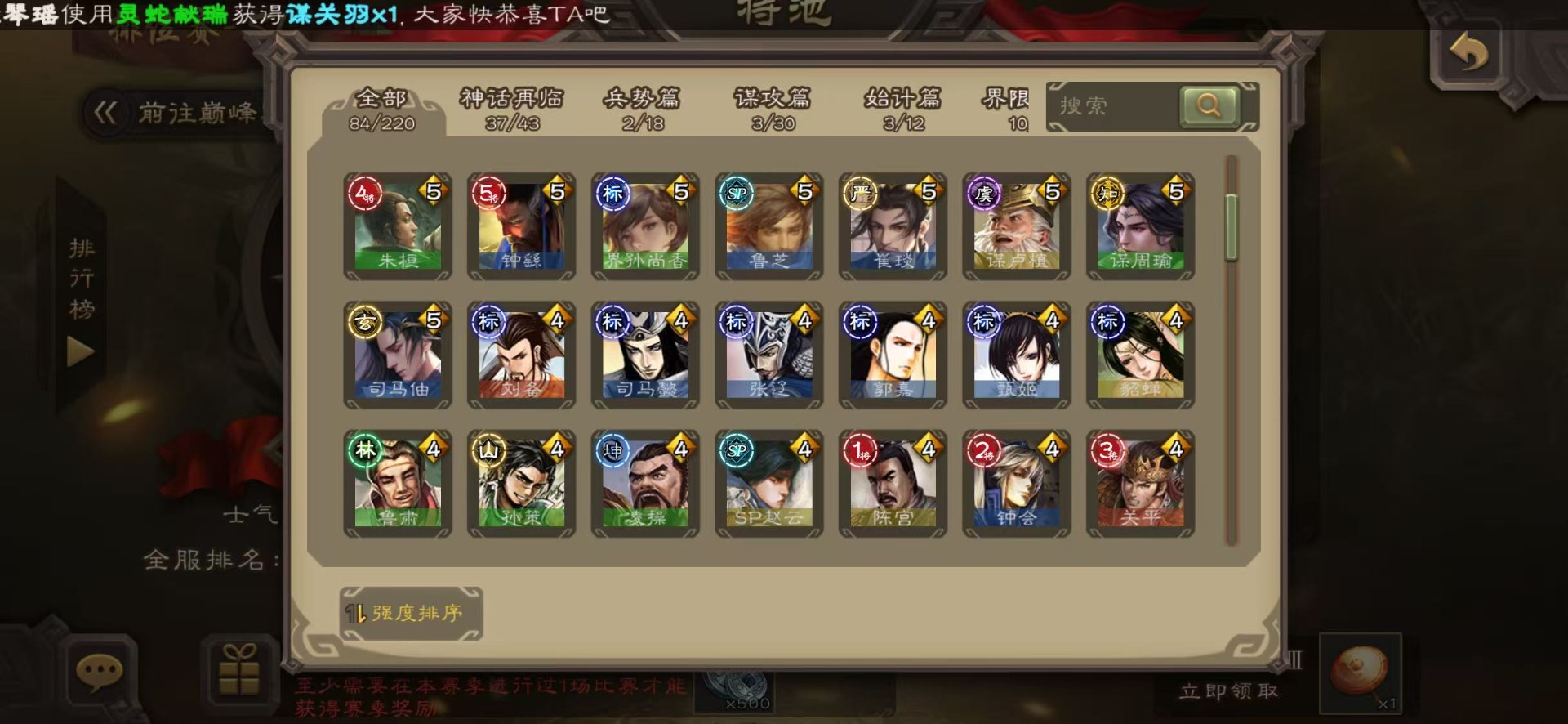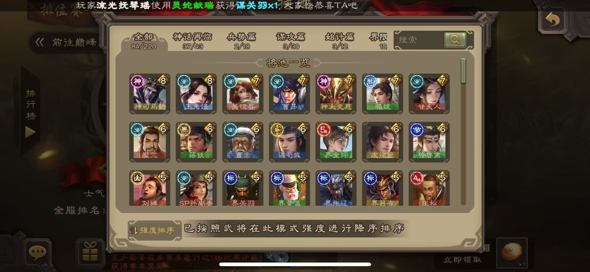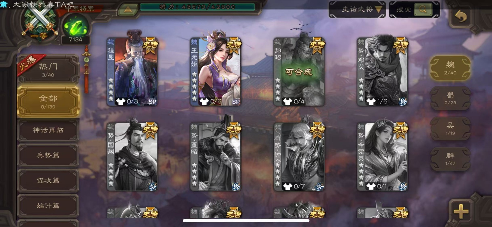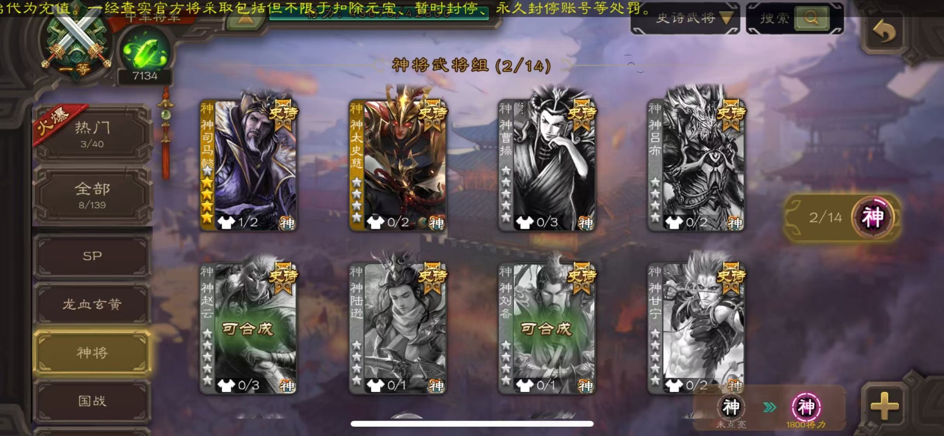 [16435947]vip8 中军将军 193武将 7动态皮肤 8史诗武将 【神将】神司马懿神太史慈 【魏国武将】王经司马伷王元姬张春华徐晃钟会界张辽崔琰界郭嘉钟繇鲁芝曹嵩曹昂邓艾夏侯渊谋荀彧典韦甄姬许褚夏侯惇荀彧郭嘉荀攸曹仁张辽 【蜀国武将】势陈袛甘夫人界马超关平sp孙尚香界赵云界法正糜竺刘封界刘备张松界关羽刘备庞统刘禅关羽黄月英 【吴国武将】朱桓势鲁肃孙权界甘宁鲁肃界黄盖蒋钦谋周瑜界孙尚香孙策黄盖小乔孙坚太史慈孙尚香界全琮吕蒙 【群国武将】友徐庶贾充界吕布谋卢植陈宫sp赵云颜良文丑貂蝉张角庞德吕布