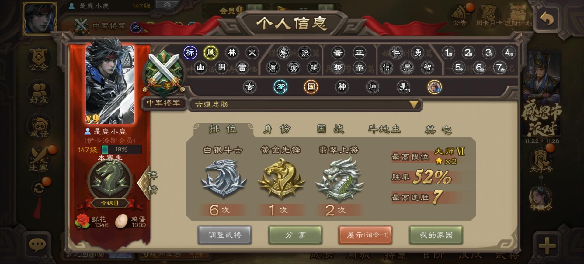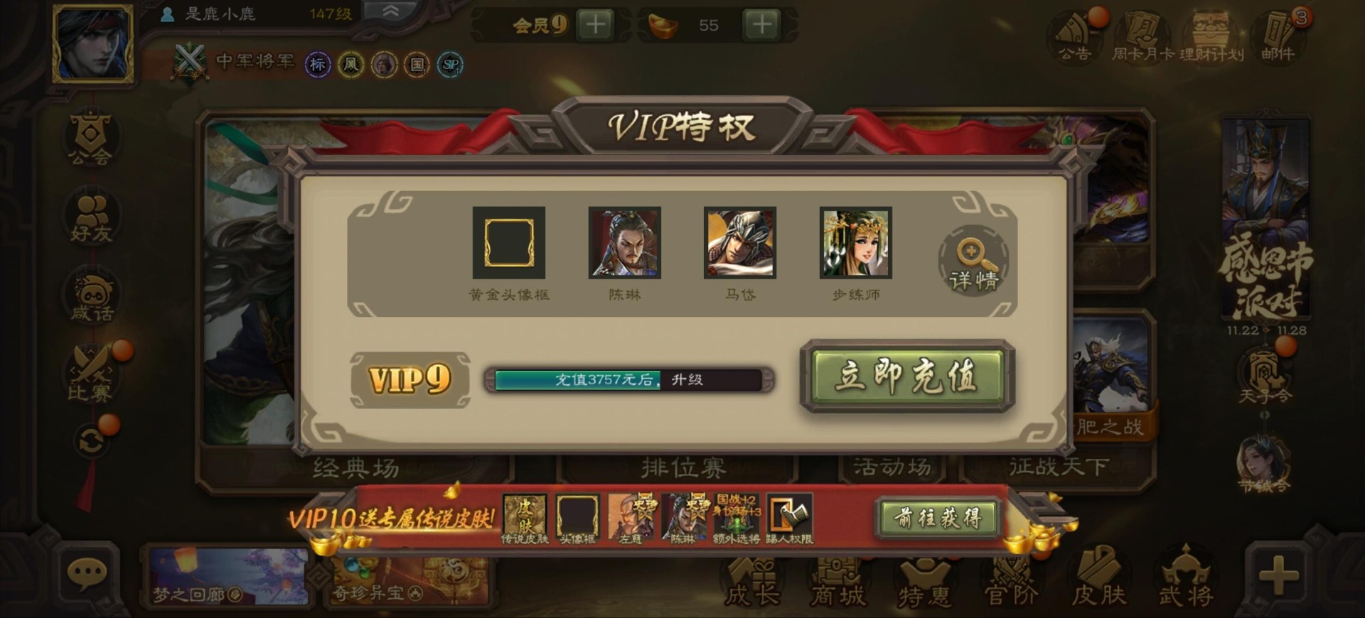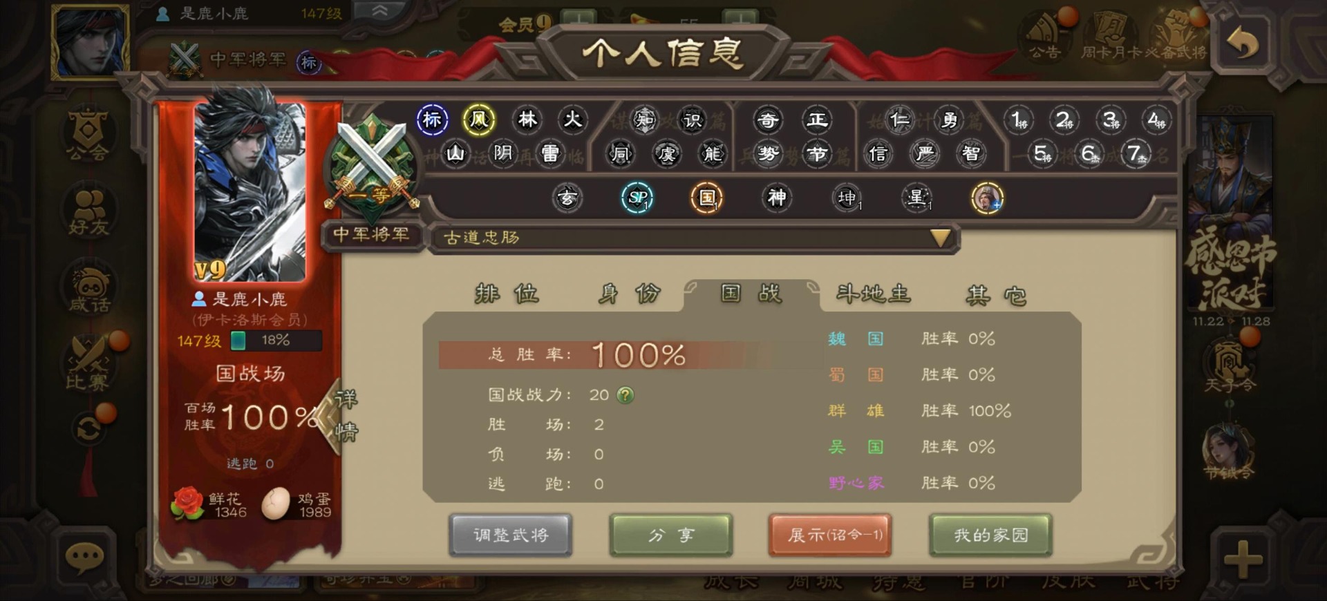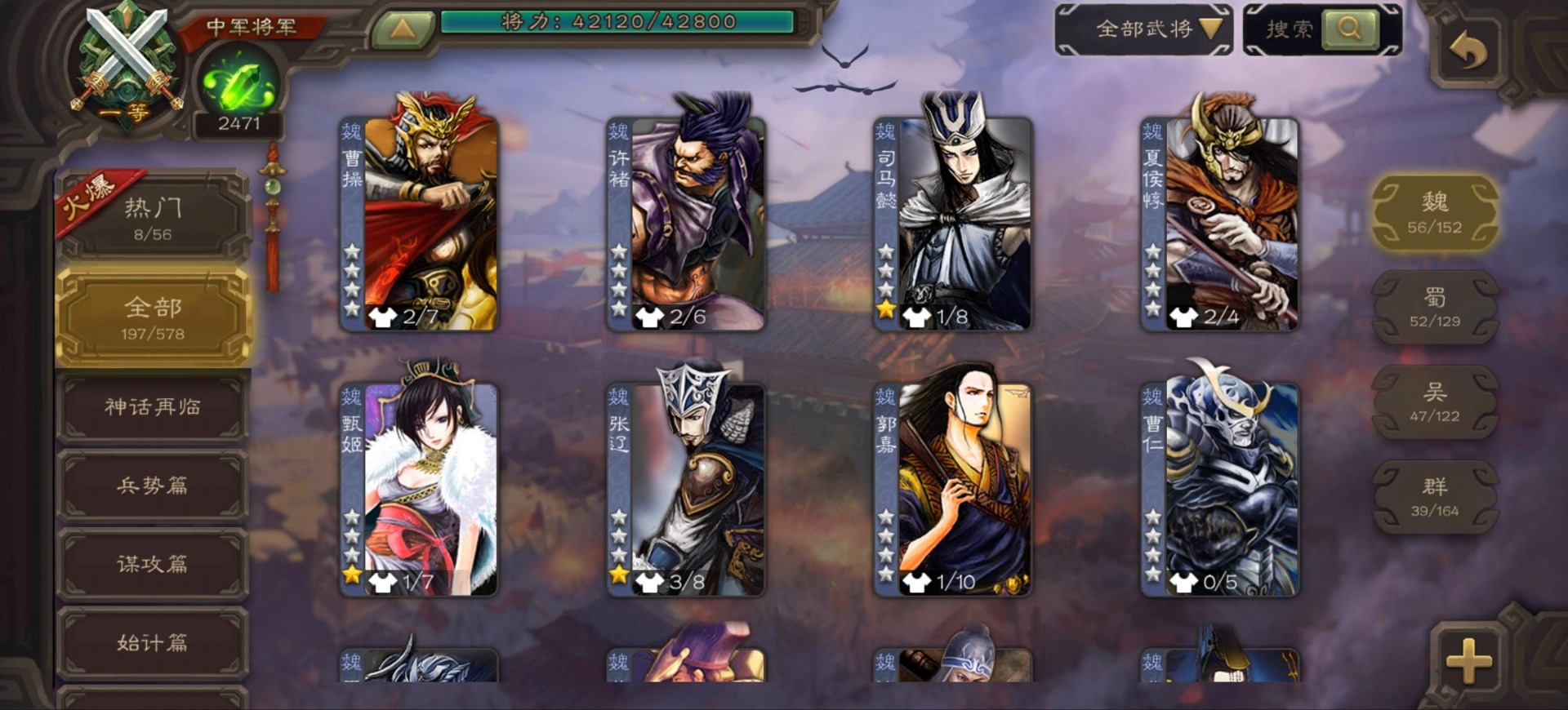 [16342723]vip9 中军将军 197武将 4动态皮肤 6史诗武将 【神将】:神司马懿神张辽 【魏国武将】:程昱甄姬司马懿许褚夏侯惇郭嘉曹仁曹操张辽 【蜀国武将】:谋赵云 【群国武将】:界沮授麹义