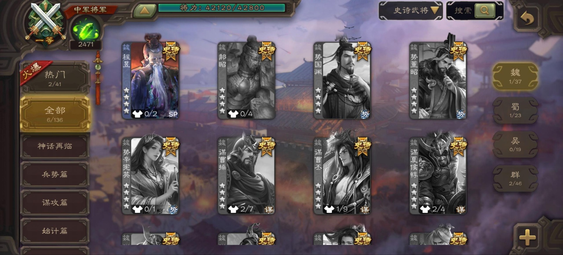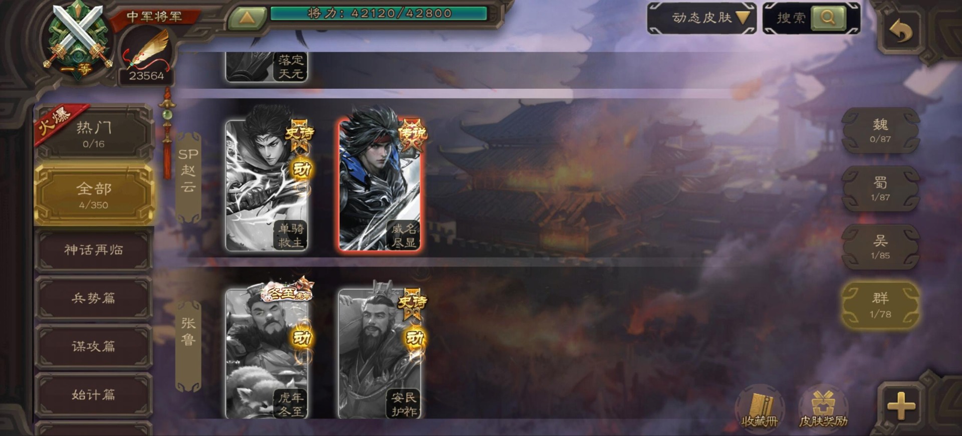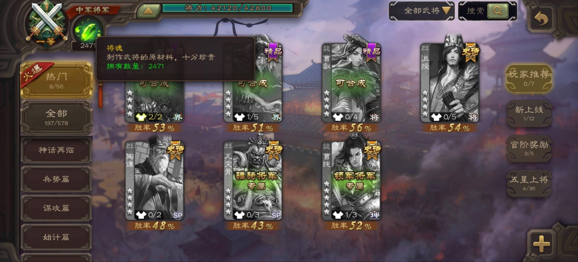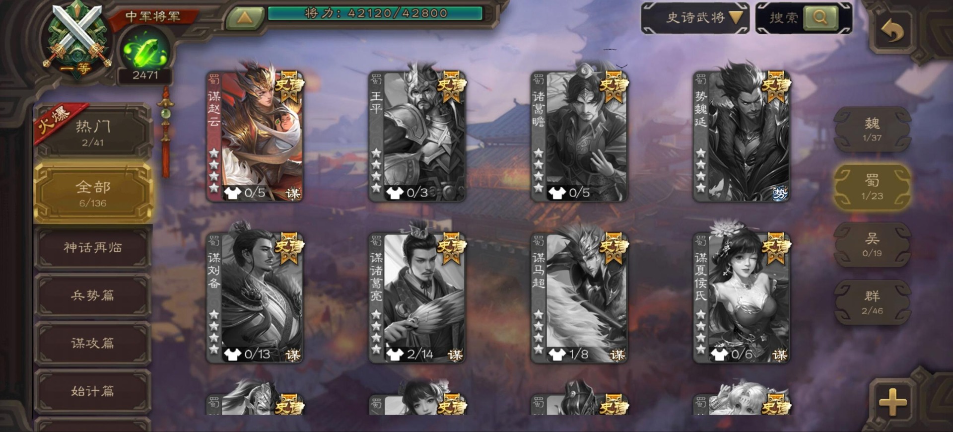 [16342723]vip9 中军将军 197武将 4动态皮肤 6史诗武将 【神将】:神司马懿神张辽 【魏国武将】:程昱甄姬司马懿许褚夏侯惇郭嘉曹仁曹操张辽 【蜀国武将】:谋赵云 【群国武将】:界沮授麹义