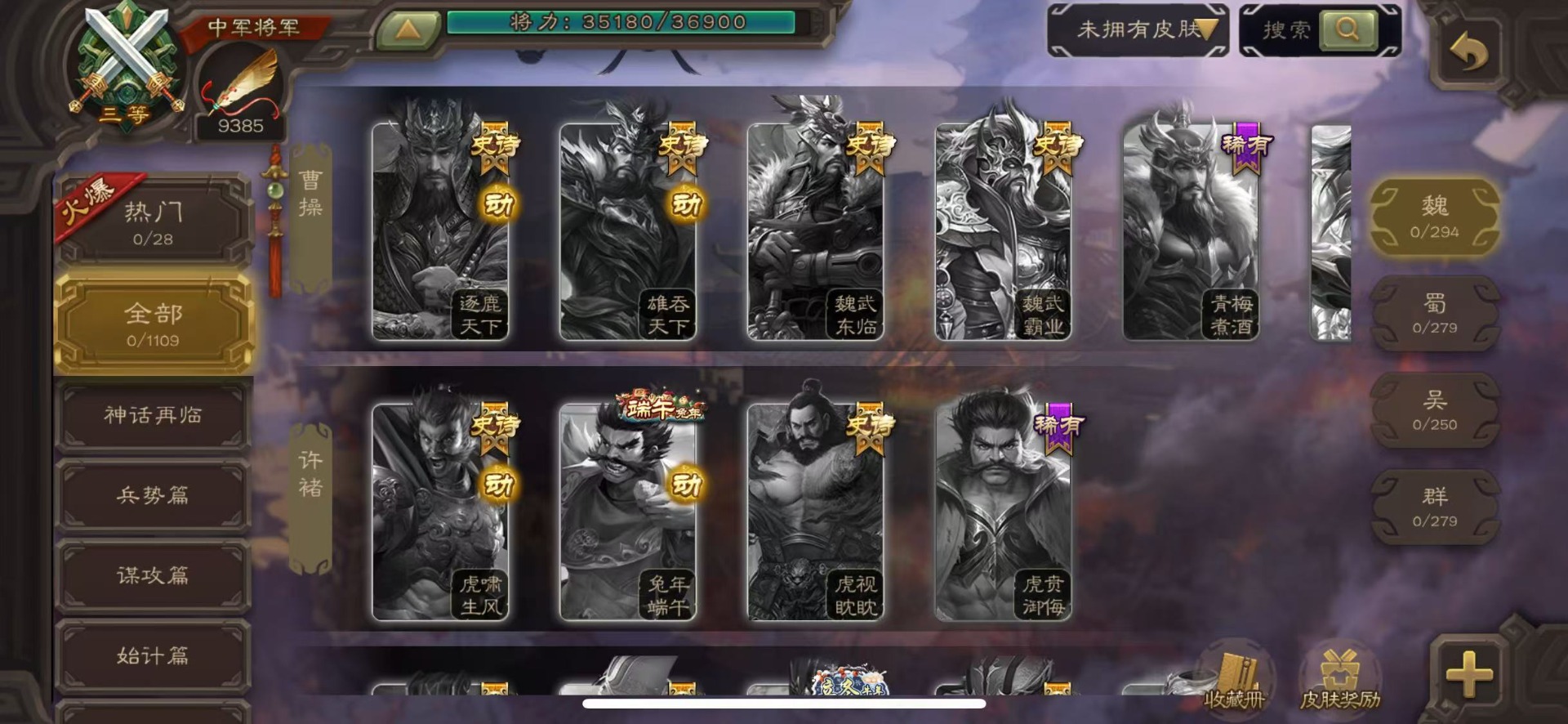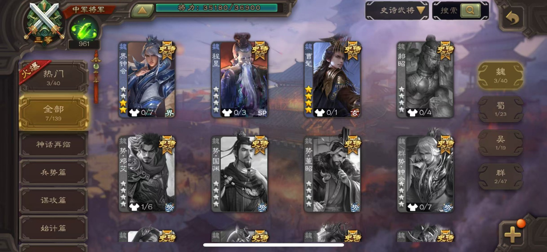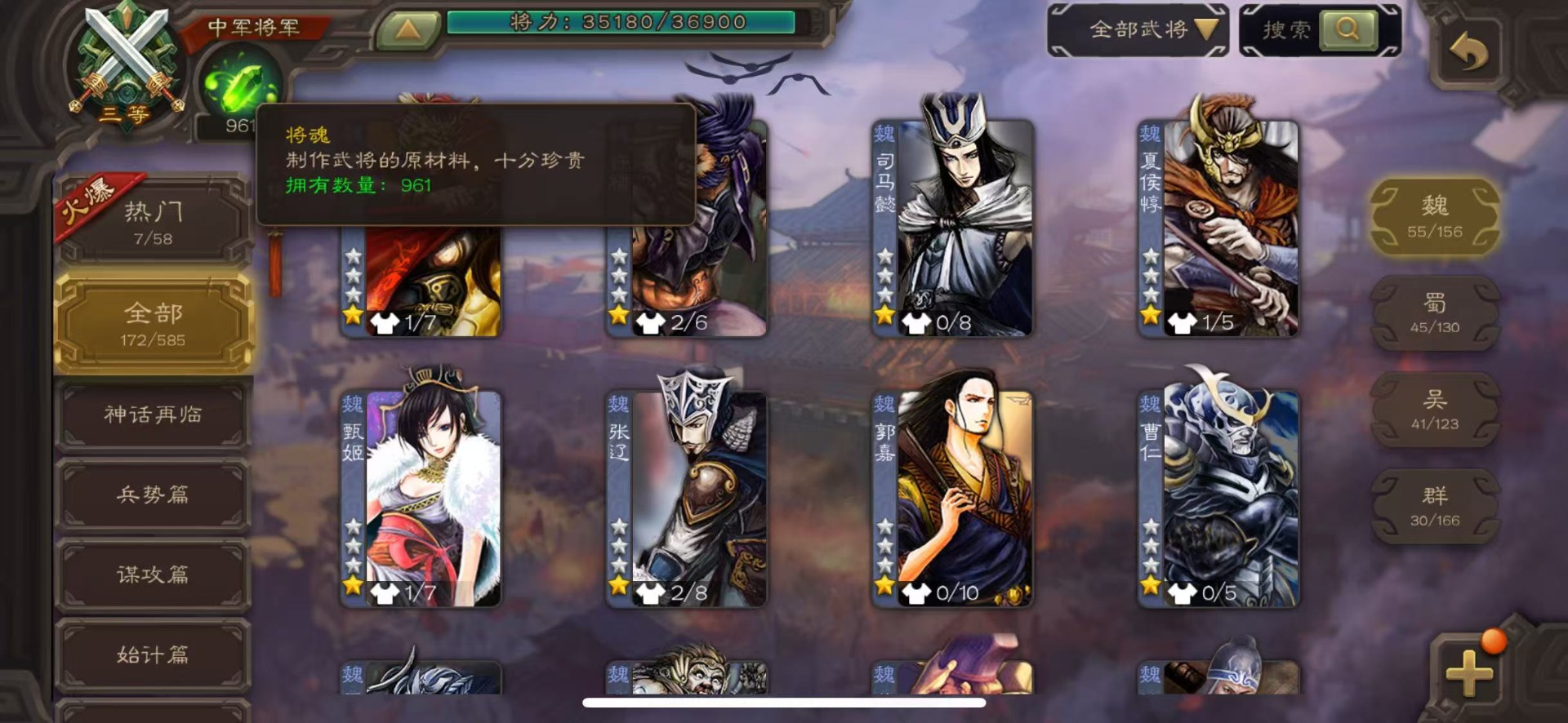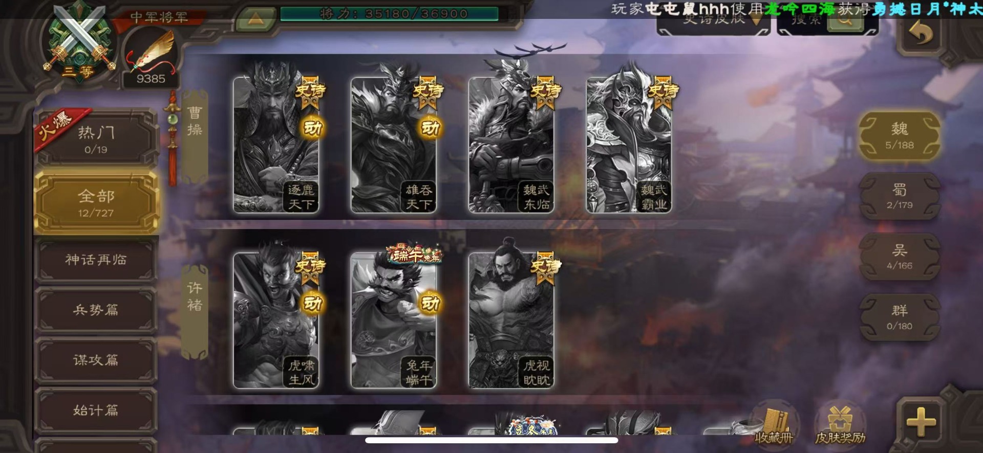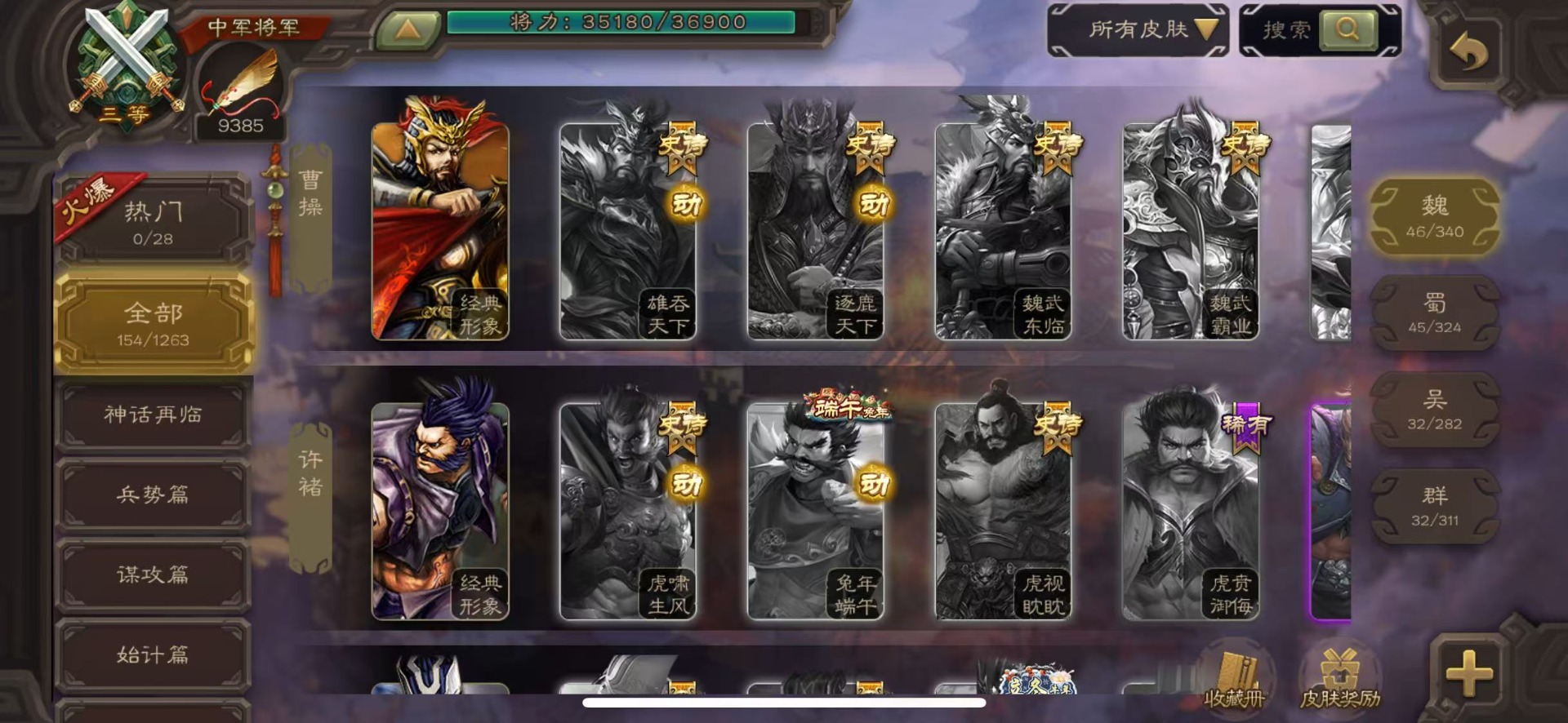 [16471745]vip3 中军将军 172武将 2动态皮肤 7史诗武将 【魏国武将】曹髦界钟会程昱甄姬司马懿许褚夏侯惇郭嘉曹操张辽 【蜀国武将】沙摩柯 【吴国武将】界徐盛 【群国武将】界沮授张让