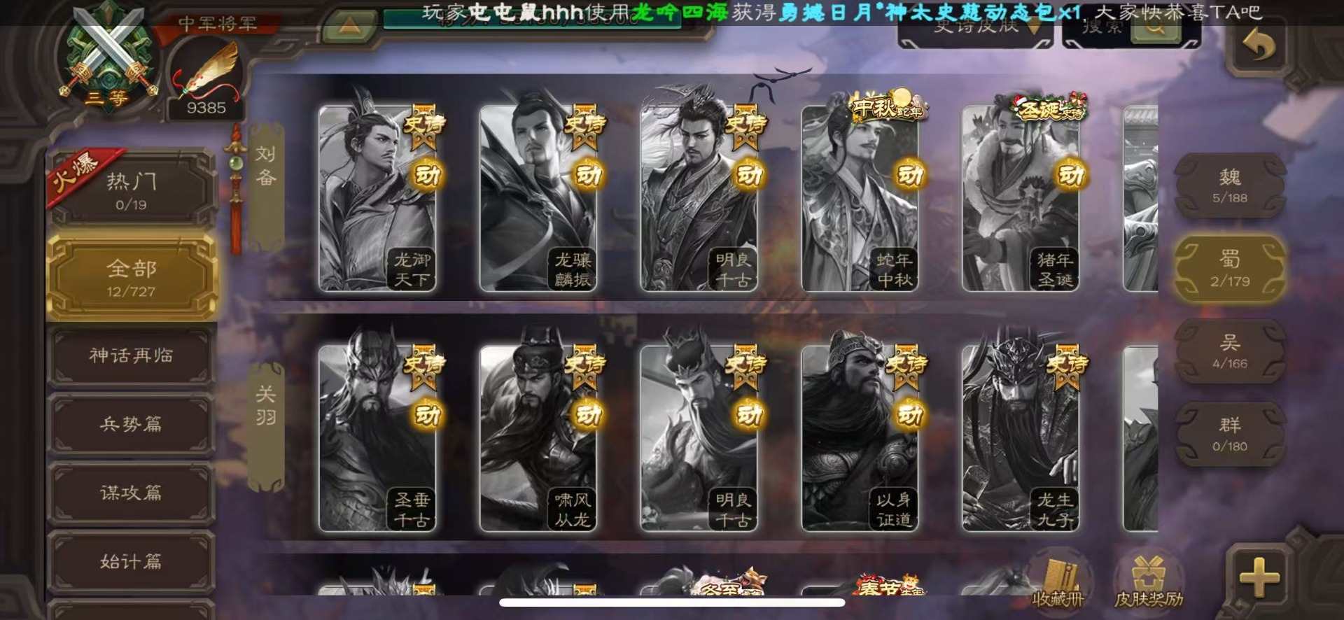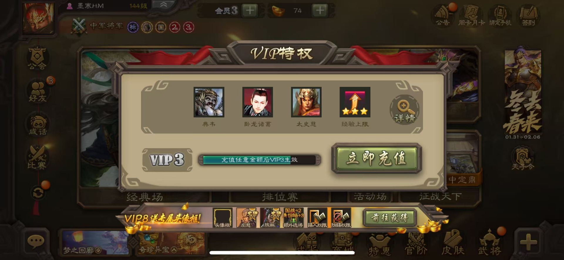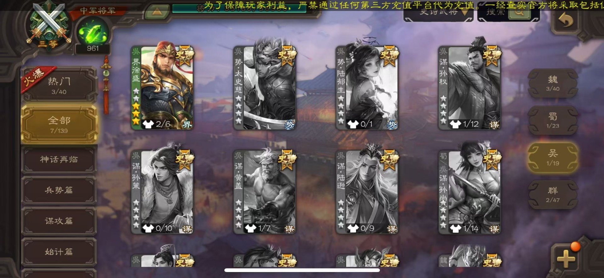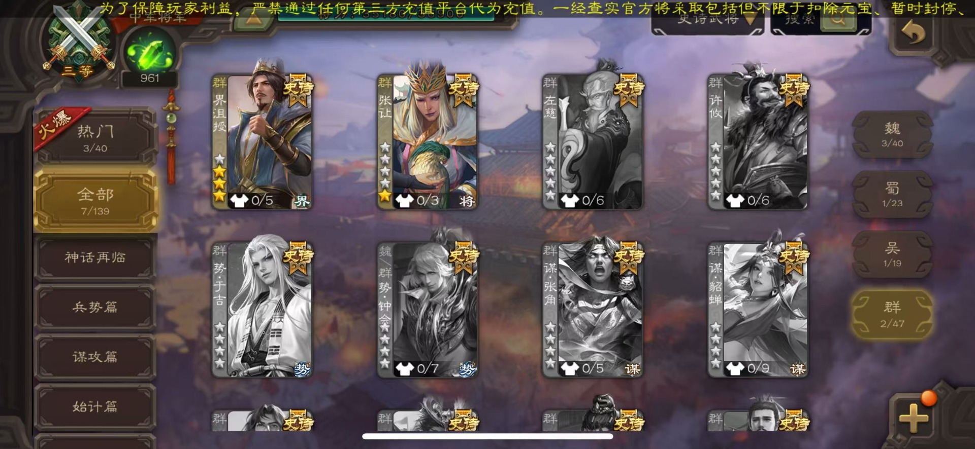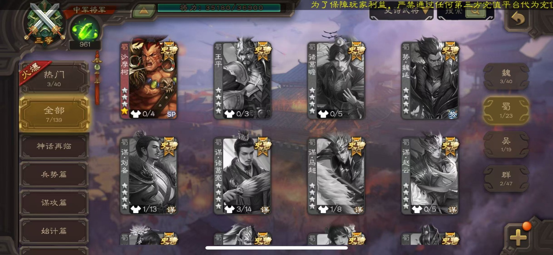 [16471745]vip3 中军将军 172武将 2动态皮肤 7史诗武将 【魏国武将】曹髦界钟会程昱甄姬司马懿许褚夏侯惇郭嘉曹操张辽 【蜀国武将】沙摩柯 【吴国武将】界徐盛 【群国武将】界沮授张让