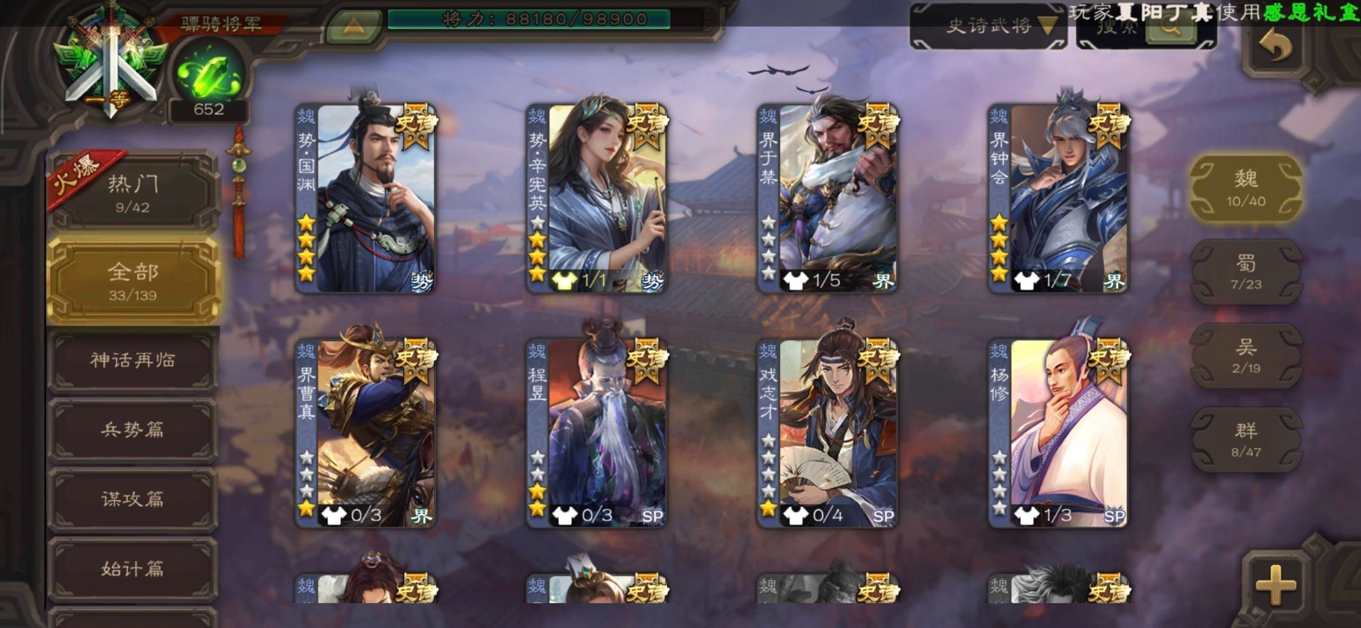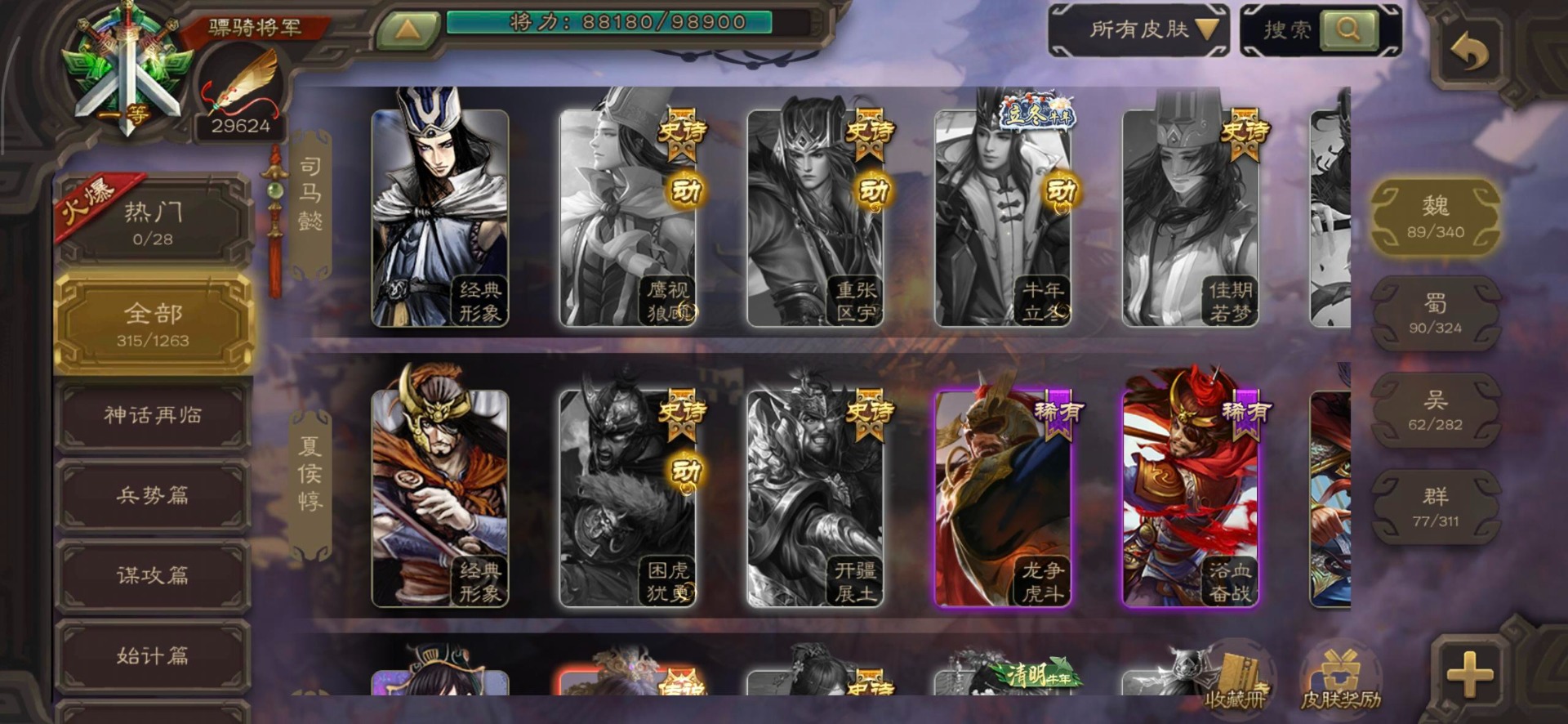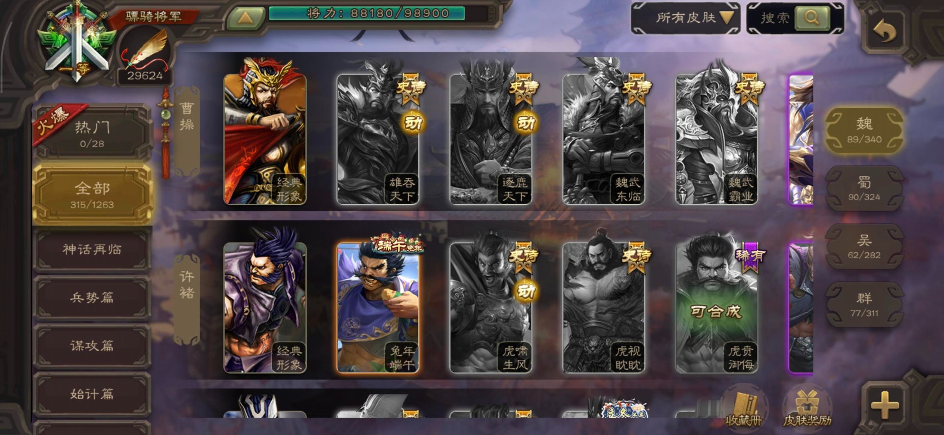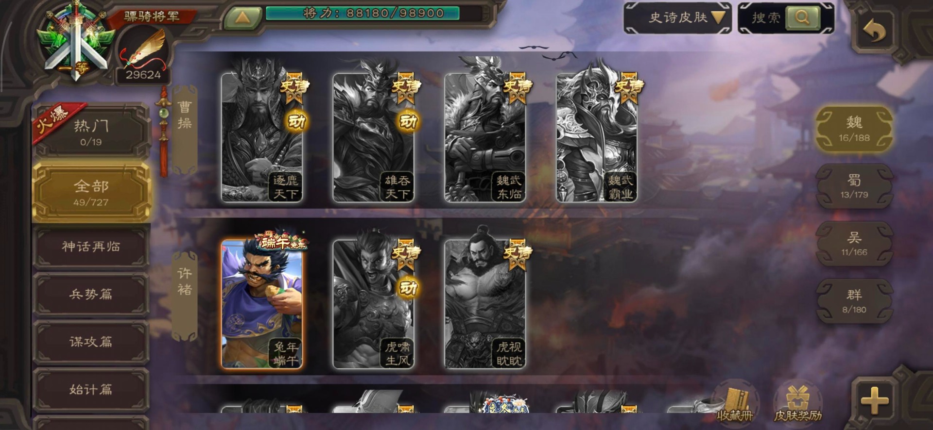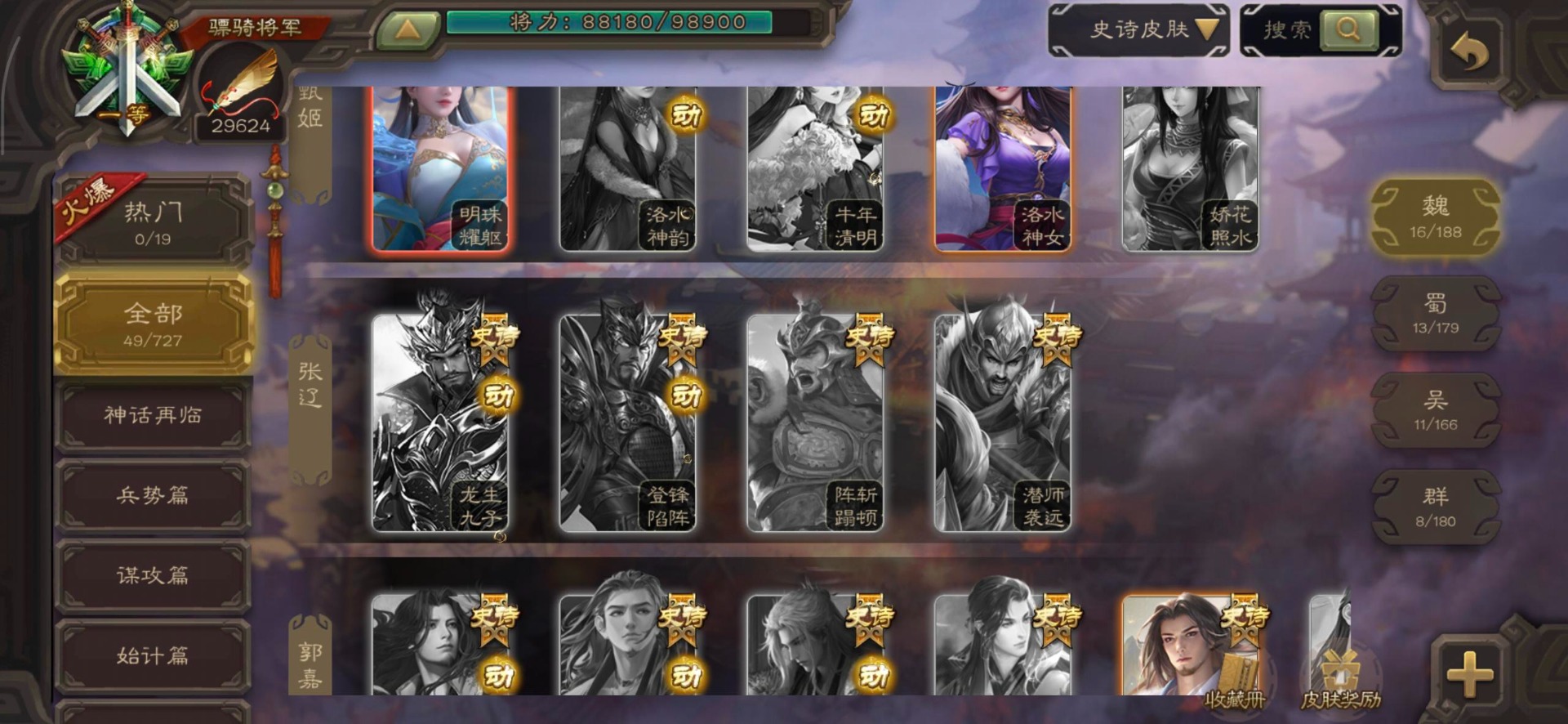[16501254]vip8 骠骑将军 33武将 19动态皮肤 33史诗武将 【神将】神吕布神赵云神陆逊神刘备神张辽神孙策 【魏国武将】势国渊势辛宪英星周不疑杨修界钟会界于禁界曹真程昱曹纯戏志才谋荀彧许褚曹操 【蜀国武将】谋赵云谋马超沙摩柯谯周花鬘董允 【吴国武将】势陆郁生贺齐 【群国武将】谋吕布左慈星黄忠兀突骨麹义界李儒谋张角