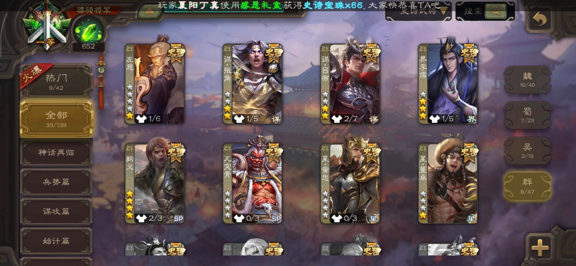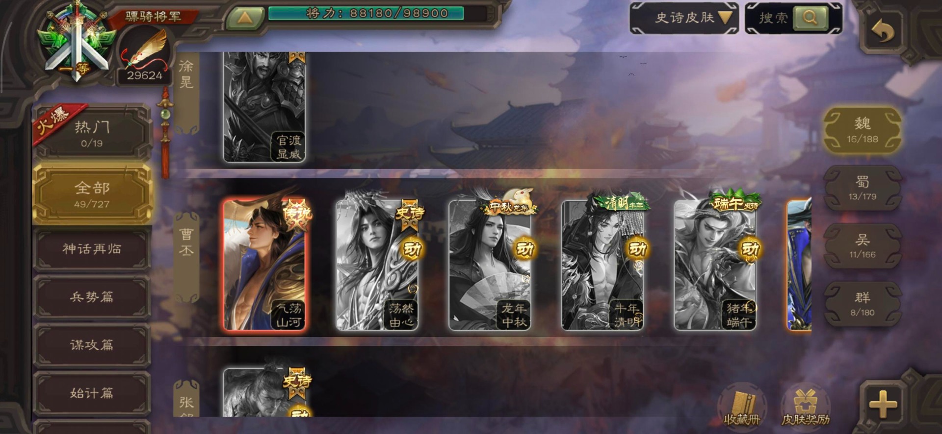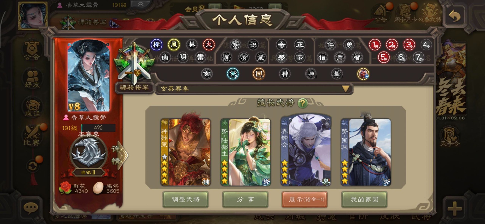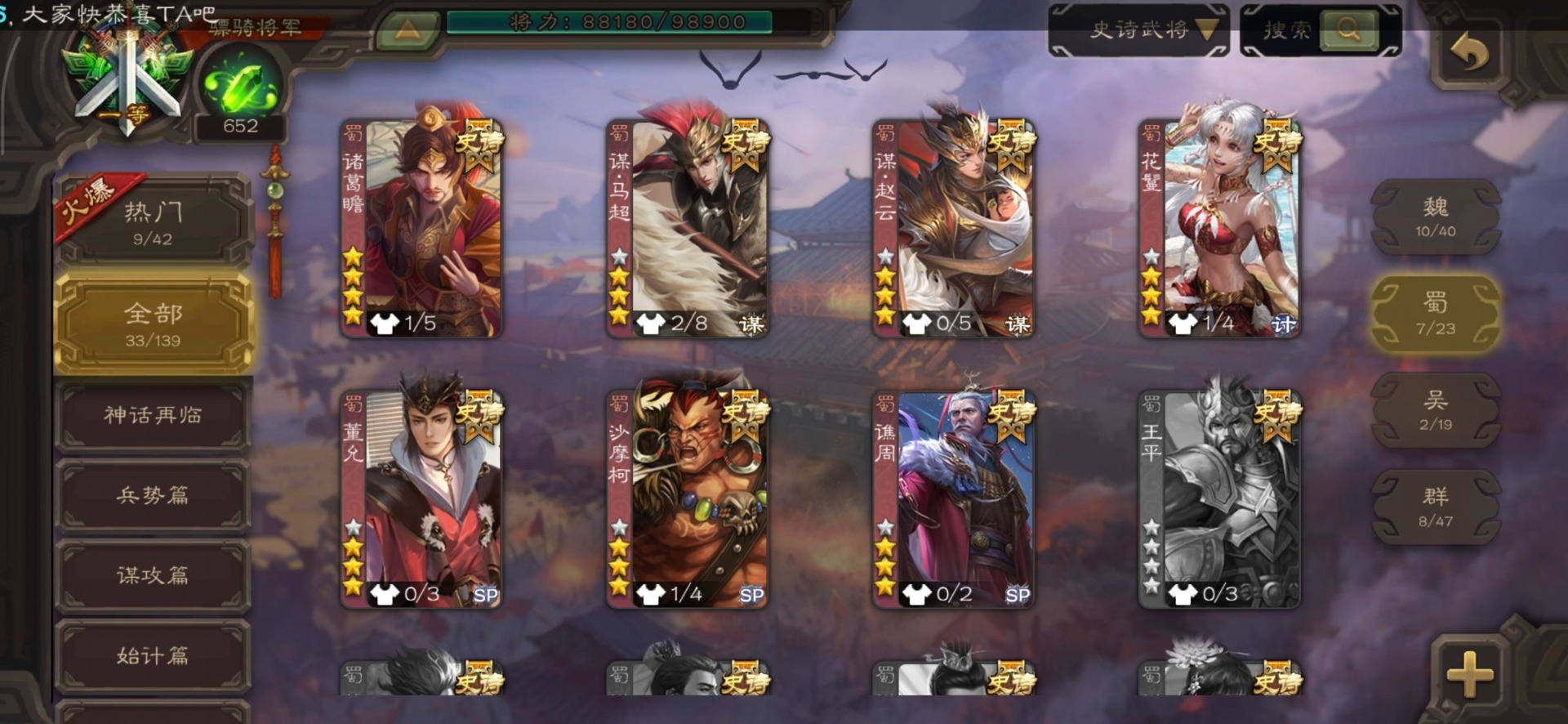 [16501254]vip8 骠骑将军 33武将 19动态皮肤 33史诗武将 【神将】神吕布神赵云神陆逊神刘备神张辽神孙策 【魏国武将】势国渊势辛宪英星周不疑杨修界钟会界于禁界曹真程昱曹纯戏志才谋荀彧许褚曹操 【蜀国武将】谋赵云谋马超沙摩柯谯周花鬘董允 【吴国武将】势陆郁生贺齐 【群国武将】谋吕布左慈星黄忠兀突骨麹义界李儒谋张角