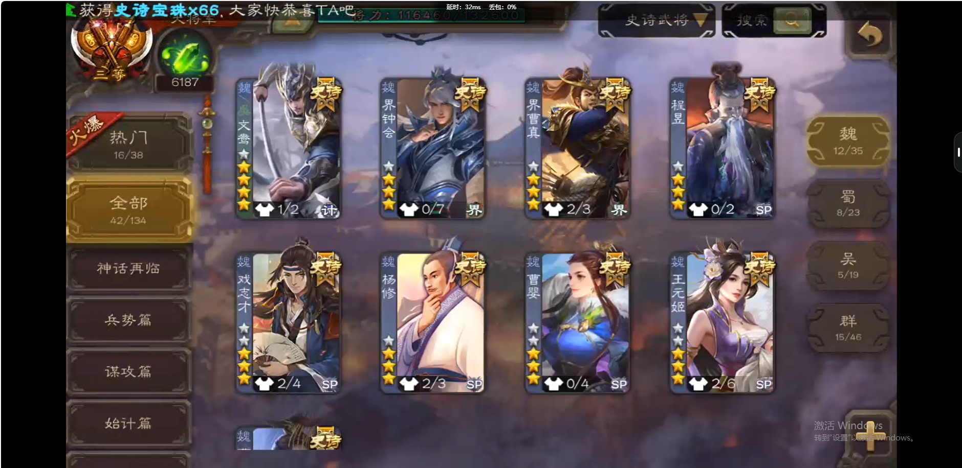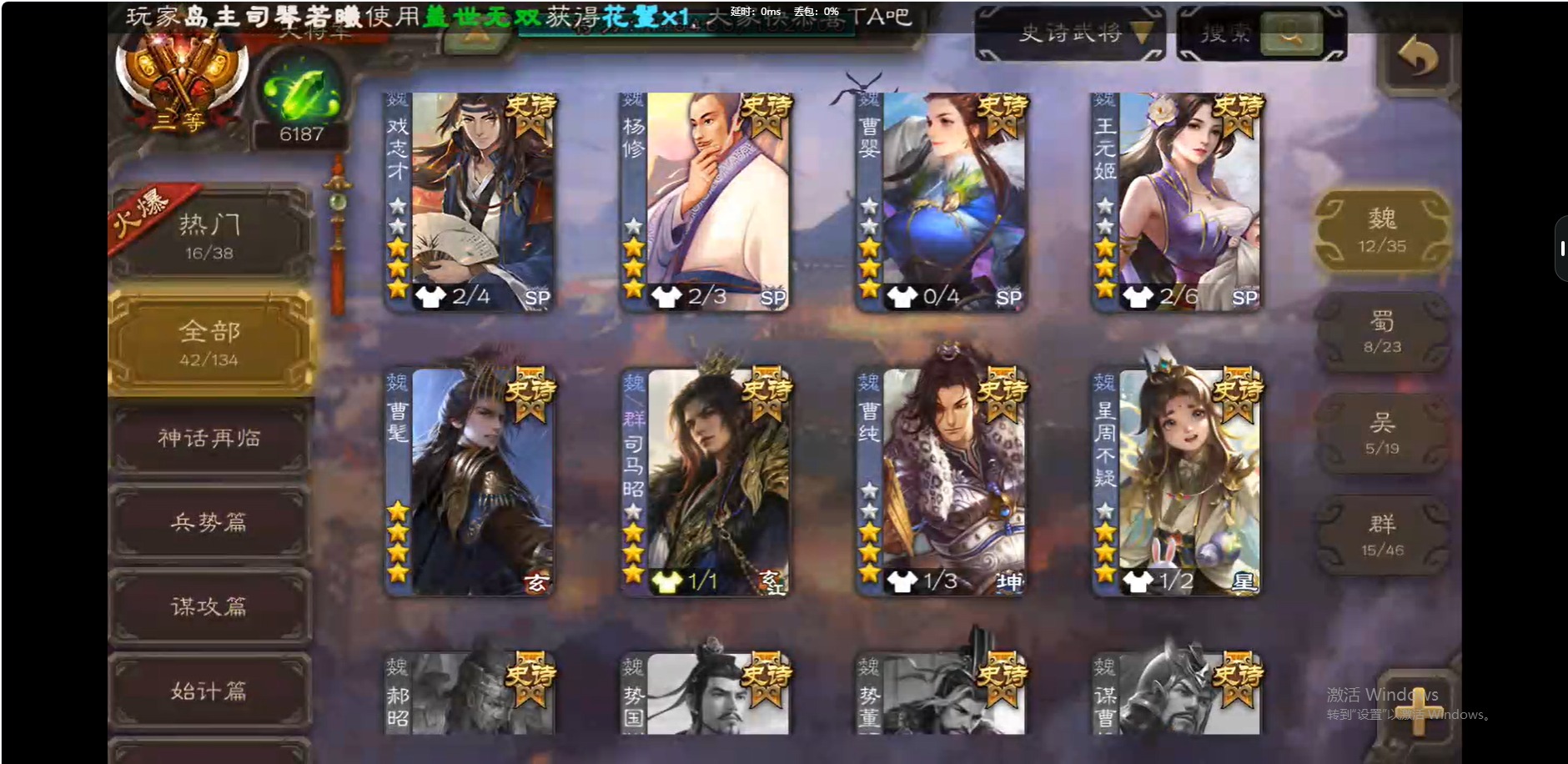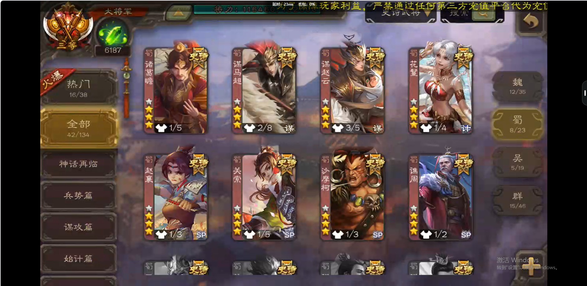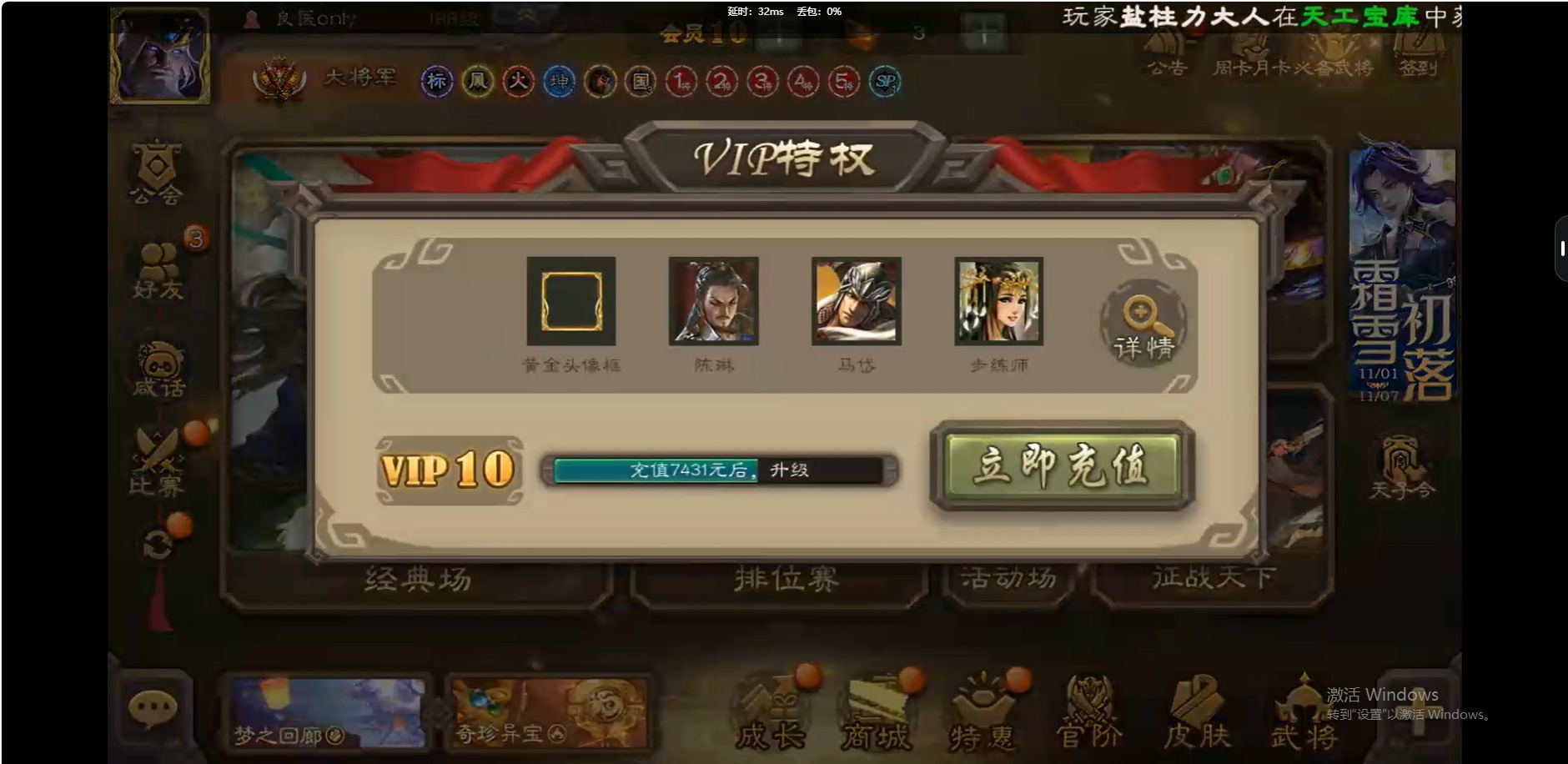 [16509462]vip10 大将军 339武将 44动态皮肤 42史诗武将 【神将】:神吕布神赵云神陆逊神太史慈 【魏国武将】:曹髦星周不疑杨修王元姬界钟会界曹真程昱曹婴戏志才 【蜀国武将】:谋赵云谋马超诸葛瞻赵襄沙摩柯谯周花鬘关索 【吴国武将】:文鸯吴景孙皓界徐盛 【群国武将】:星董卓左慈张让兀突骨苏飞麹义南华老仙刘焉沮授界左慈界李儒公孙康杜预谋张角