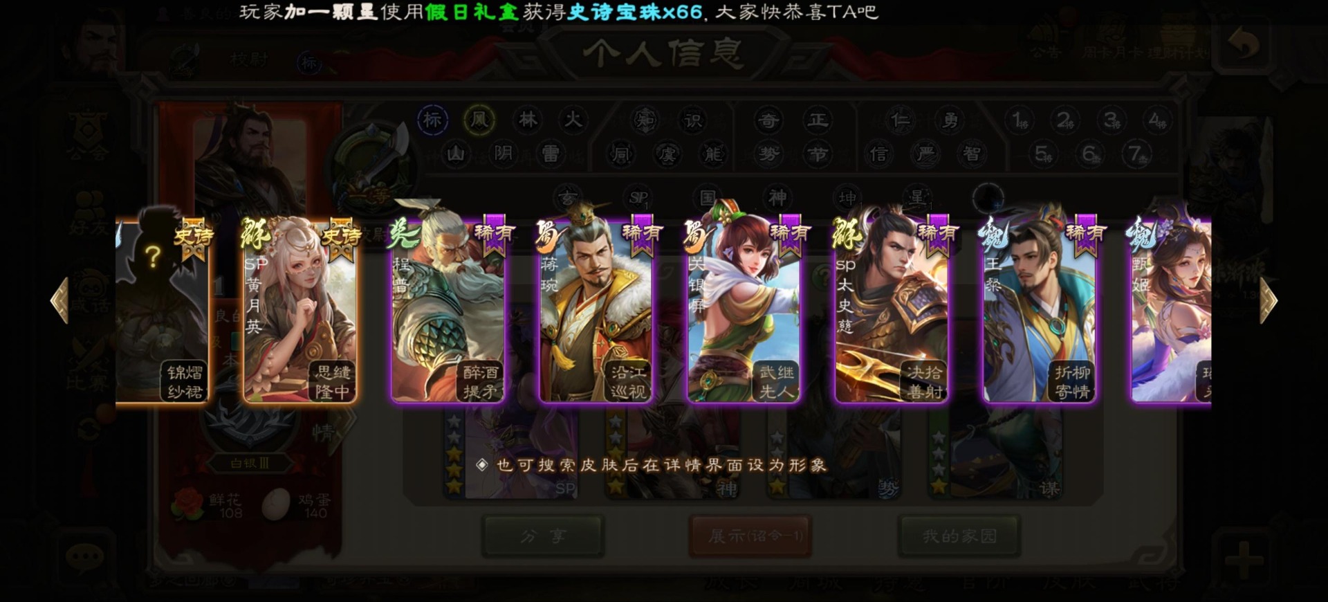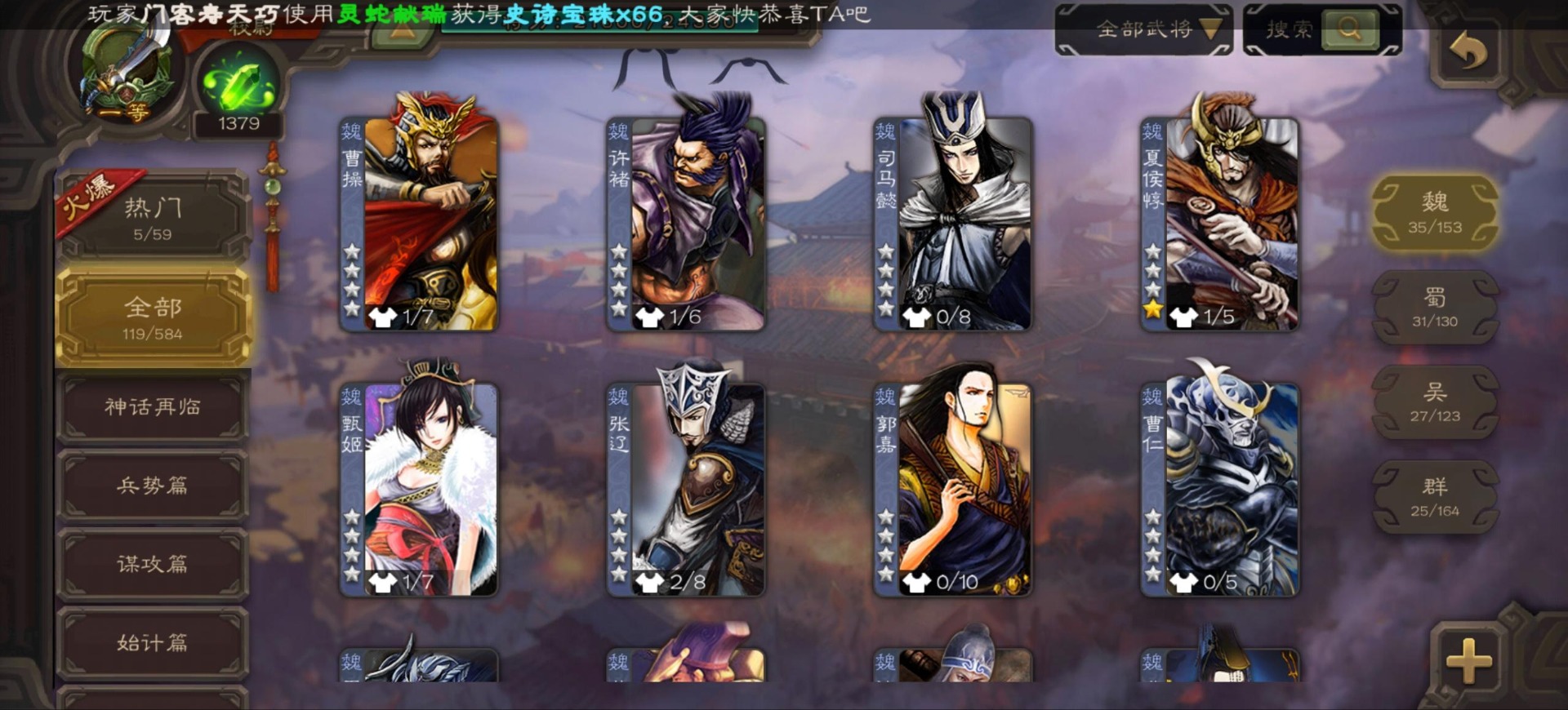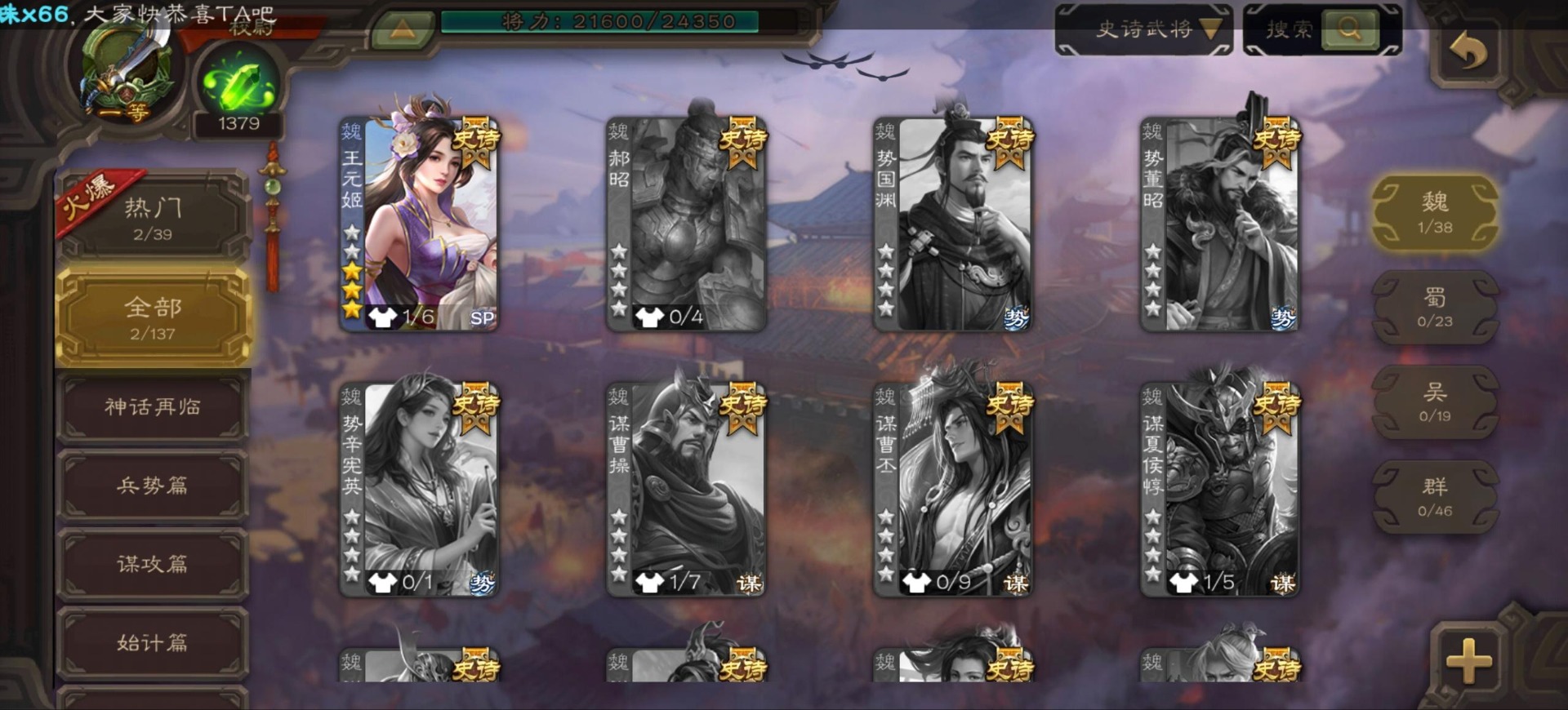 [16518206]vip1 校尉 119武将 2动态皮肤 2史诗武将 【神将】神孙策 【魏国武将】王元姬甄姬司马懿许褚夏侯惇郭嘉曹仁曹操张辽 【蜀国武将】卧龙诸葛