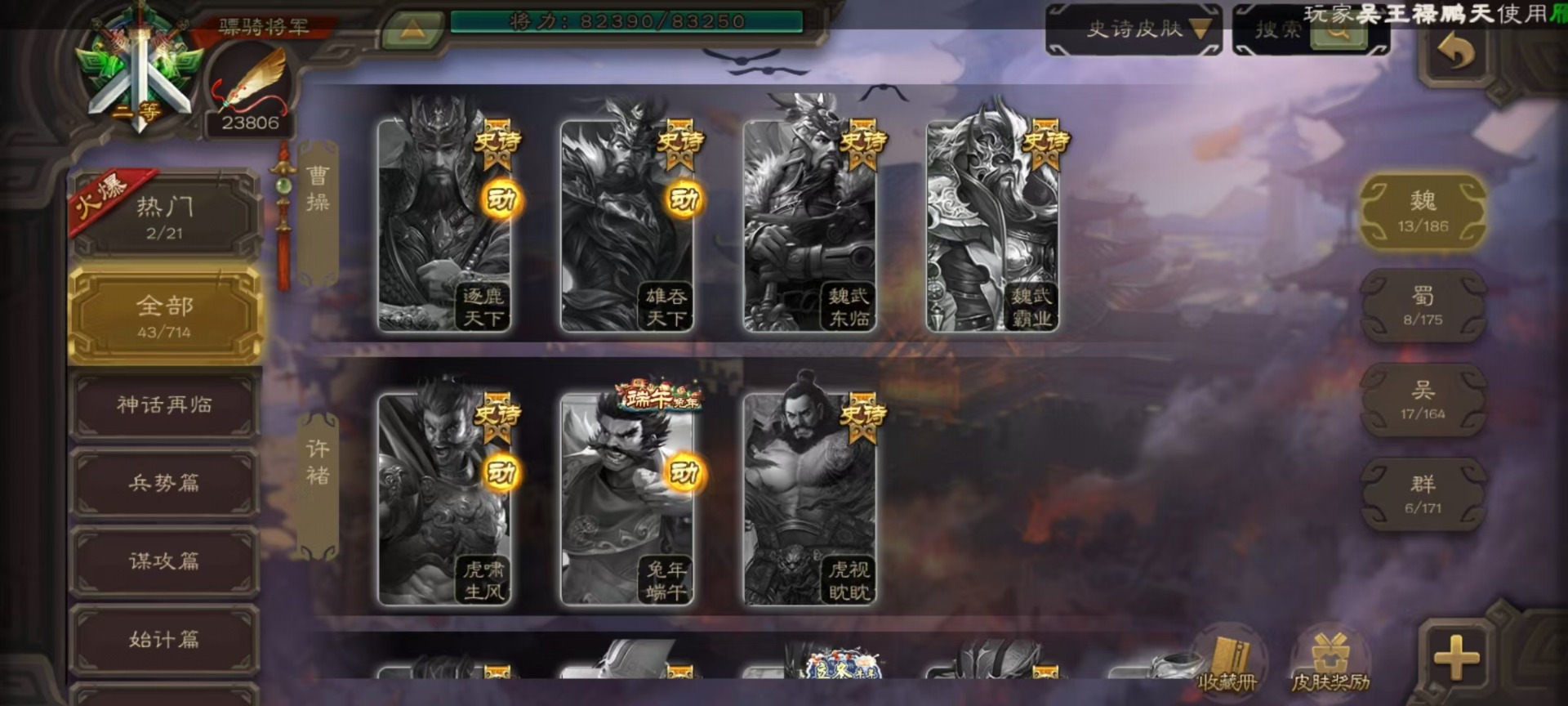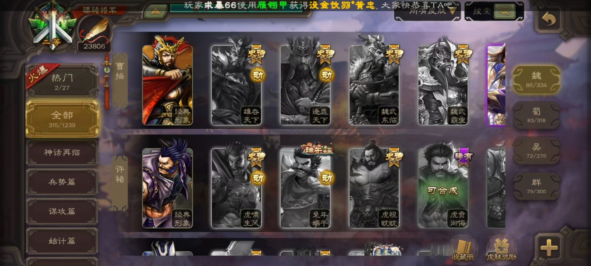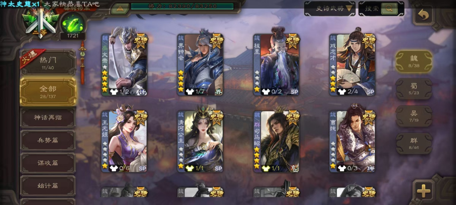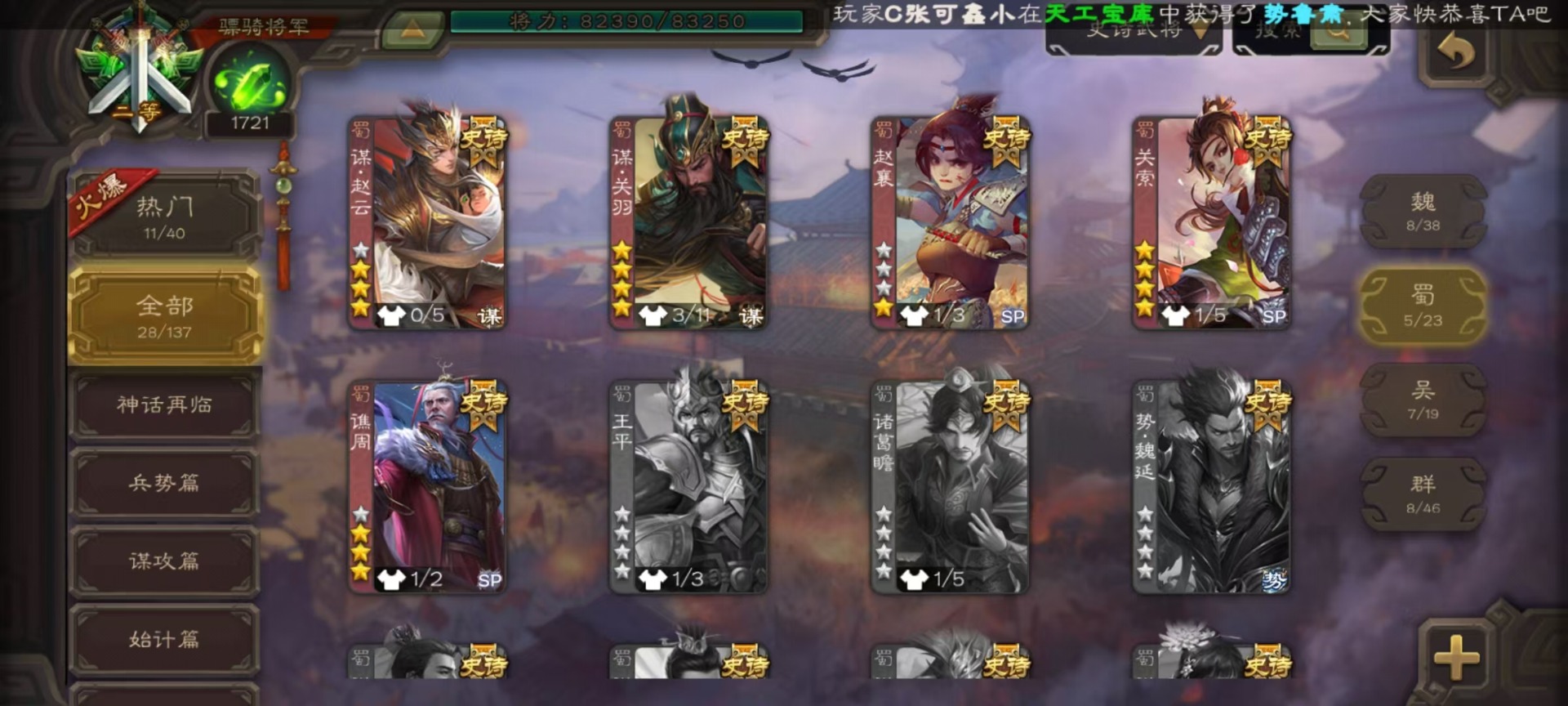 [16520490]vip9 骠骑将军 314武将 18动态皮肤 28史诗武将 2宝珠 【神将】:神甘宁神张辽 【魏国武将】:清河公主文鸯王元姬魏-司马昭界钟会程昱曹纯戏志才甄姬司马懿许褚夏侯惇郭嘉曹仁曹操张辽 【蜀国武将】:谋赵云赵襄谯周关索谋关羽 【吴国武将】:文鸯吴景孙皓骆统留赞界朱然界徐盛 【群国武将】:星董卓群-司马昭谋貂蝉兀突骨沮授界左慈界李儒许攸