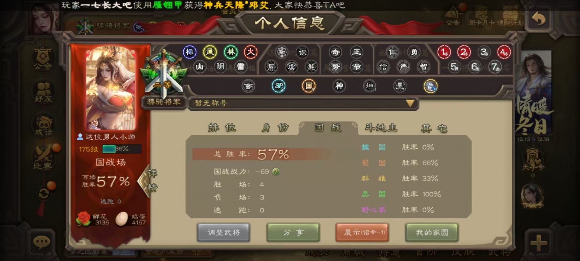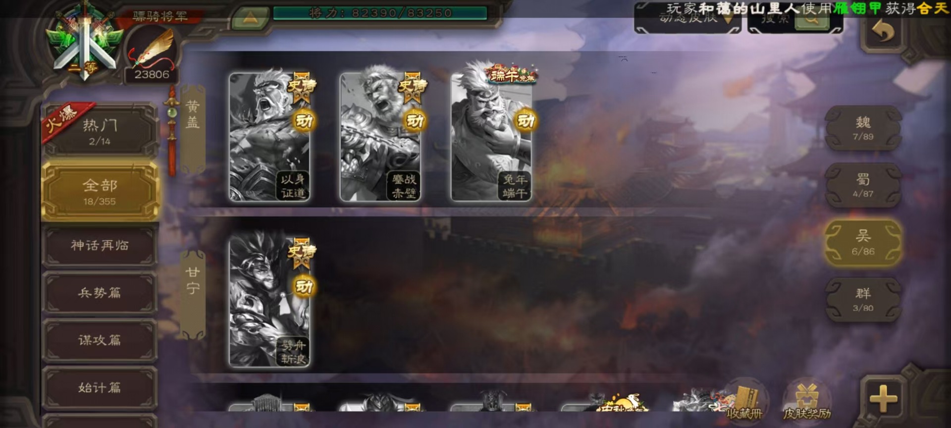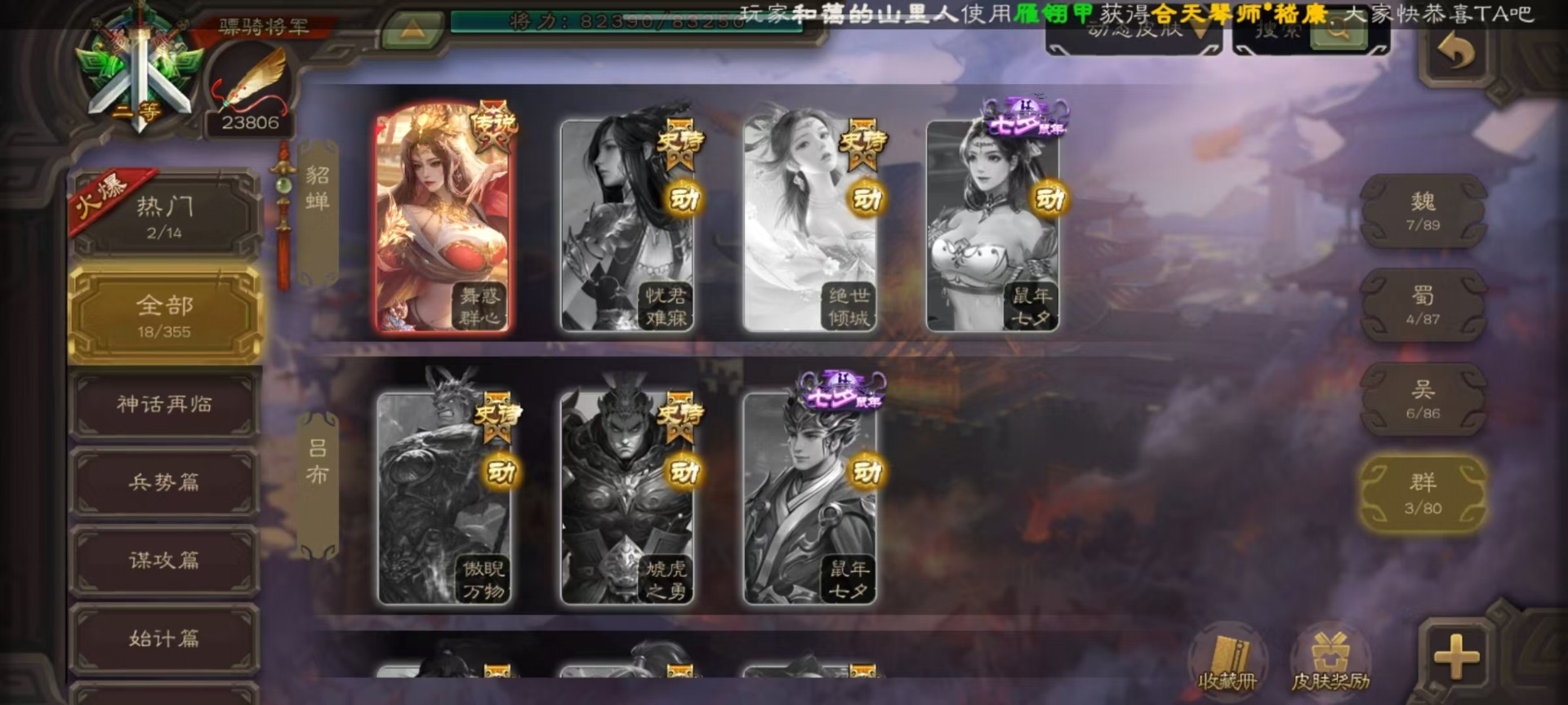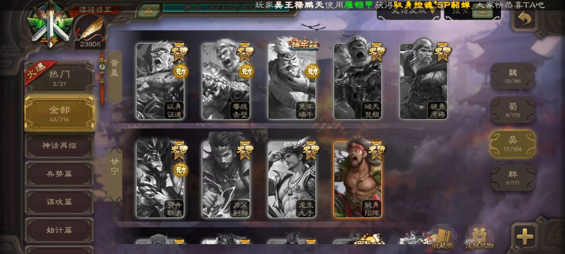 [16520490]vip9 骠骑将军 314武将 18动态皮肤 28史诗武将 2宝珠 【神将】:神甘宁神张辽 【魏国武将】:清河公主文鸯王元姬魏-司马昭界钟会程昱曹纯戏志才甄姬司马懿许褚夏侯惇郭嘉曹仁曹操张辽 【蜀国武将】:谋赵云赵襄谯周关索谋关羽 【吴国武将】:文鸯吴景孙皓骆统留赞界朱然界徐盛 【群国武将】:星董卓群-司马昭谋貂蝉兀突骨沮授界左慈界李儒许攸