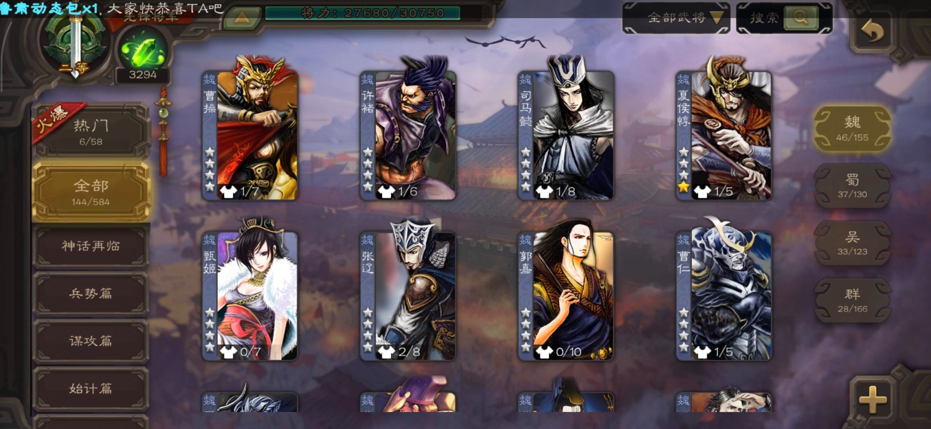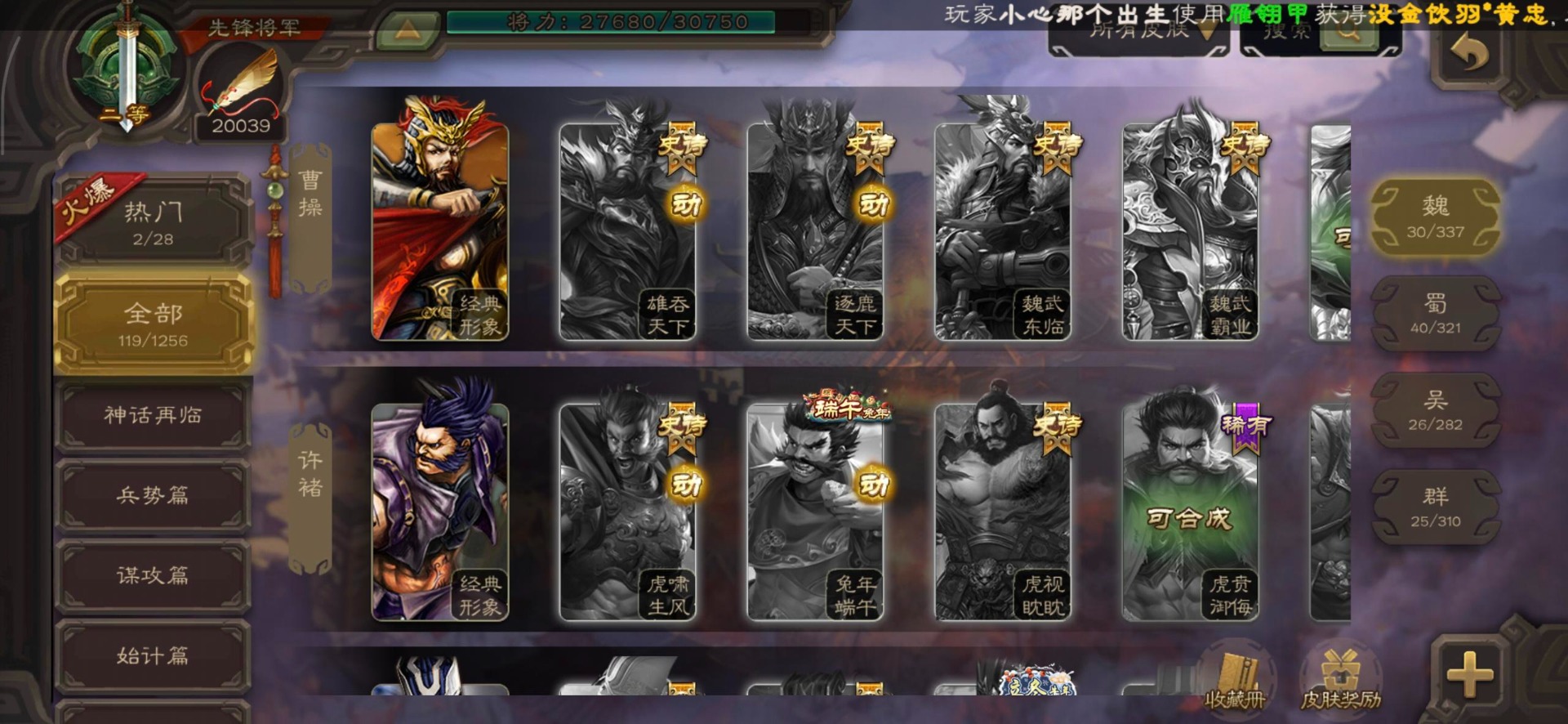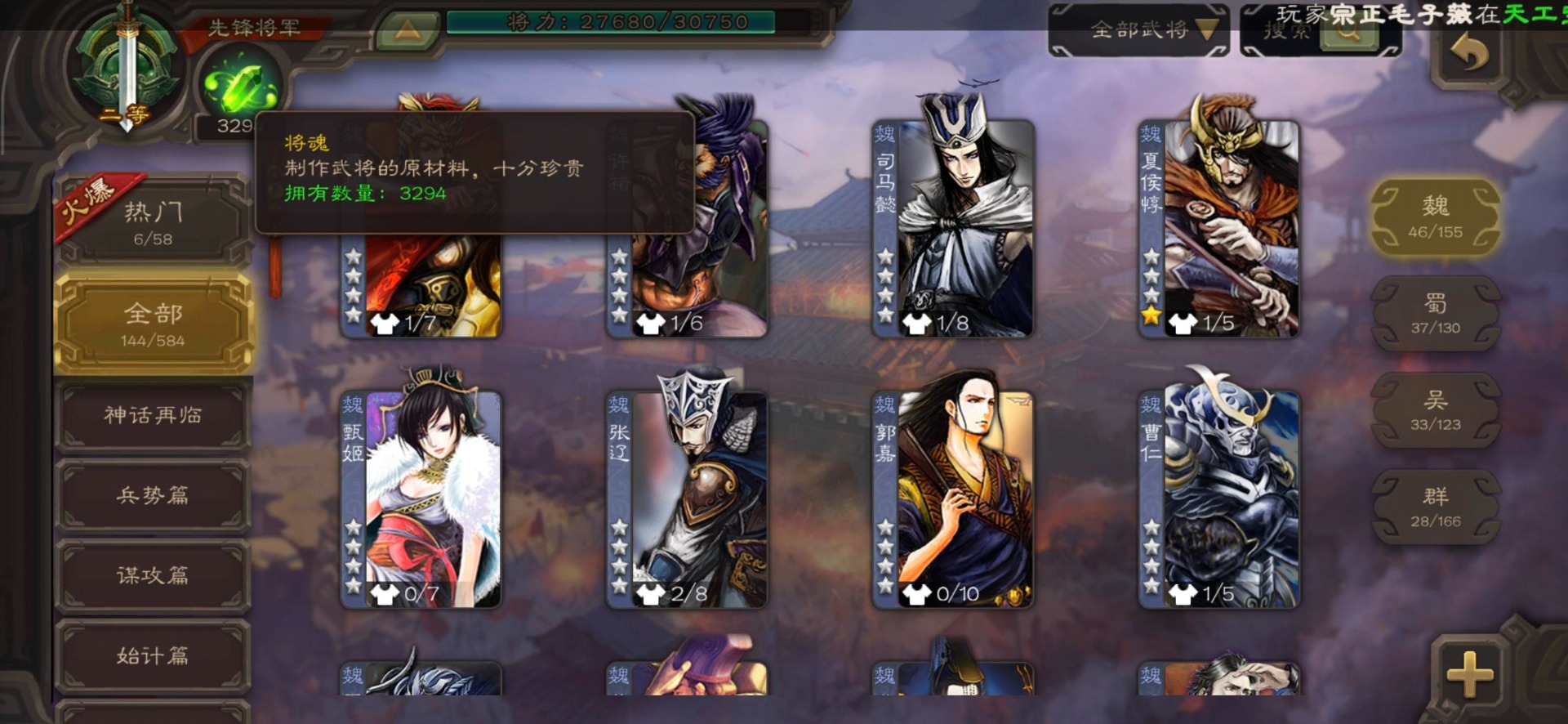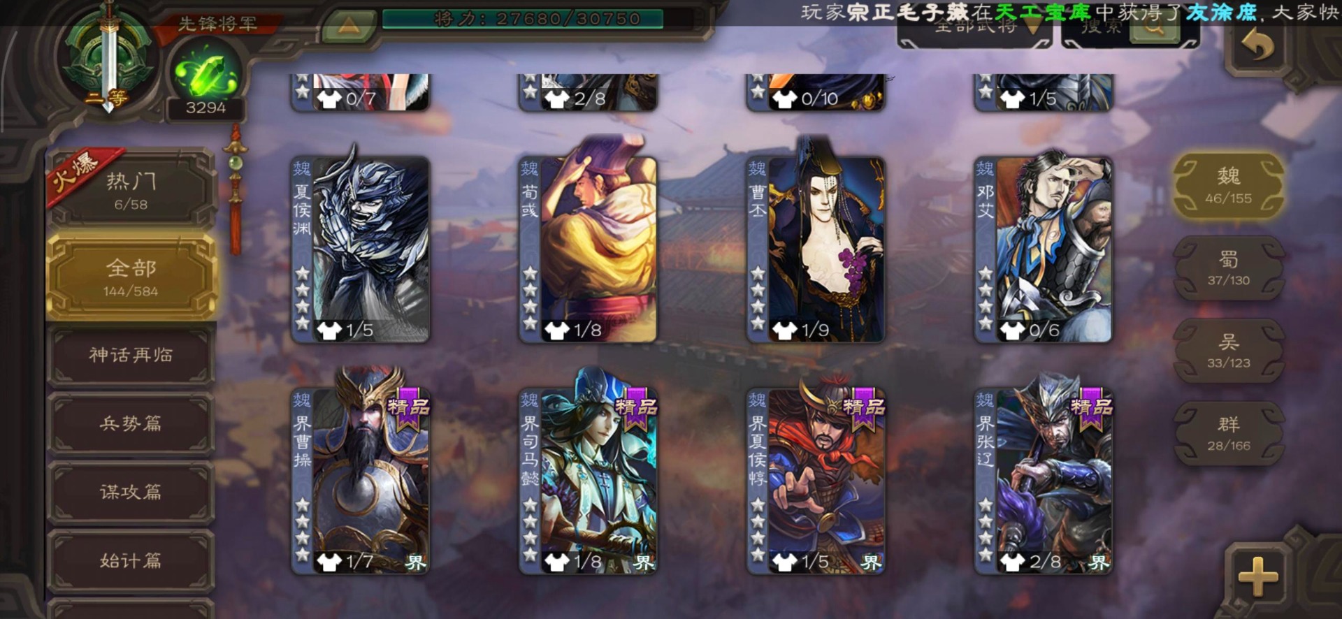 [16520504]vip3 先锋将军 144武将 3动态皮肤 4史诗武将 【魏国武将】星周不疑王元姬界司马懿界夏侯惇界张辽界曹操邓艾夏侯渊甄姬司马懿许褚夏侯惇荀彧郭嘉曹仁曹丕曹操张辽 【吴国武将】势太史慈界徐盛