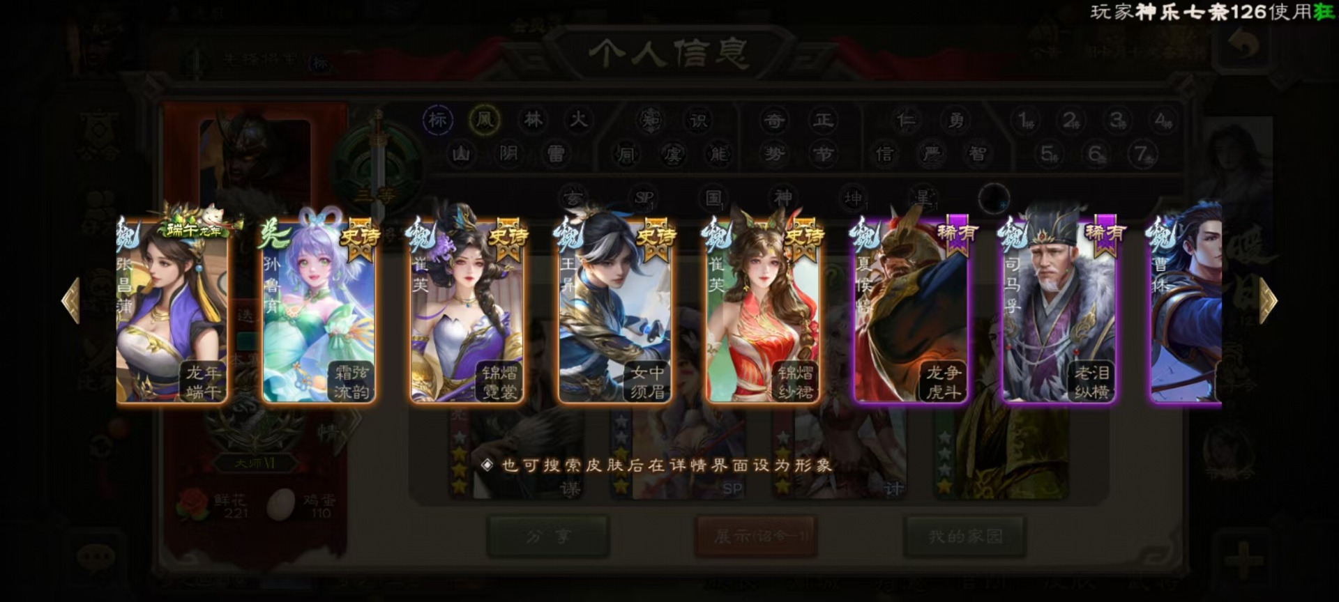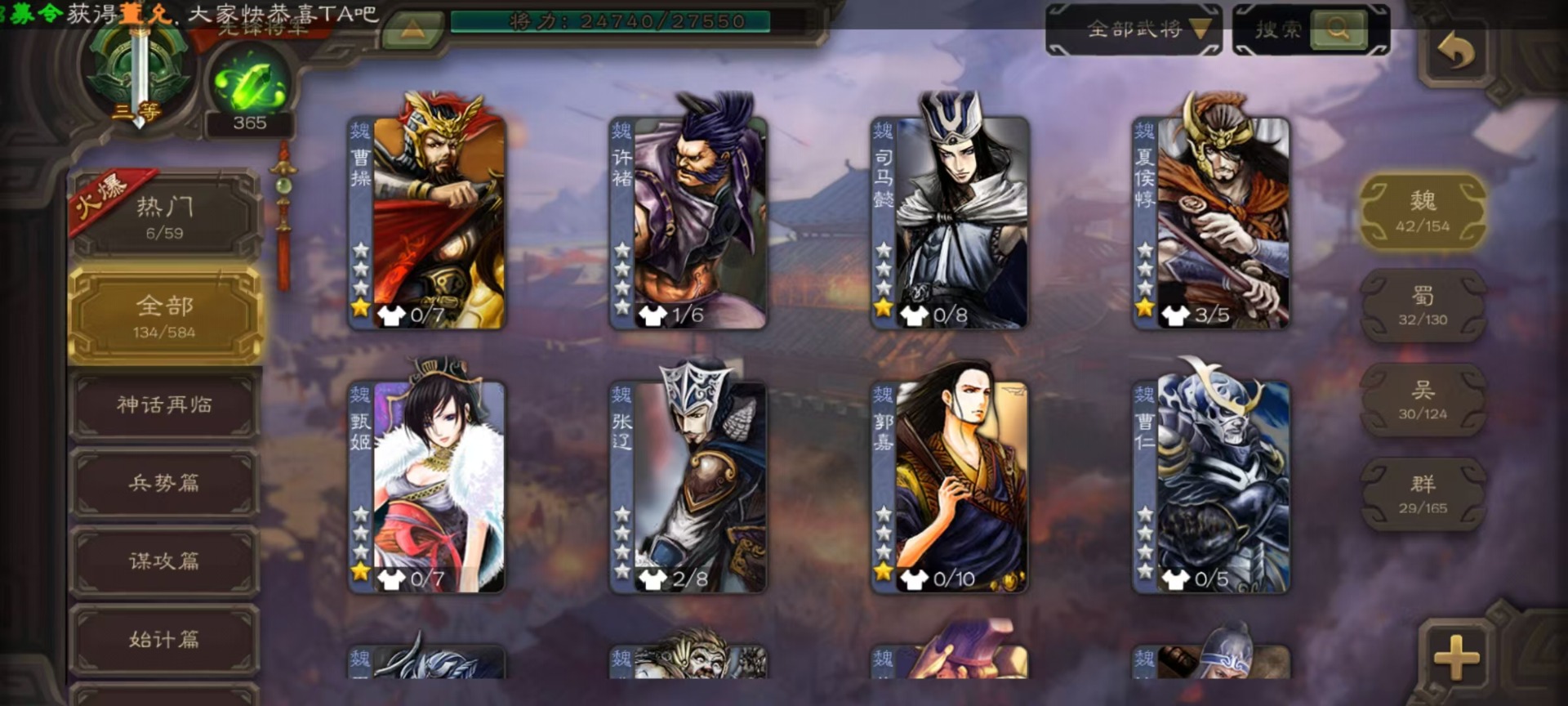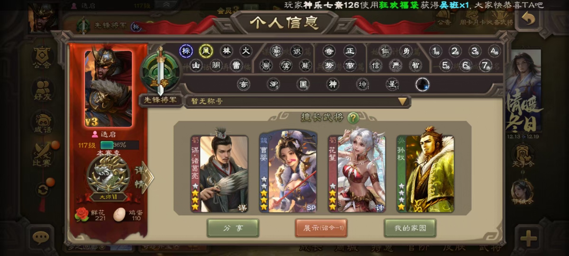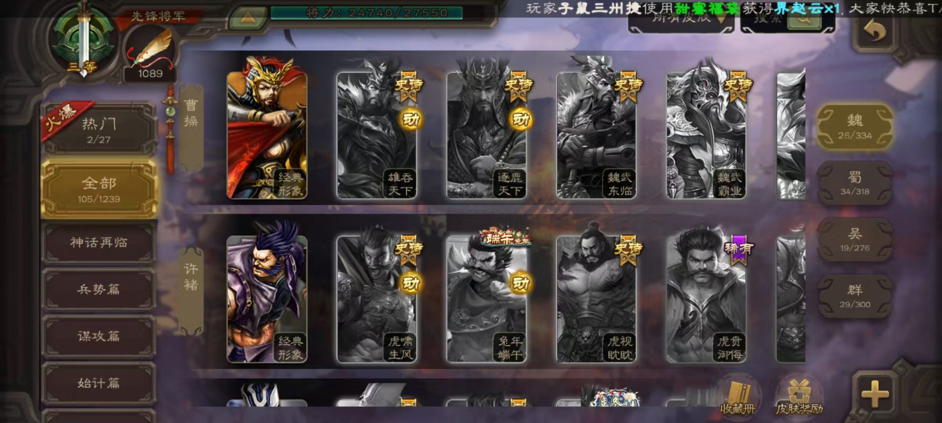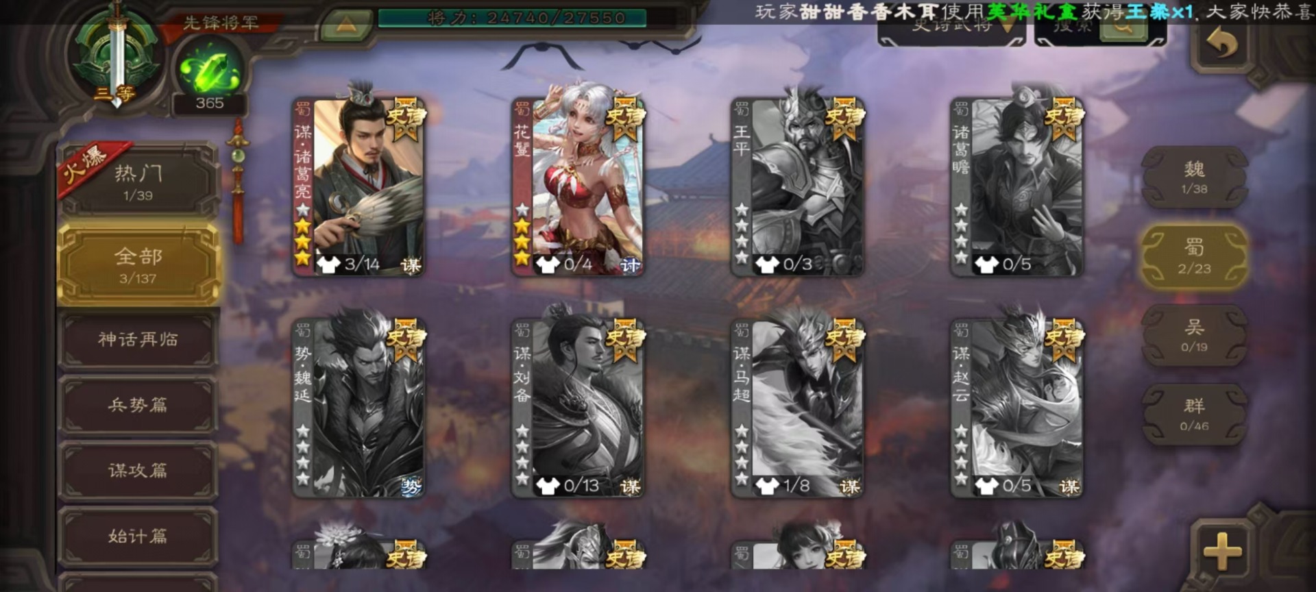 [16520826]vip3 先锋将军 134武将 4动态皮肤 3史诗武将 【魏国武将】:曹婴甄姬司马懿许褚夏侯惇郭嘉曹仁曹操张辽 【蜀国武将】:谋诸葛亮花鬘