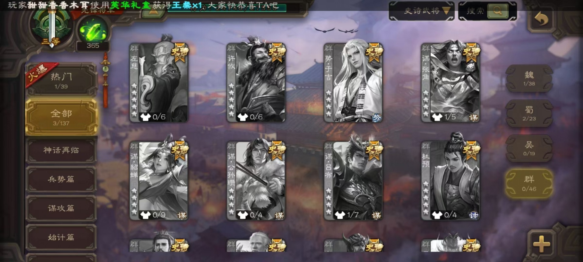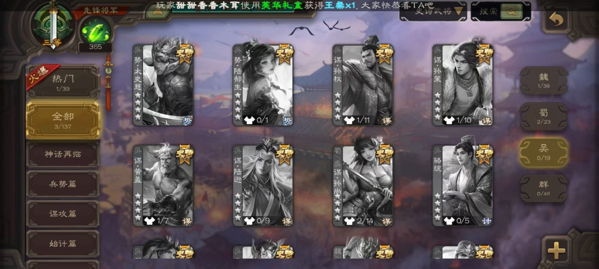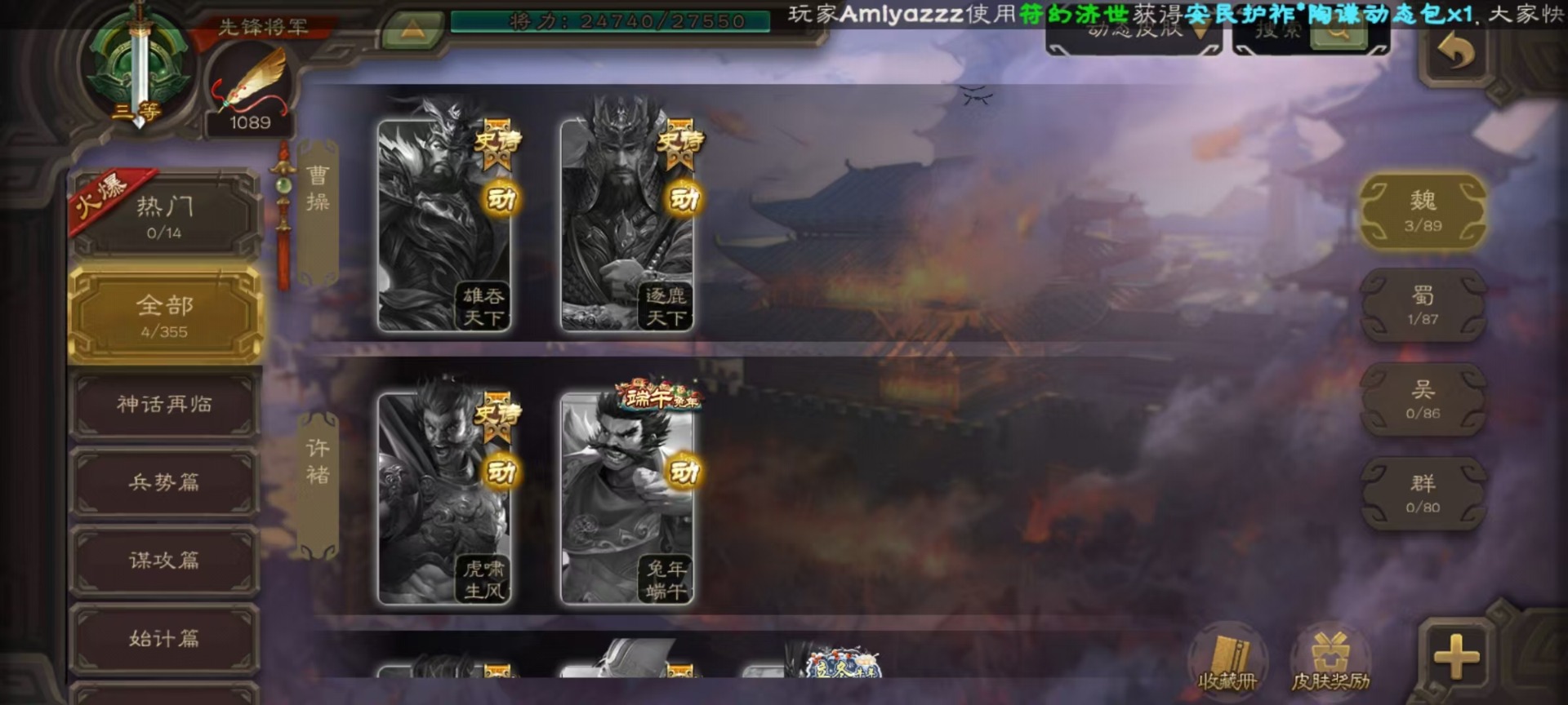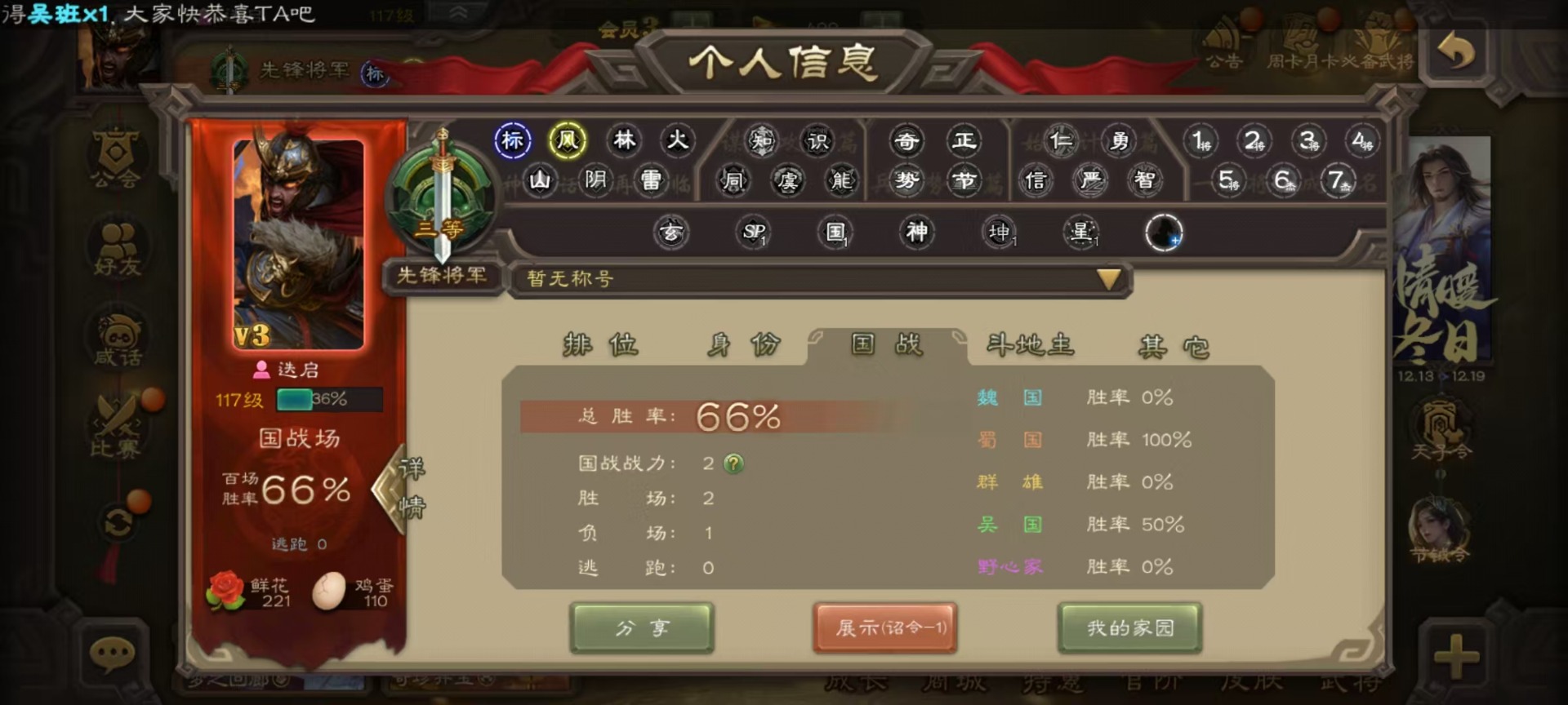 [16520826]vip3 先锋将军 134武将 4动态皮肤 3史诗武将 【魏国武将】:曹婴甄姬司马懿许褚夏侯惇郭嘉曹仁曹操张辽 【蜀国武将】:谋诸葛亮花鬘