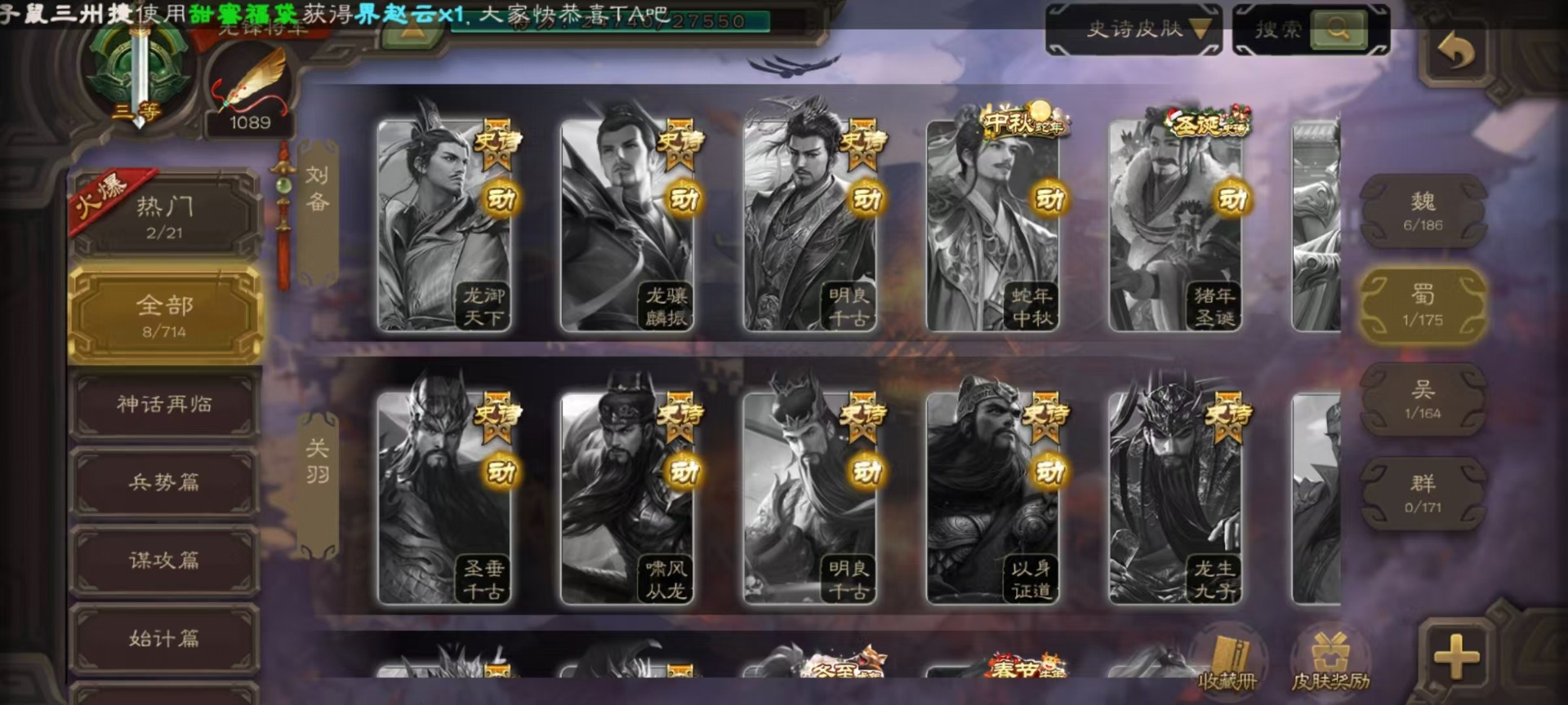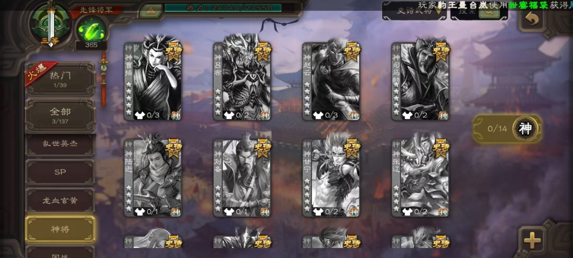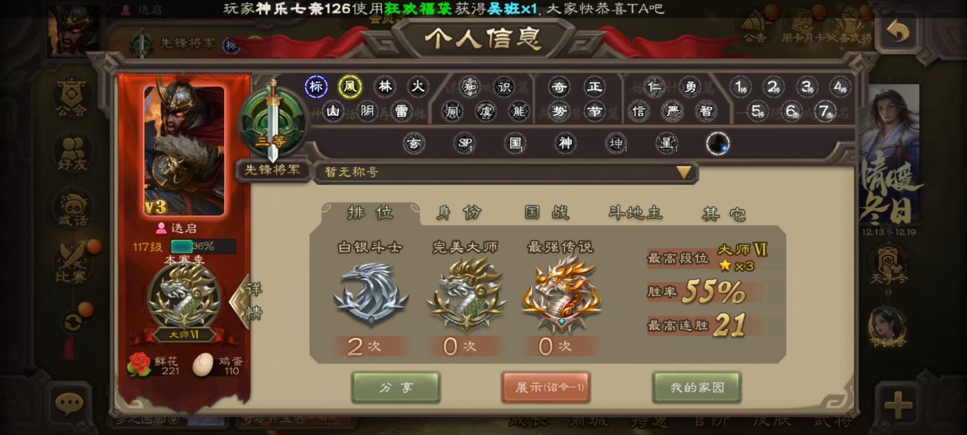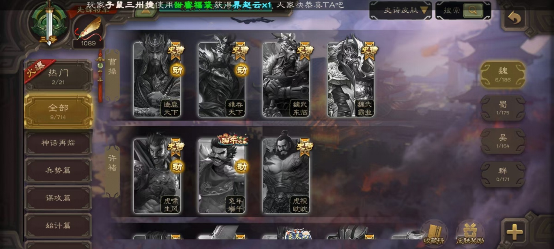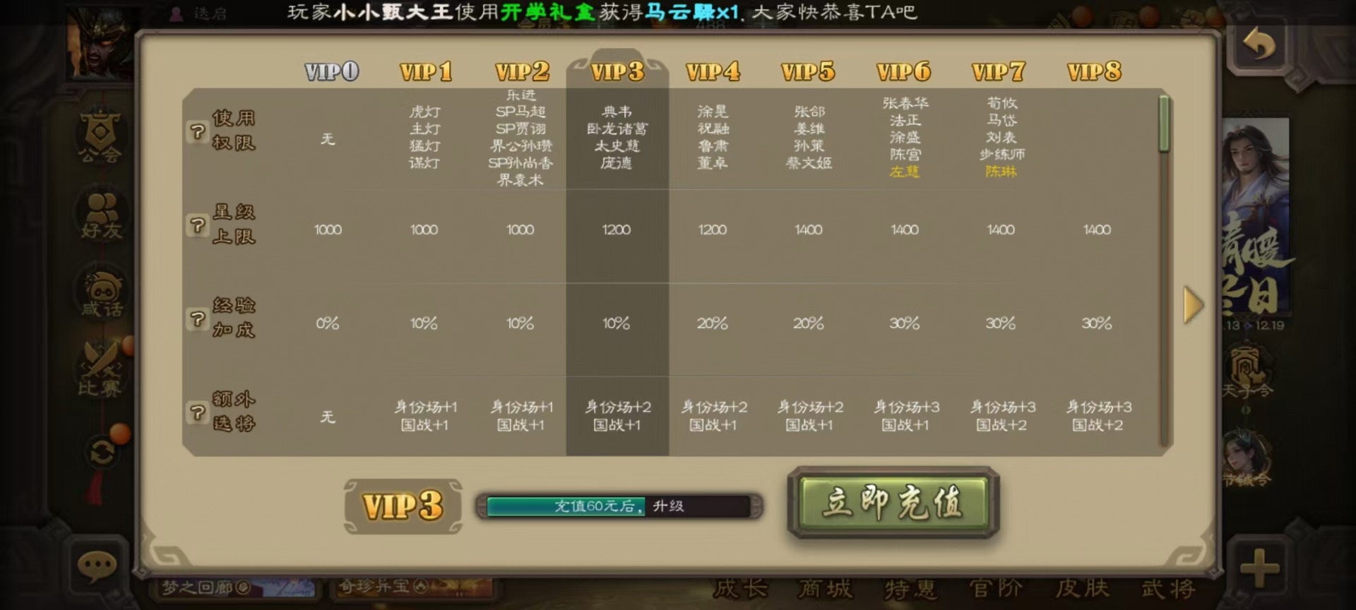 [16520826]vip3 先锋将军 134武将 4动态皮肤 3史诗武将 【魏国武将】:曹婴甄姬司马懿许褚夏侯惇郭嘉曹仁曹操张辽 【蜀国武将】:谋诸葛亮花鬘