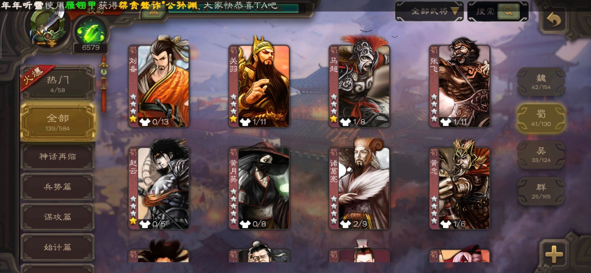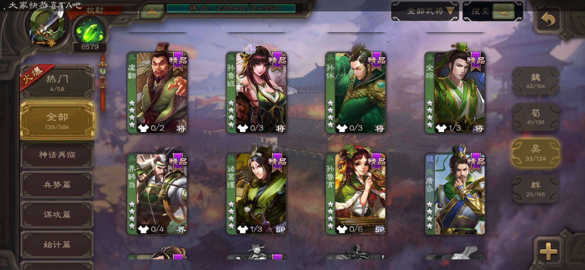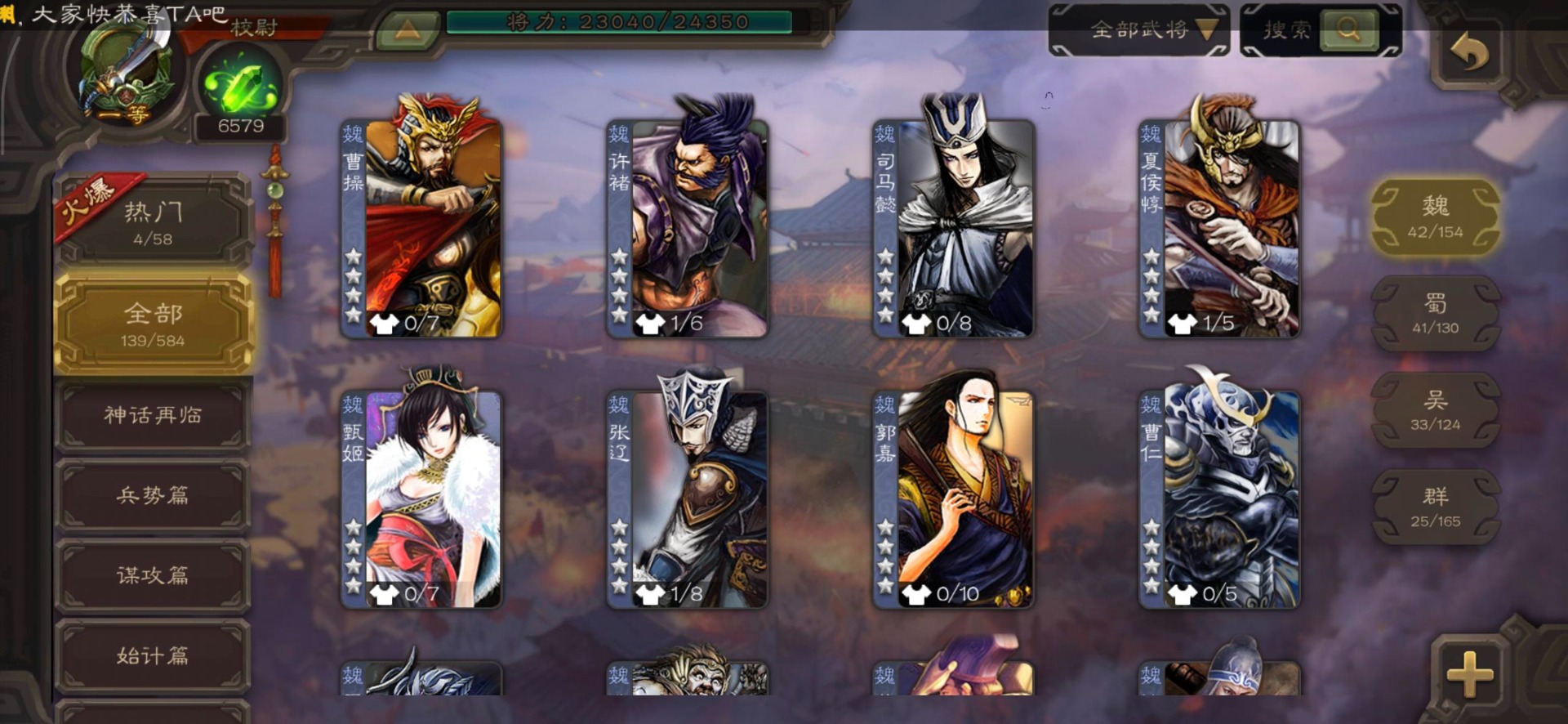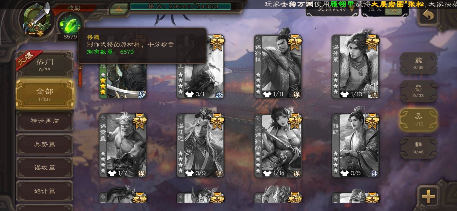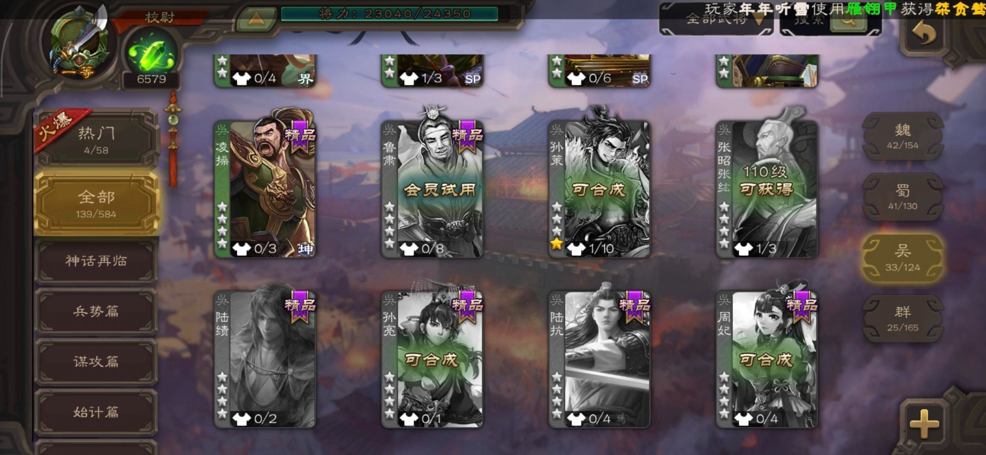 [16530467]vip4 校尉 139武将 1史诗武将 【魏国武将】甄姬司马懿许褚夏侯惇郭嘉曹仁曹操张辽 【蜀国武将】刘备黄忠马超诸葛亮张飞关羽黄月英赵云 【吴国武将】势太史慈 【群国武将】袁术貂蝉华佗吕布于吉