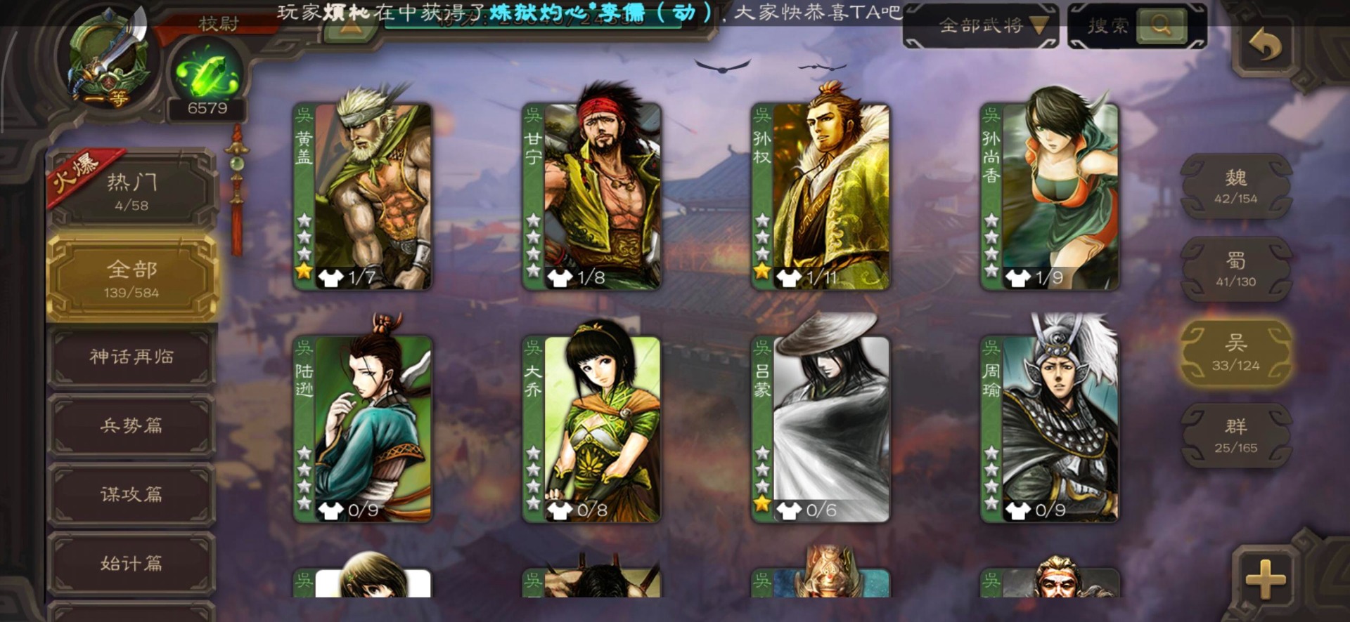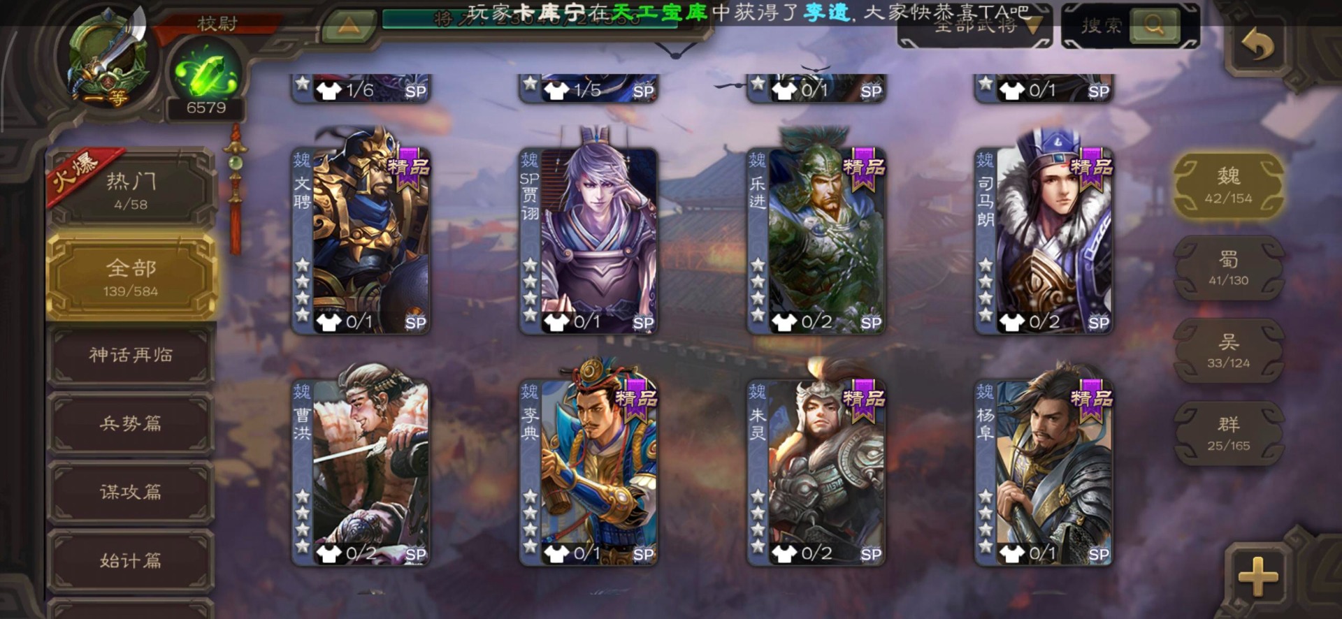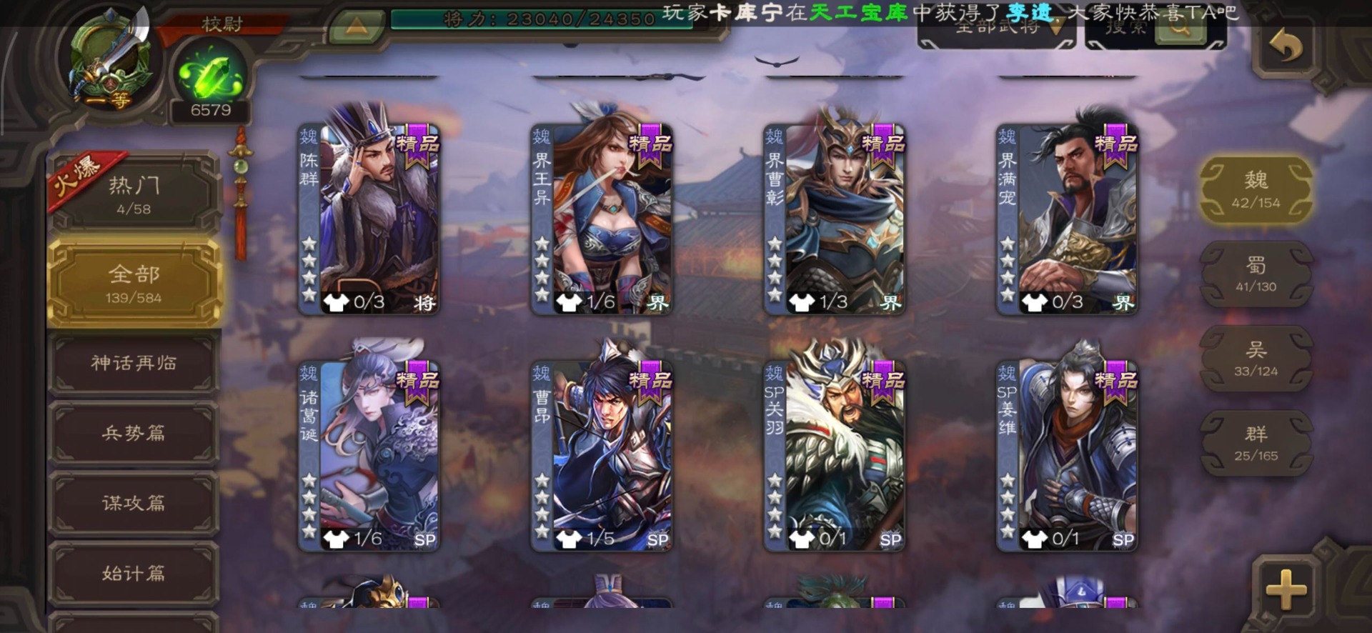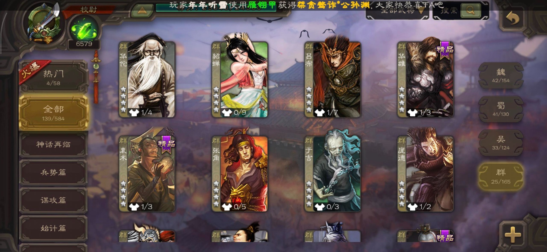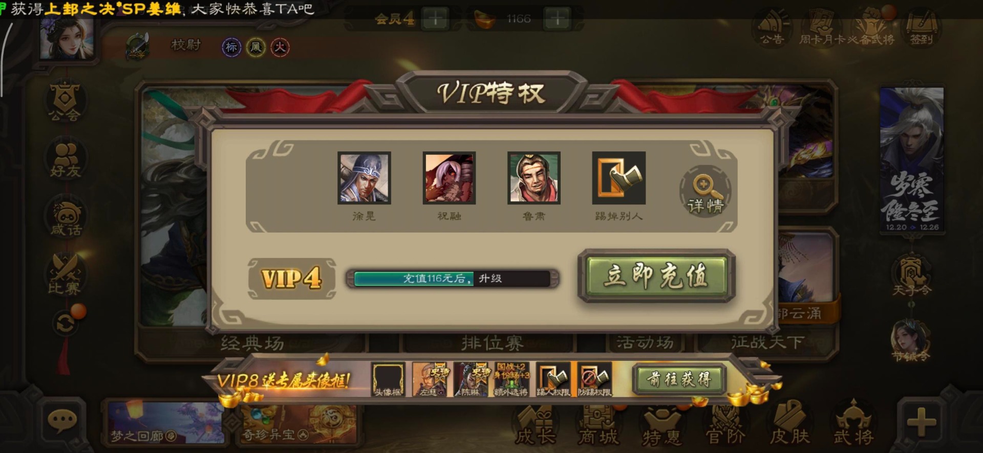 [16530467]vip4 校尉 139武将 1史诗武将 【魏国武将】甄姬司马懿许褚夏侯惇郭嘉曹仁曹操张辽 【蜀国武将】刘备黄忠马超诸葛亮张飞关羽黄月英赵云 【吴国武将】势太史慈 【群国武将】袁术貂蝉华佗吕布于吉