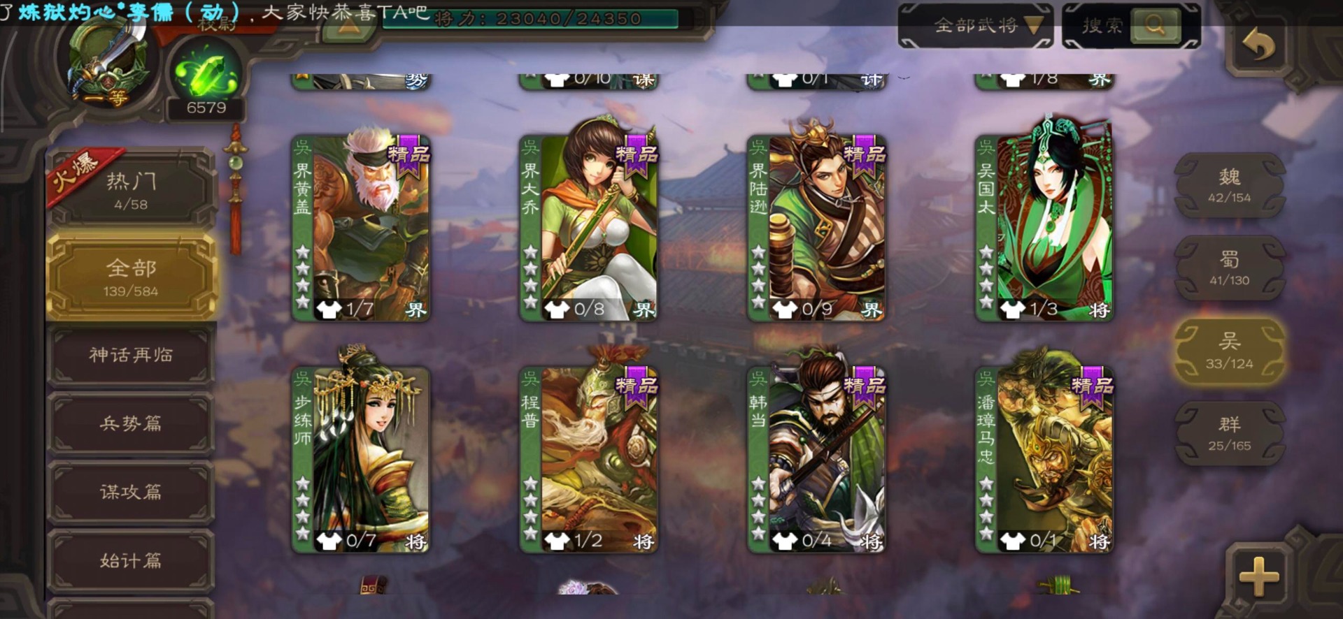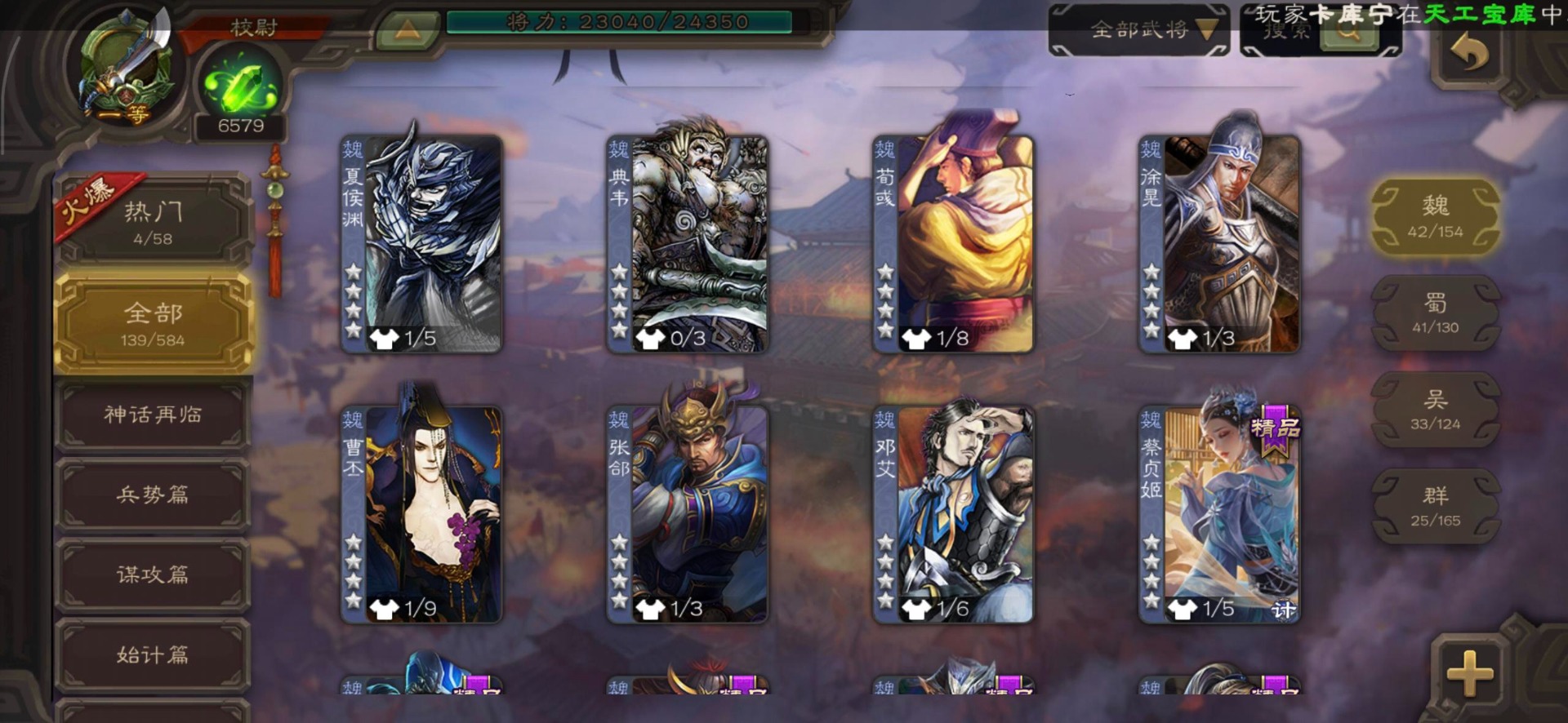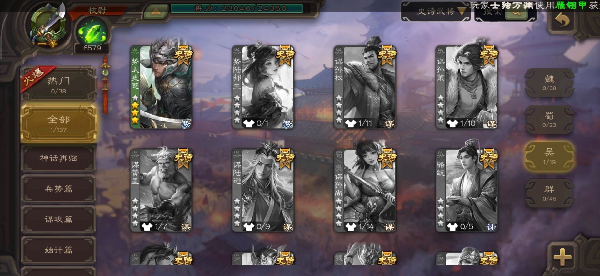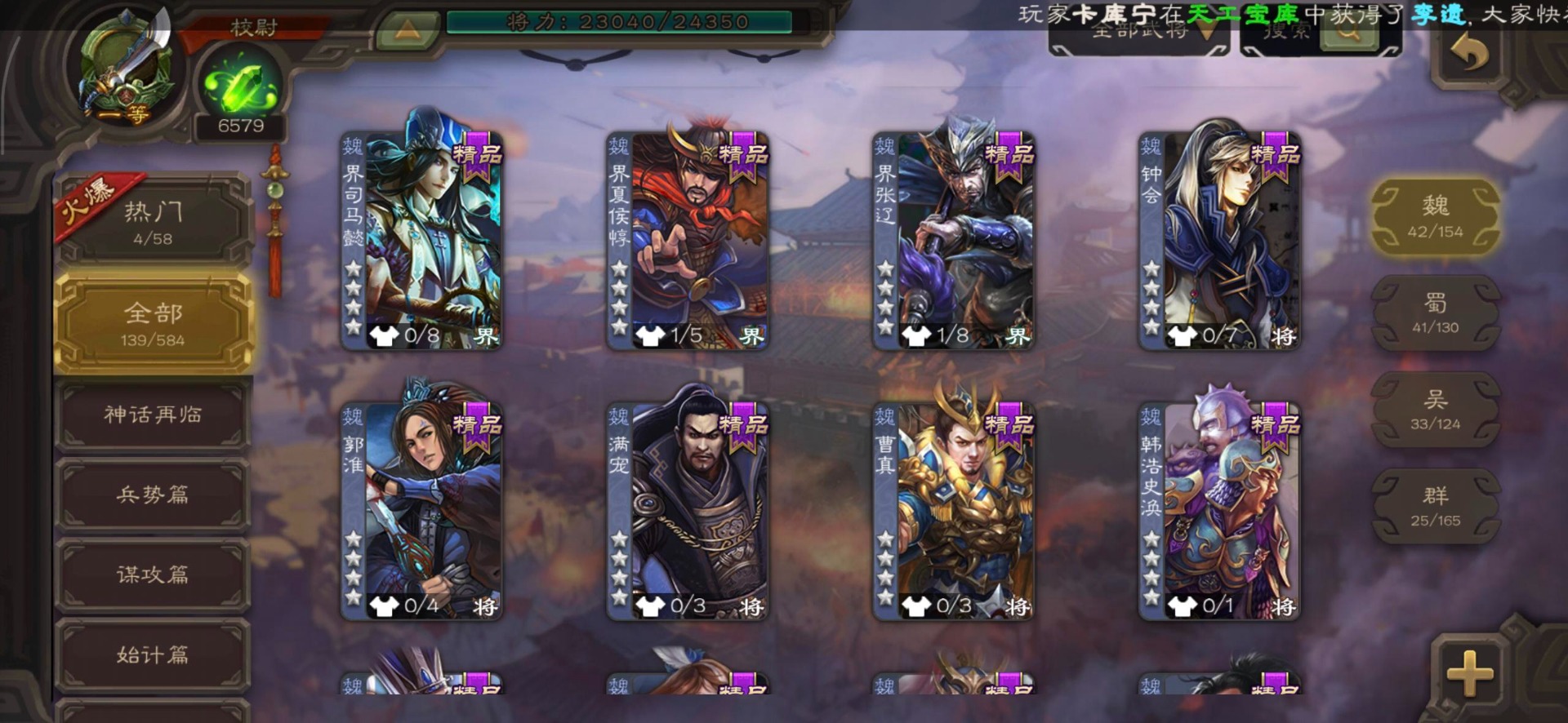 [16530467]vip4 校尉 139武将 1史诗武将 【魏国武将】甄姬司马懿许褚夏侯惇郭嘉曹仁曹操张辽 【蜀国武将】刘备黄忠马超诸葛亮张飞关羽黄月英赵云 【吴国武将】势太史慈 【群国武将】袁术貂蝉华佗吕布于吉