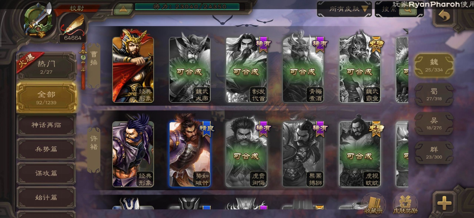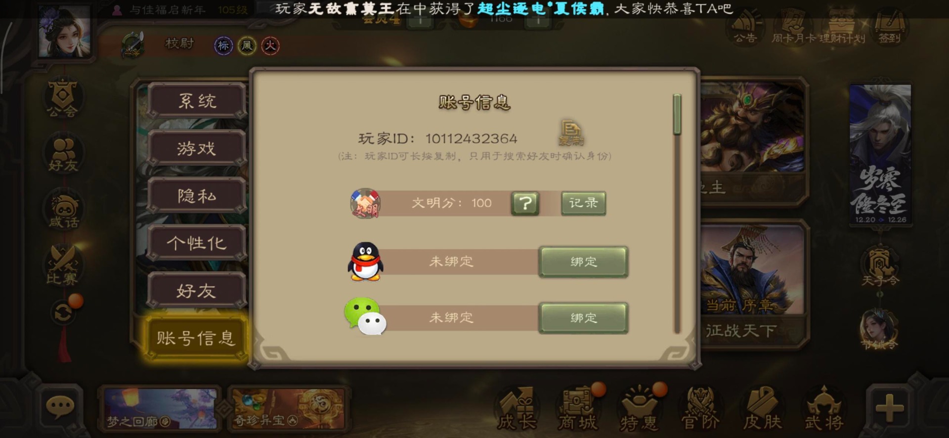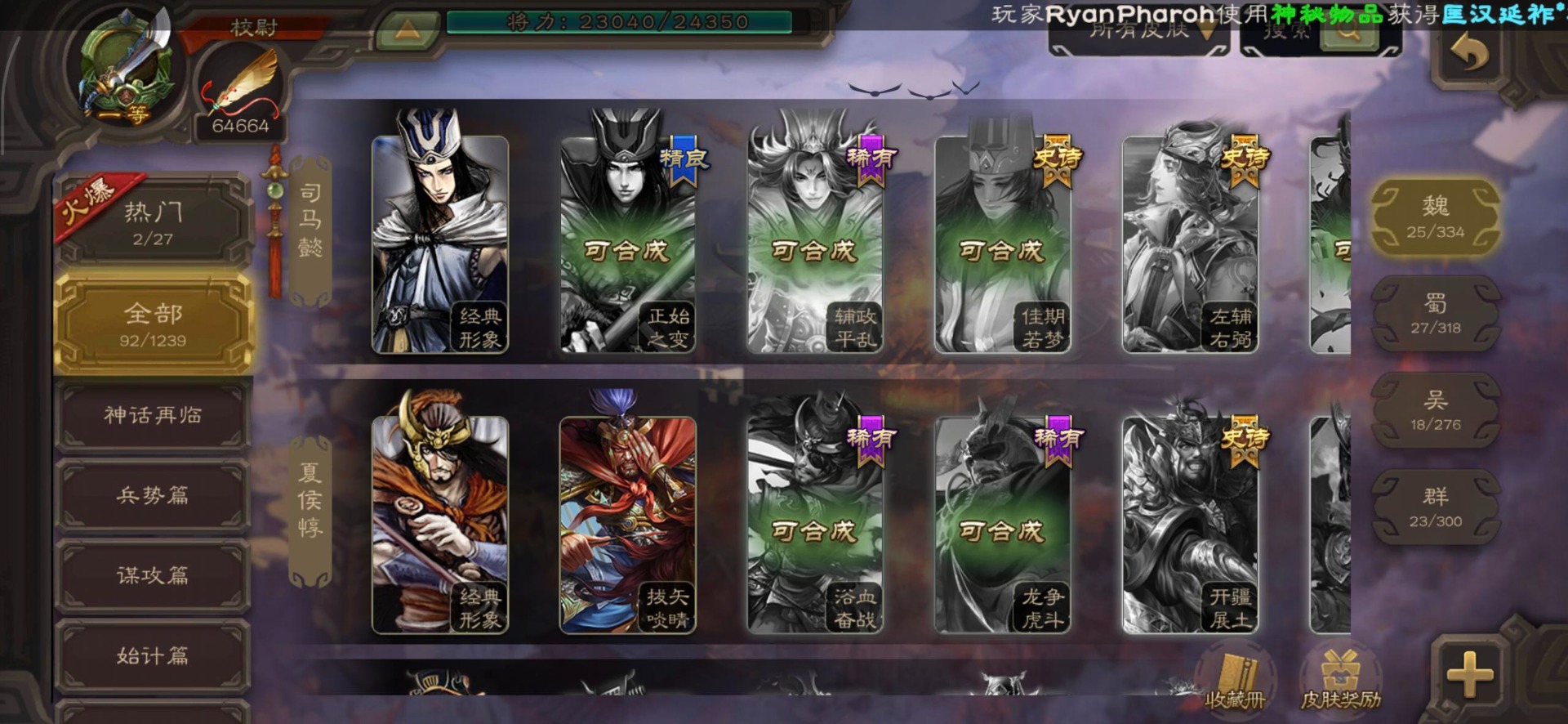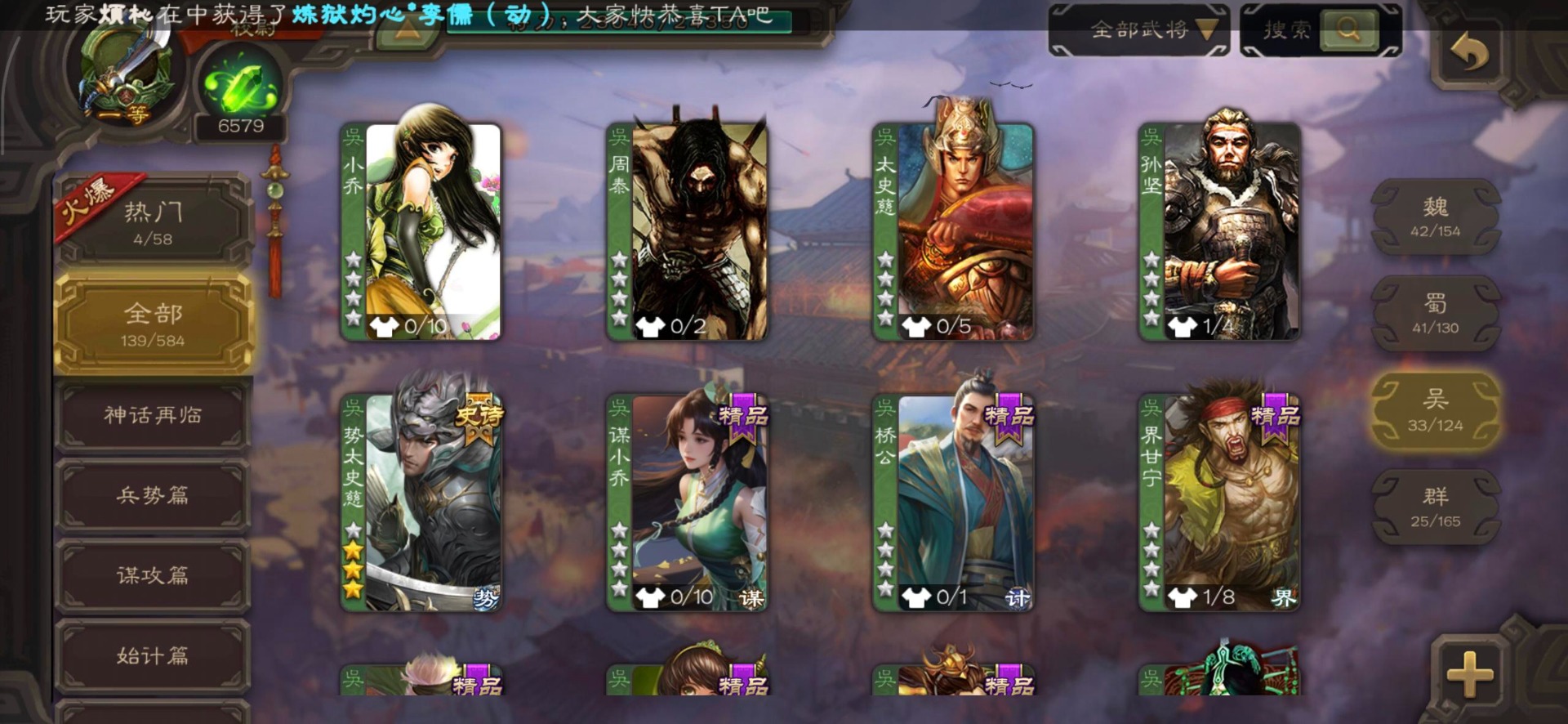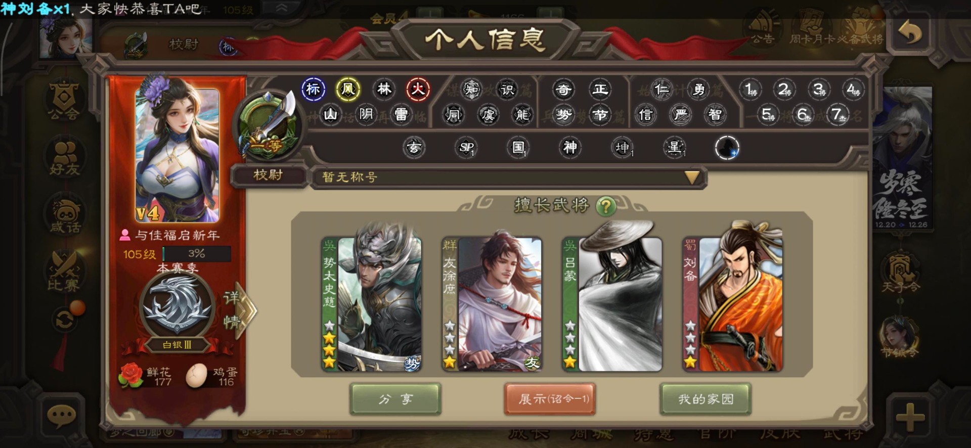 [16530467]vip4 校尉 139武将 1史诗武将 【魏国武将】甄姬司马懿许褚夏侯惇郭嘉曹仁曹操张辽 【蜀国武将】刘备黄忠马超诸葛亮张飞关羽黄月英赵云 【吴国武将】势太史慈 【群国武将】袁术貂蝉华佗吕布于吉