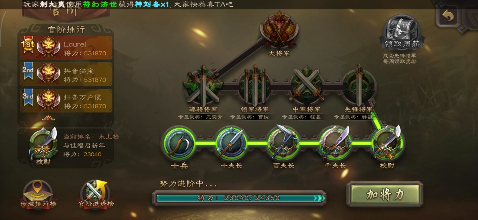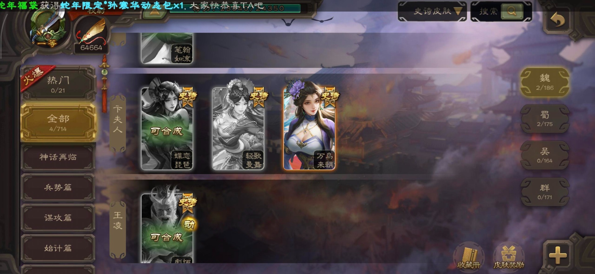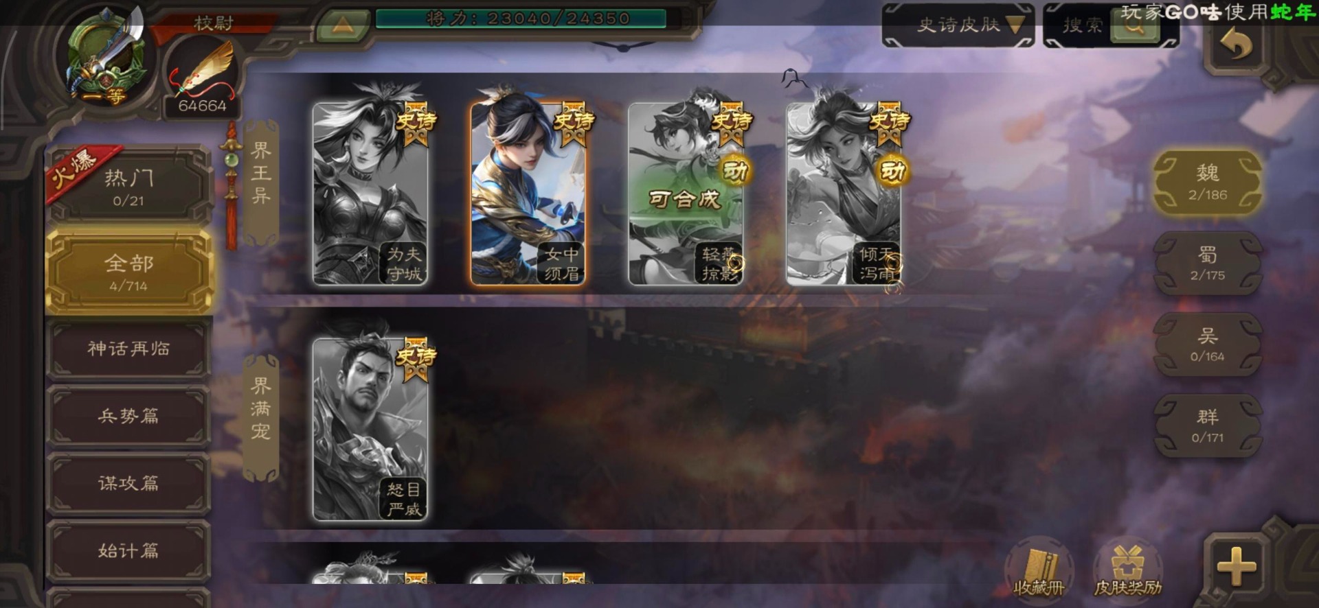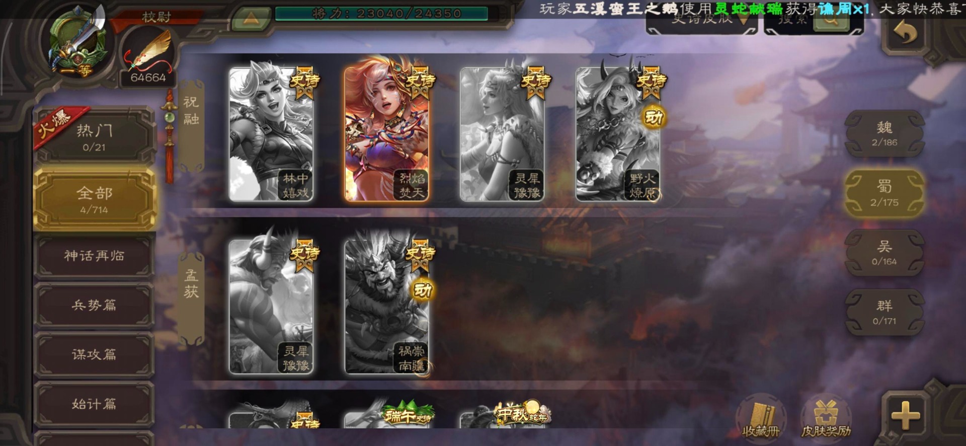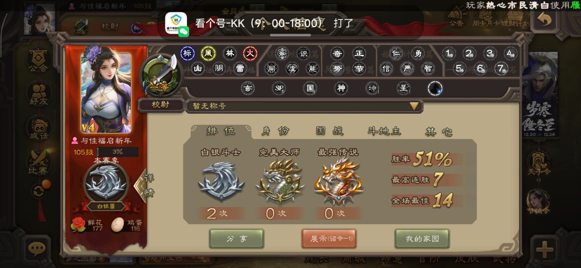 [16530467]vip4 校尉 139武将 1史诗武将 【魏国武将】甄姬司马懿许褚夏侯惇郭嘉曹仁曹操张辽 【蜀国武将】刘备黄忠马超诸葛亮张飞关羽黄月英赵云 【吴国武将】势太史慈 【群国武将】袁术貂蝉华佗吕布于吉