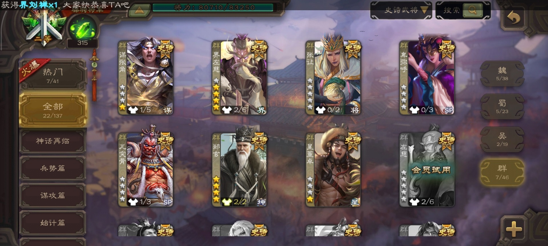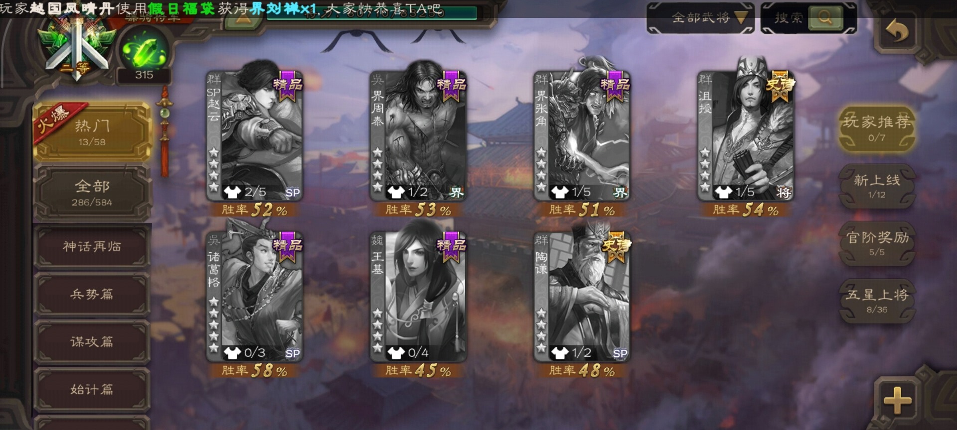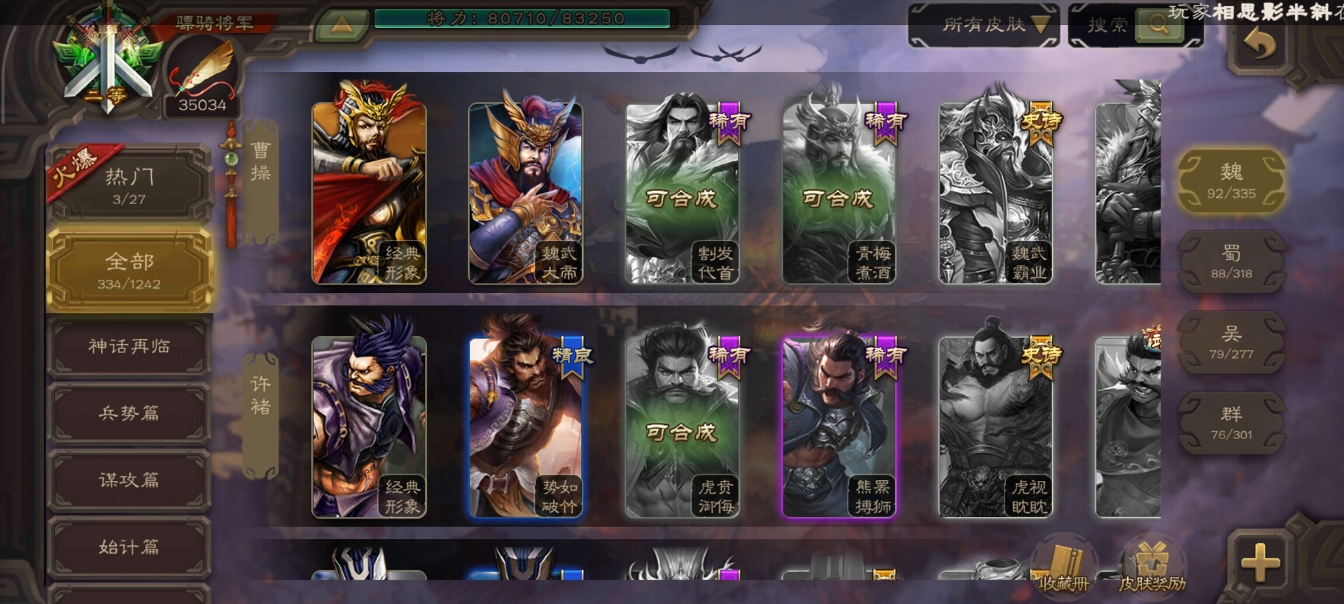 [16530490]vip8 骠骑将军 286武将 24动态皮肤 22史诗武将 【神将】神吕布神陆逊神郭嘉 【魏国武将】清河公主曹髦杨修程昱曹纯 【蜀国武将】谋诸葛亮谋赵云谯周花鬘谋关羽 【吴国武将】势太史慈界徐盛 【群国武将】星董卓郑玄张让兀突骨界左慈卑弥呼谋张角