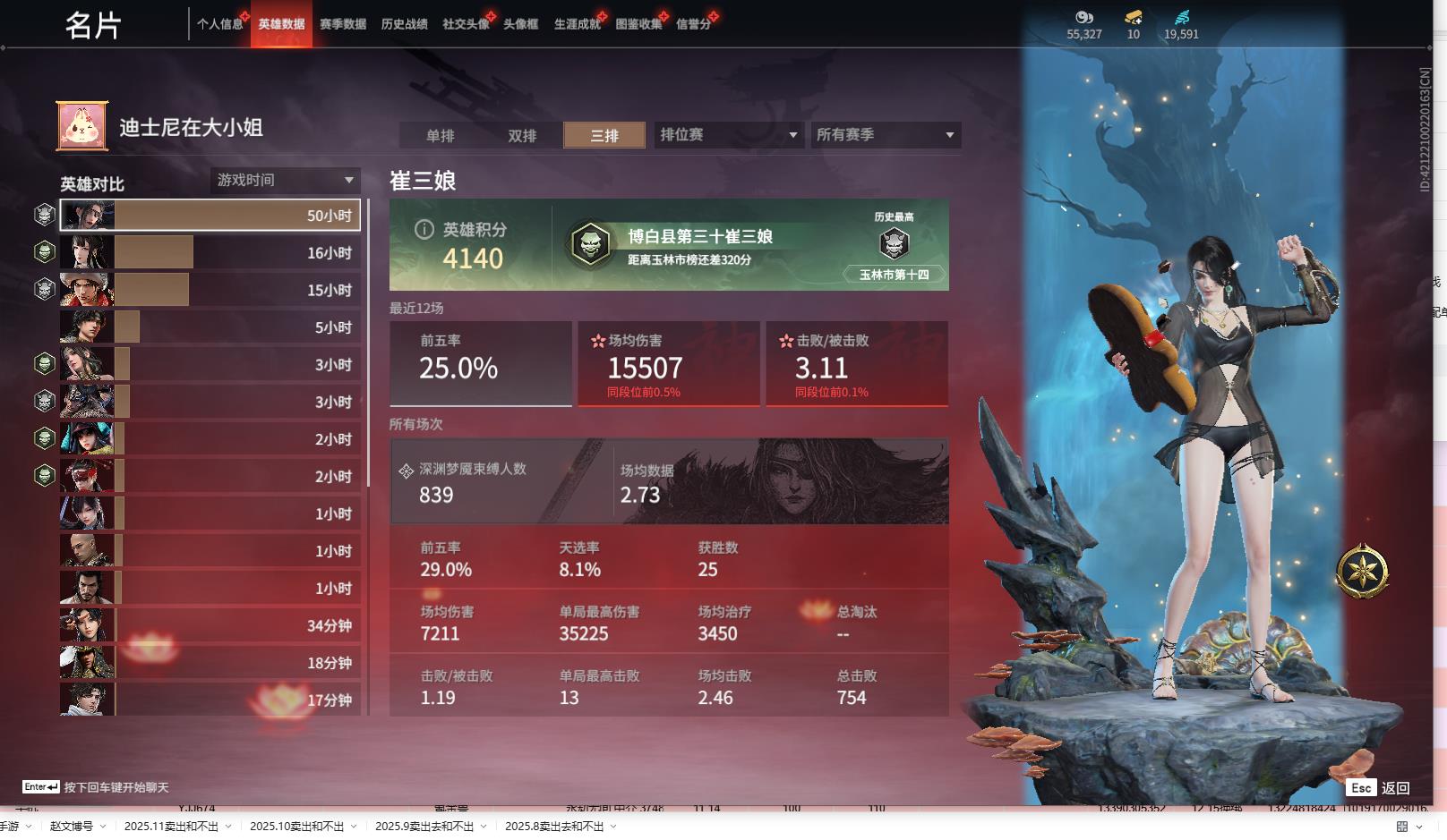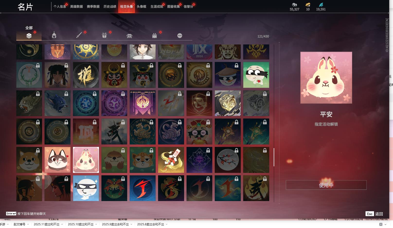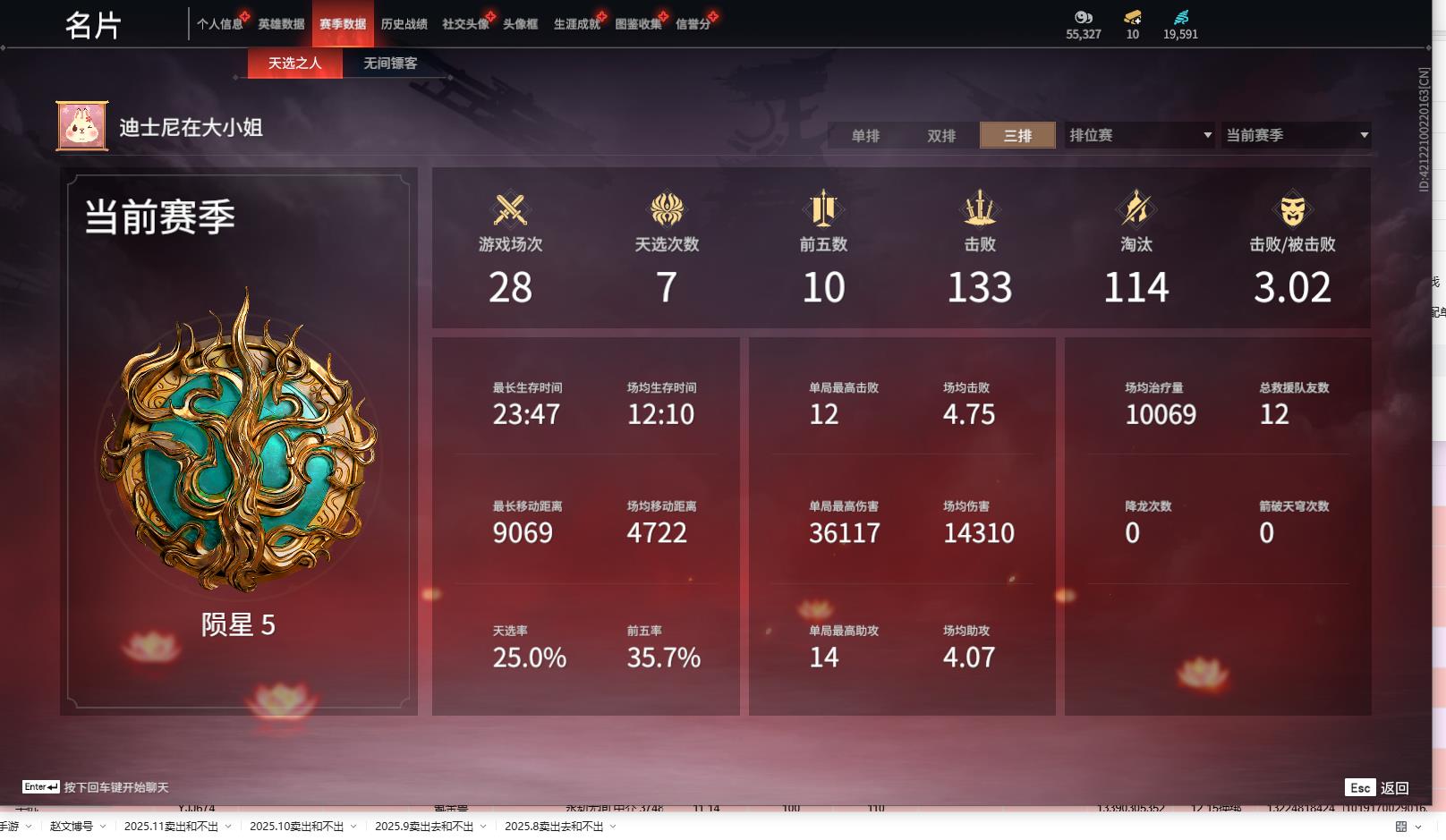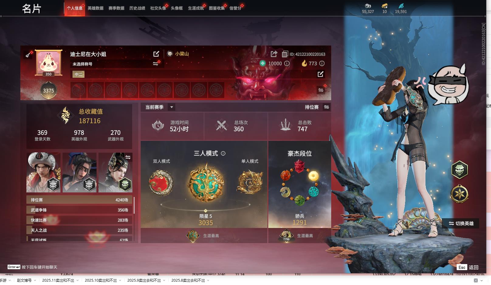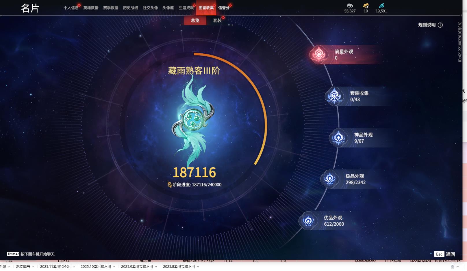 [13645959]yjj664/12.14换绑/等级350/s18三人陨星5/9红298金收藏值187116/新倩女幽魂·长天藏锦/戎金狼/泣珠龙纱/沙漠香风/天罚/帝星/龙雀/烈阳/狂龙/洛天依星轨引航/御宅罗梦(白丝)夏日派对·弄潮逐浪/西行劫·杨戬/龙之影·过江龙/荆魂/幻丝19591/未绑定手游