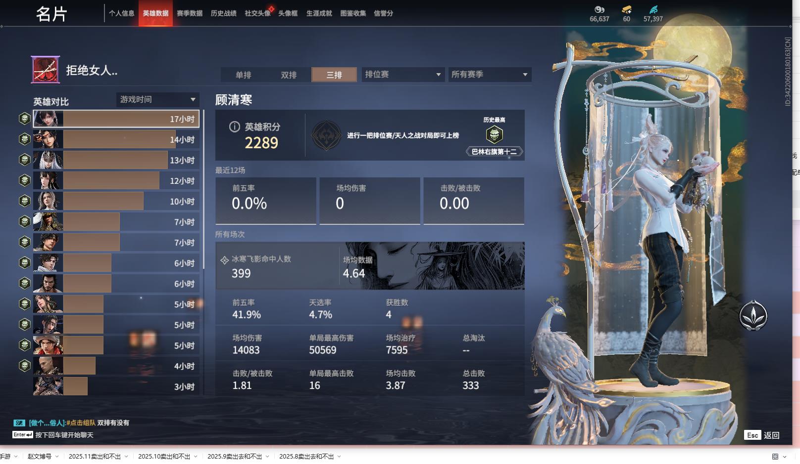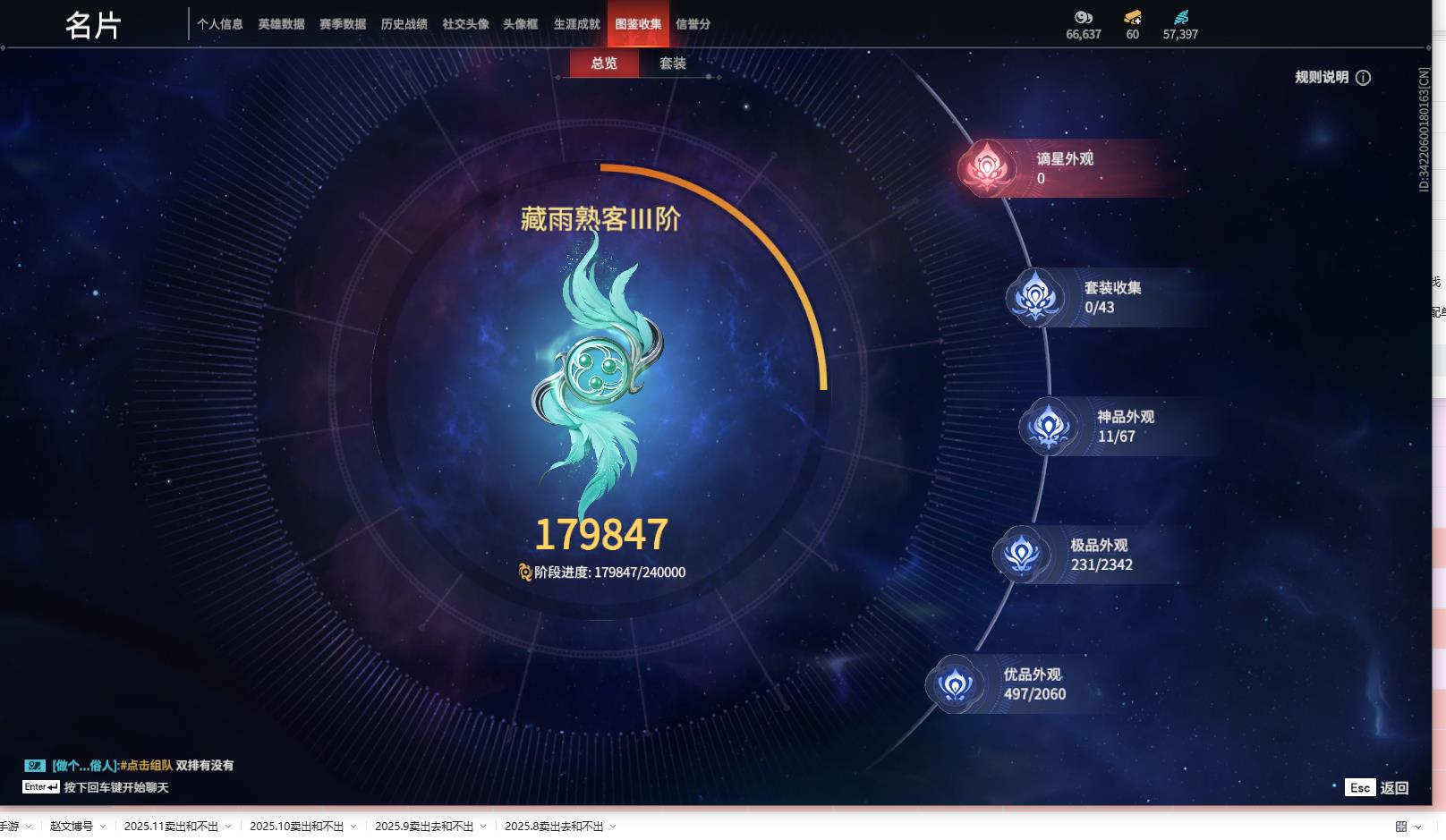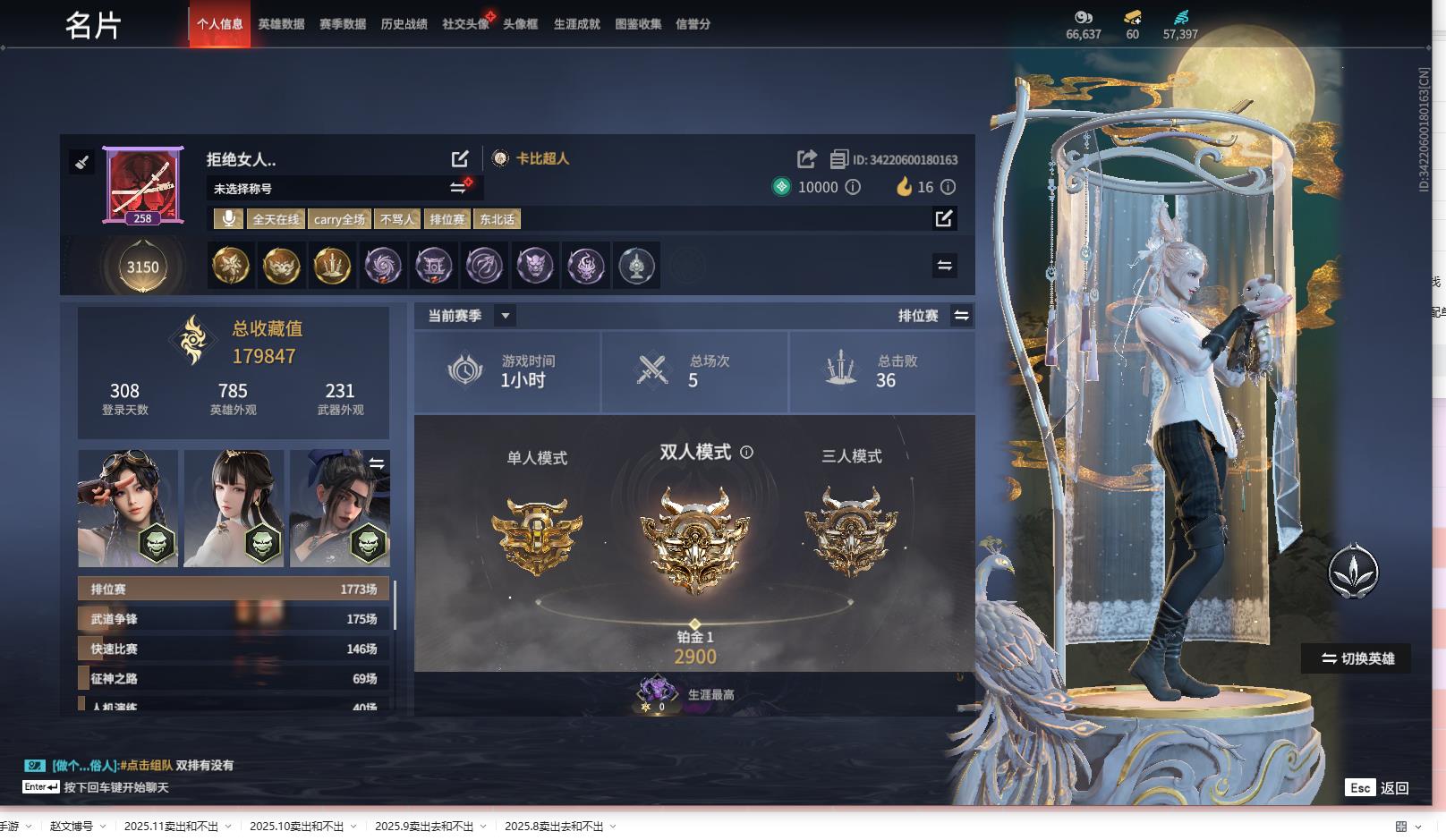 [13648361]yjj666/12.14换绑/等级258/s18三人铂金4/11红231金收藏值179847/赤皓新囍/初代玄女/墨离/绝代风华/流金晓锦/少阳剑/比羿/龙雀/烈阳/狼主/飞将戟/珥冰/御宅罗梦(白丝)/龙之影·过江龙/荆魂/拳皇勾玉/揽九天/幻丝57397/未绑定手游