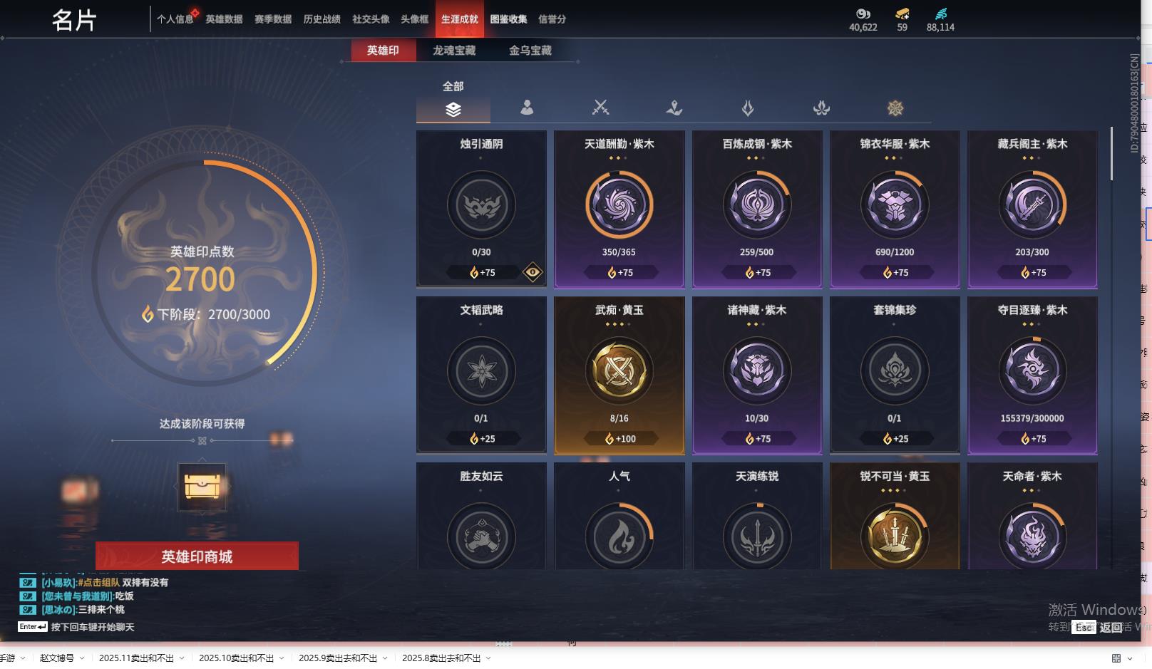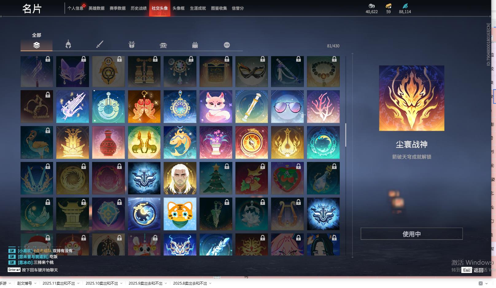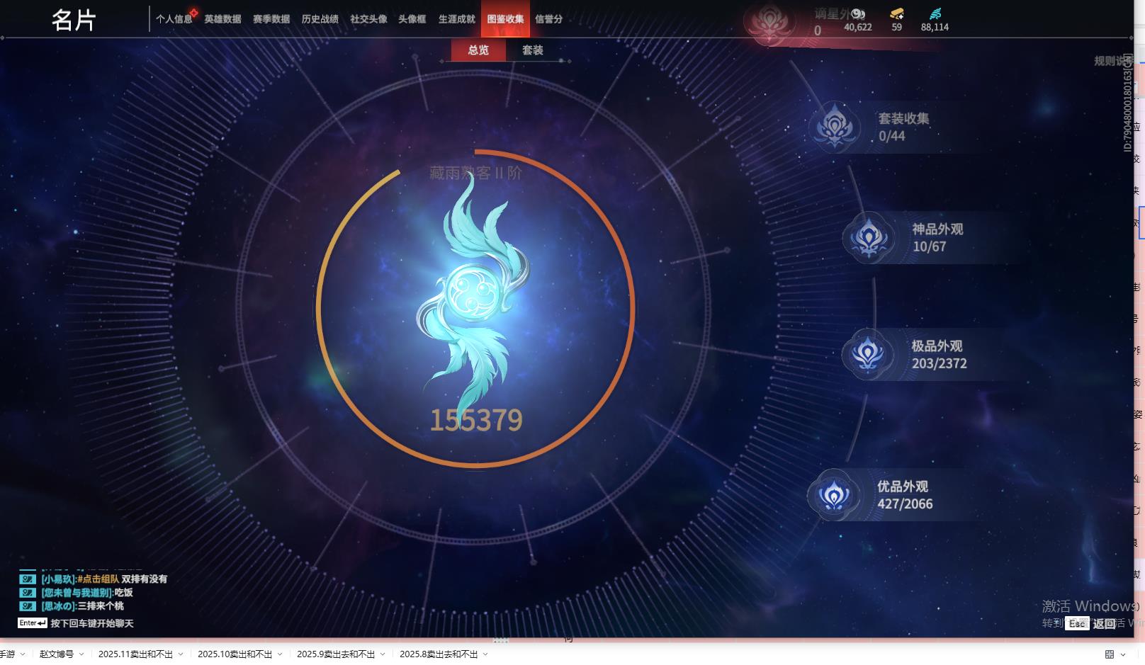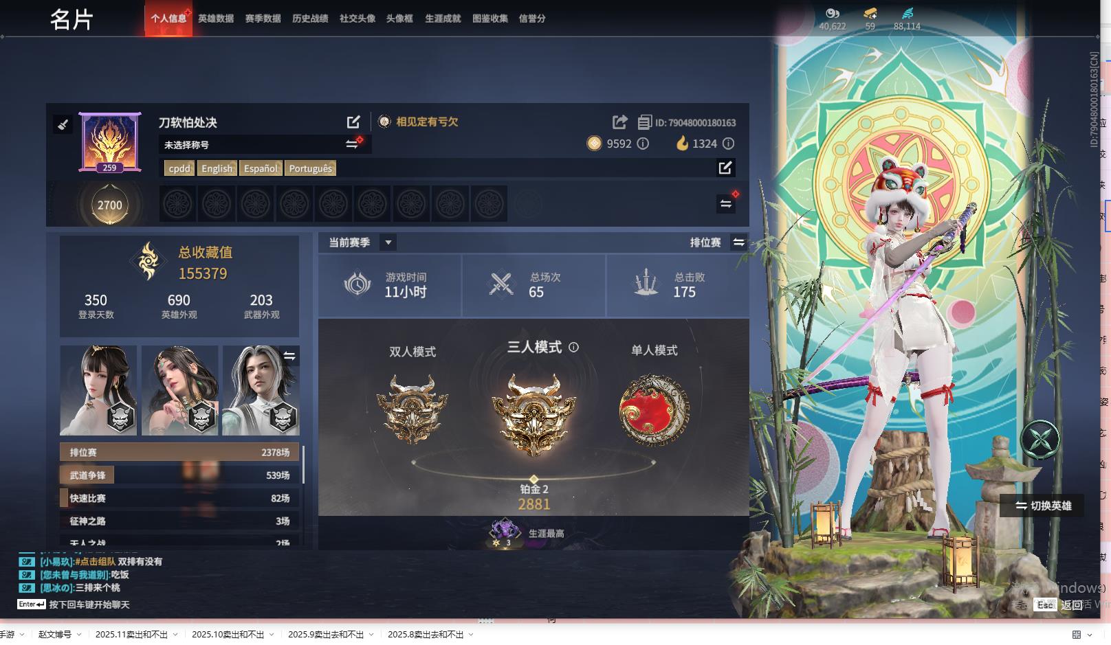 [13968314]yjj754/12.23换绑/等级259/s18三人铂金2/10红203金收藏值155379/赤皓新囍/初代玄女/墨离/化生明王/熛怒炼火/苍穹之光/毕方/龙雀/狼主/飞将戟//2674原型/珥冰/御宅罗梦(白丝)/龙之影·过江龙/夏日派对·盛夏白阳/夏日派对·赤夏悠漾/幻丝88114