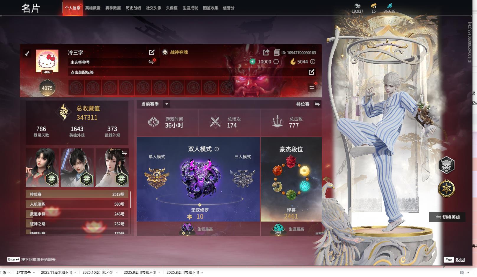 [14001351]yjj777/12.25换绑/等级406/s18三人白银1/21红505金收藏值347311/初代玄女/化生明王/戎金狼/熛怒炼火//泣珠龙纱/海之奇/香雪水兰/绝代风华/沙漠香风/夜魅游莹/苍穹之光/少阳剑/2674·终极型·紫没原色)灵狐幻刃/帝星/龙雀/烈阳/狼主/飞将戟/涯角/狂龙/2674·超越型/2674·超越型·紫/2674·初代机/龙门石龛造像/龙之影·龙虎斗/御翔云/夏日派对·椰风夕照/龙之影·精武魂/夏日派对·高校水着/御宅罗梦(白丝)夏日派对·弄潮逐浪/西行劫·杨戬/龙之影·过江龙/夏日派对·盛夏白阳/龙之道·灵心/幻丝36618/已绑定手游