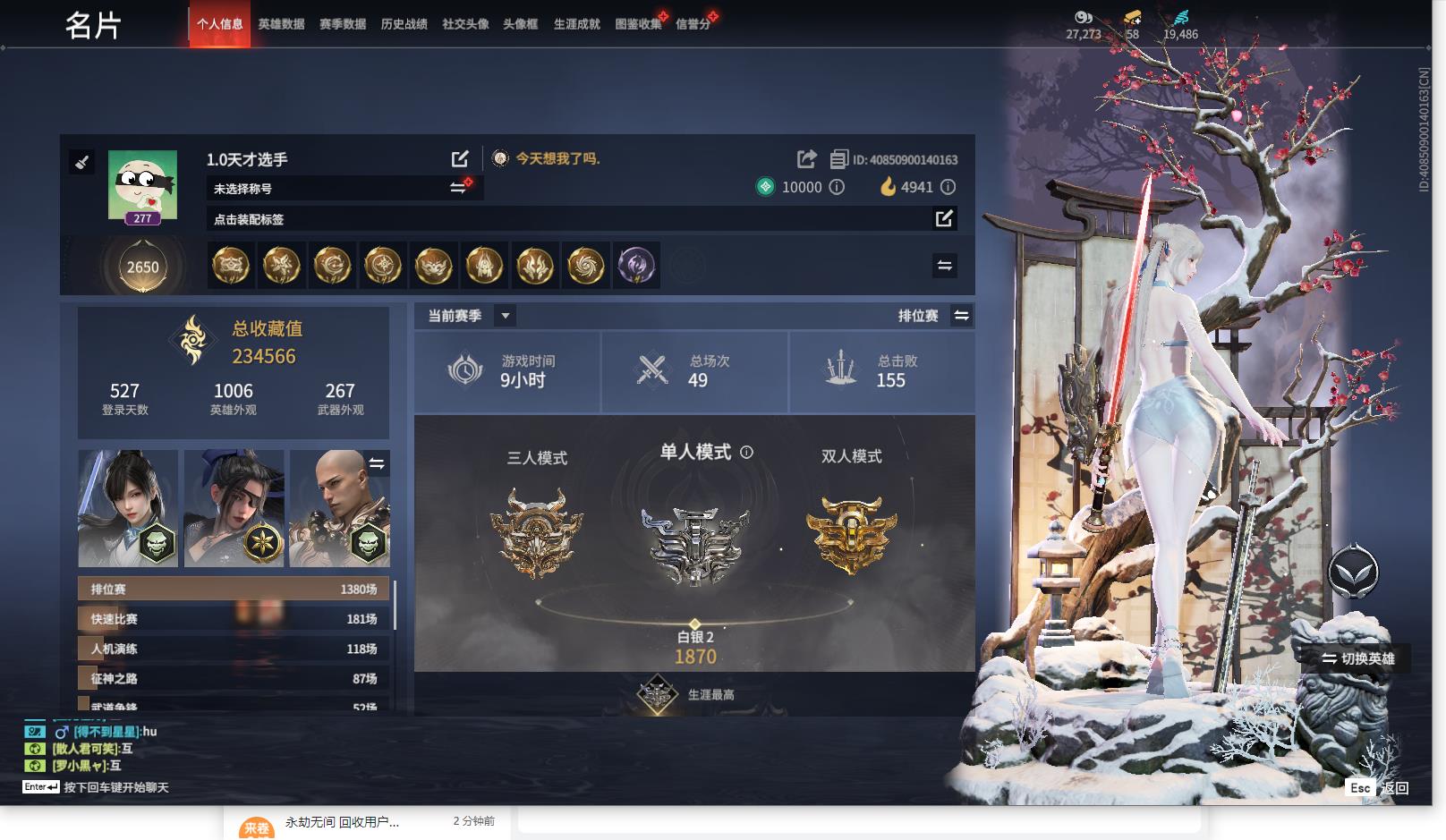 [14123687]yjj818/12.29换绑/等级277/s18三人铂金2/13红317金收藏值234566/赤皓新囍/化生明王/戎金狼/蝶梦/泣珠龙纱/监兵凶神/流金晓锦/天罚/少阳剑/帝星/龙雀/飞将戟/凤求凰/2674·初代机/炎烈珠/洛天依·星轨引航/洛天依·音愈律阶/龙之影·过江龙/荆魂/夏日派对·仲夏霜华/揽九天/幻丝19486/未绑定手游