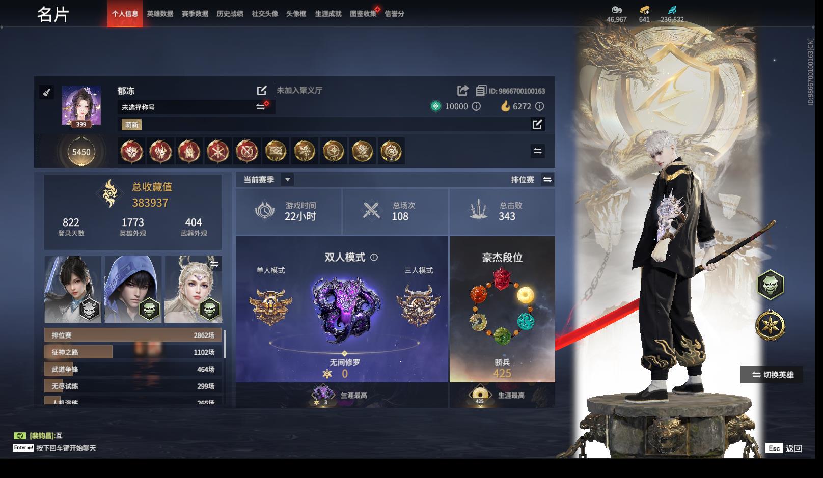 [14156211]yjj838/12.30换绑/等级399/s18三人铂金2/17红629金收藏值383937/赤皓新囍/墨离/星辉魔纱/新倩女幽魂·长天藏锦/蝶梦/凌霄之羽/绝代风华/监兵凶神/流金晓锦//逐光者/天罚/苍穹之光/少阳剑/帝星/龙雀/西行劫·如意金箍棒/狂龙/2674·超越型//2674·初代机/观山海·春木/御宅罗梦(白丝)/龙之影·精武魂/龙之道·无拘/龙之影·过江龙//西行劫·杨戬/夏日派对·仲夏霜华/夏日派对·昭夏流金/夏日派对·赤夏悠漾/夏日派对·盛夏白阳/葫芦兄弟·宝葫芦/夏日派对·半夏晚风/龙之道·灵心/狩猎都市·雷行猎手/幻丝236832/已绑定手游