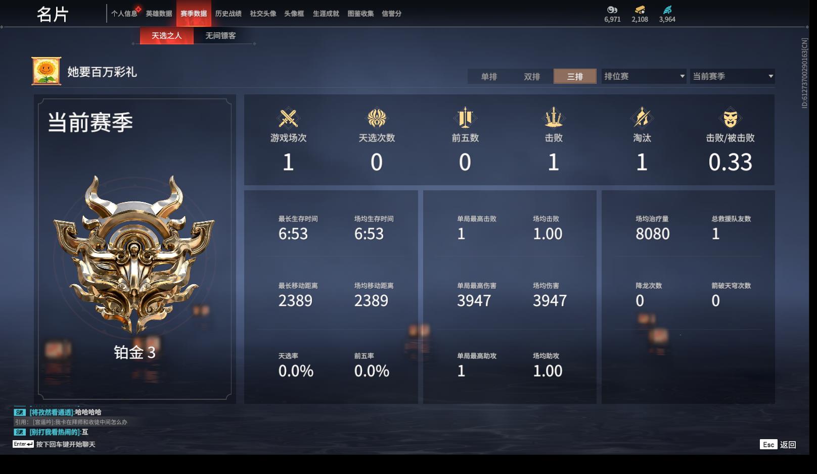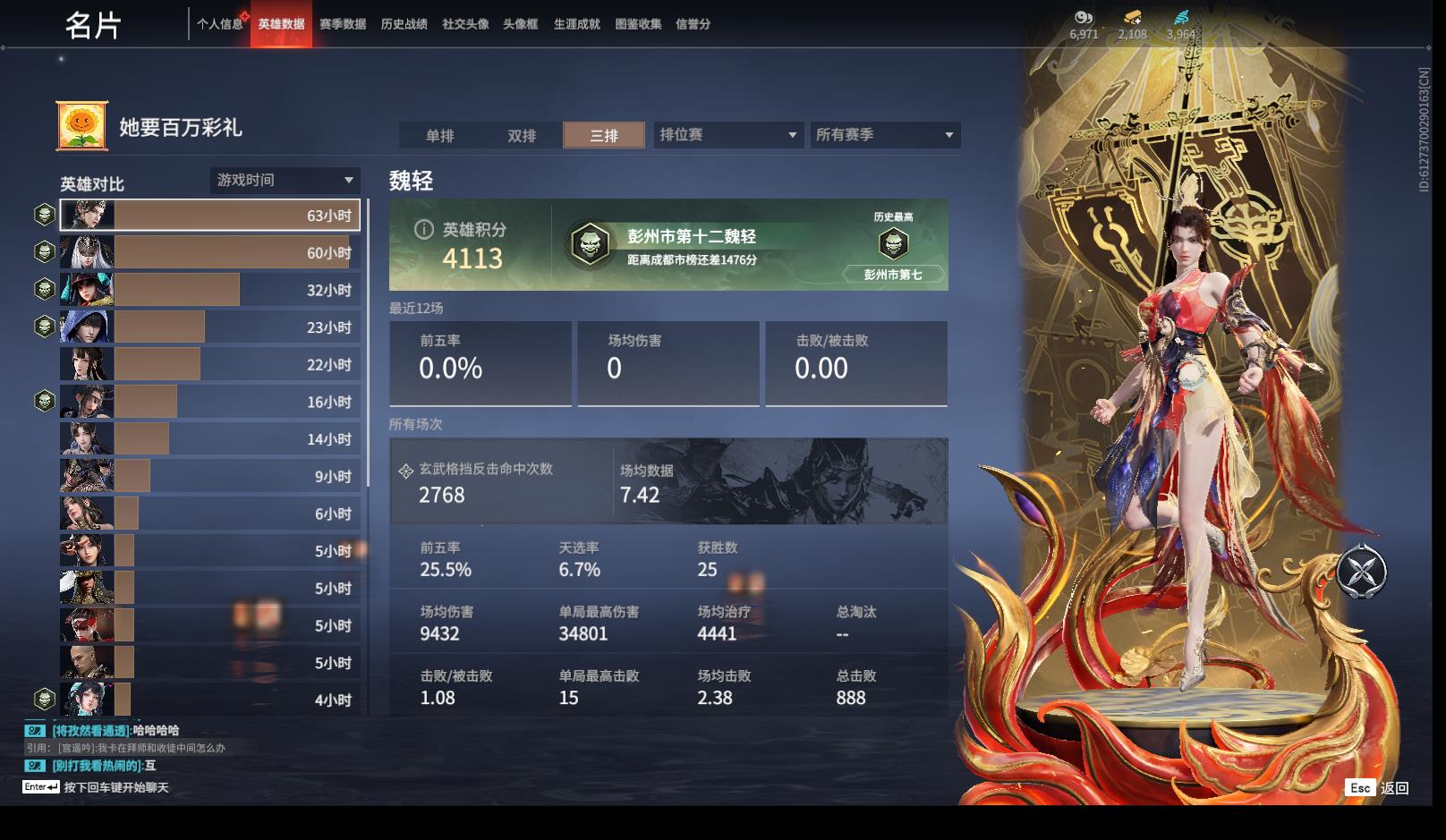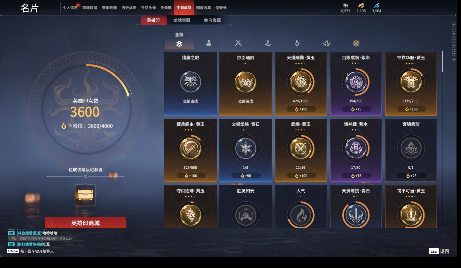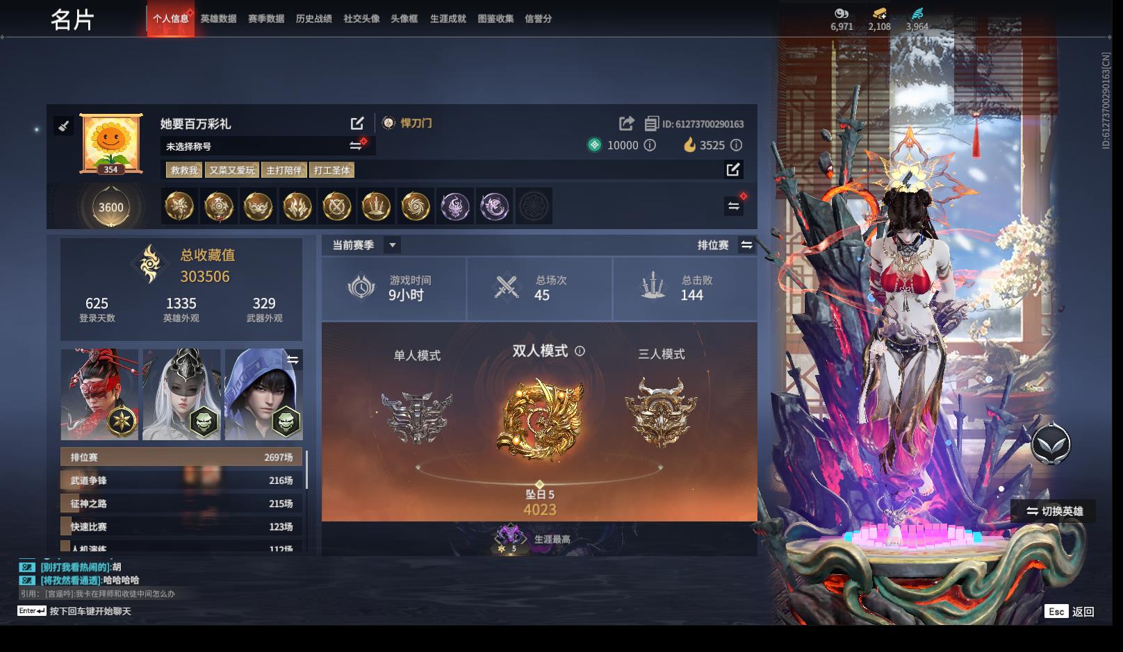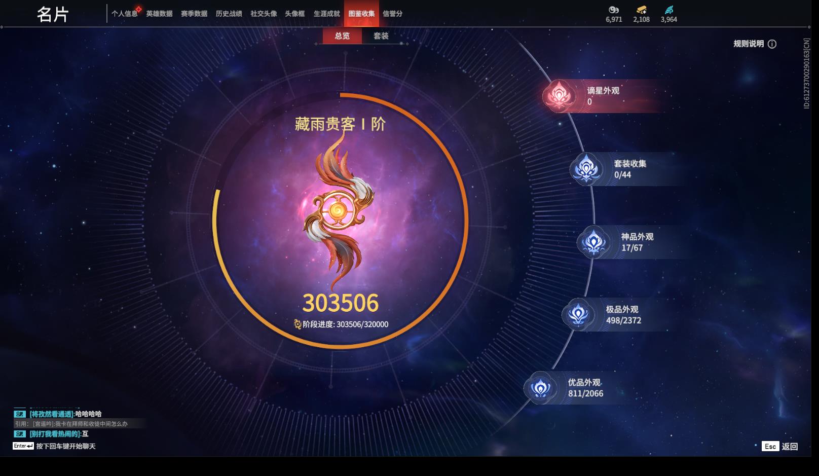[14184220]yjj851/12.31换绑/等级354/s18三人铂金3/17红498金收藏值303506/赤皓新囍/初代玄女/墨离/星辉魔纱/化生明王/戎金狼/熛怒炼火/樱云天女/沙漠香风/化道者/守墨麒/天罚/苍穹之光/帝星/龙雀/悍虎斩/逆晦朔/2674原型/璃光·星辉环月/绿野守侯竹韵悠/珥冰/洛天依·星轨引航/龙之影·过江龙//荆魂/狩猎都市·雷行猎手/幻丝3964/已绑定手游