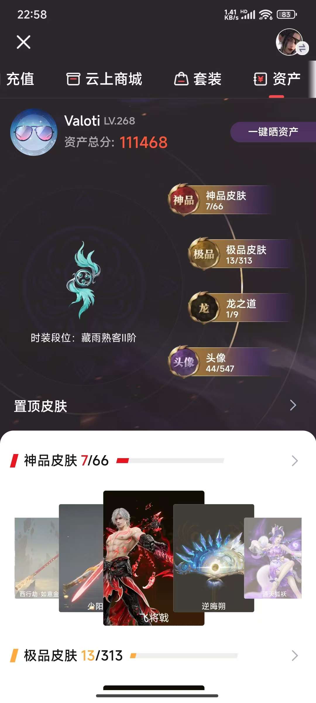网易官服 已绑定手游 等级:268 7红皮 13金皮 【红皮】 飞将戟斩马刀皮肤 逆晦朔扇皮肤 通天狐袄玉玲珑皮肤 西行劫·如意金箍棒棍皮肤 少阳剑长剑皮肤 戎金狼特木尔皮肤 狼主阔刀皮肤 【金皮】 开辟鸿蒙·风雨谐 封神录·申公豹 观山海·相柳 浣烟纱 观山海·腓腓 九骊之君 清雅少女 九阴圣女 红川仙子 瀚海苍鹰 贵胄少女 碧水青天 西行劫·悟空