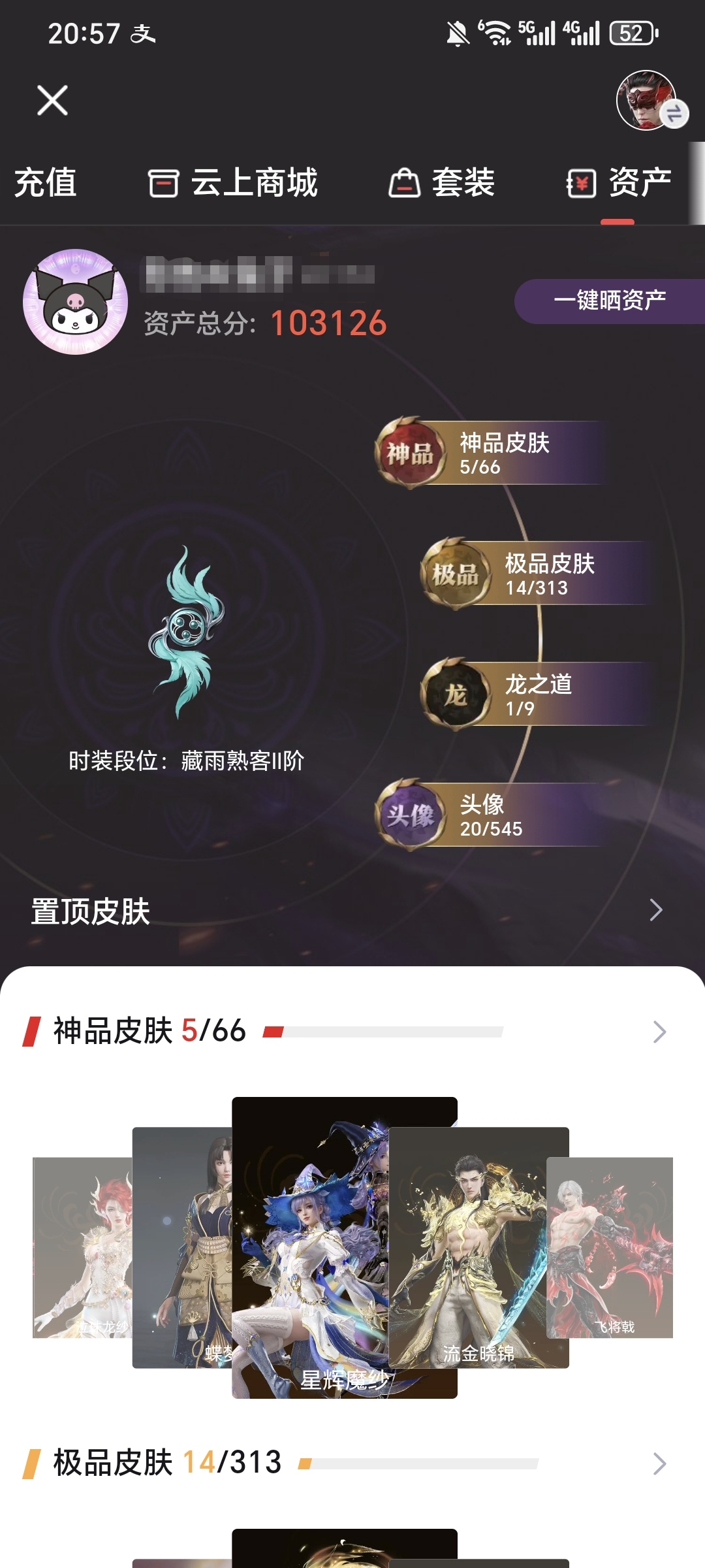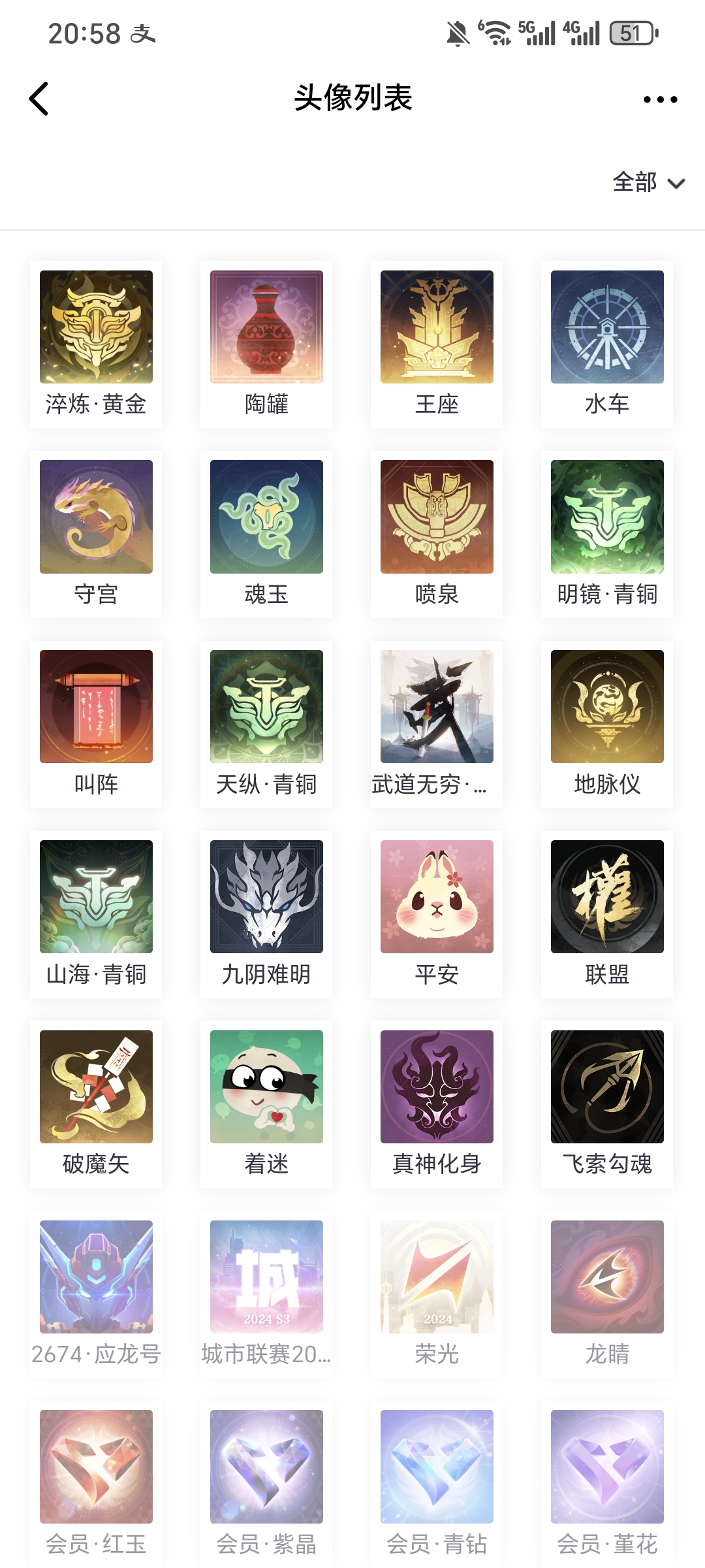 【游戏等级】174 5红 14金 1龙之道 飞将戟 【大区】国服 【龙之道】龙之影·过江龙 【排位】蚀月ⅱ 【神品皮肤】星辉魔纱 流金晓锦 飞将戟 泣珠龙纱 蝶梦 【极品皮肤】赤阳天狐 赤焰战灵 寿竹云春 浣烟纱 九骊之君 游四海 阴阳姬 清雅少女 贵胄少女 碧水青天 夜吻 湛卢 观山海·精卫 逆水寒·极夜天曦 【头像】淬炼·黄金 陶罐 王座 水车 守宫 魂玉