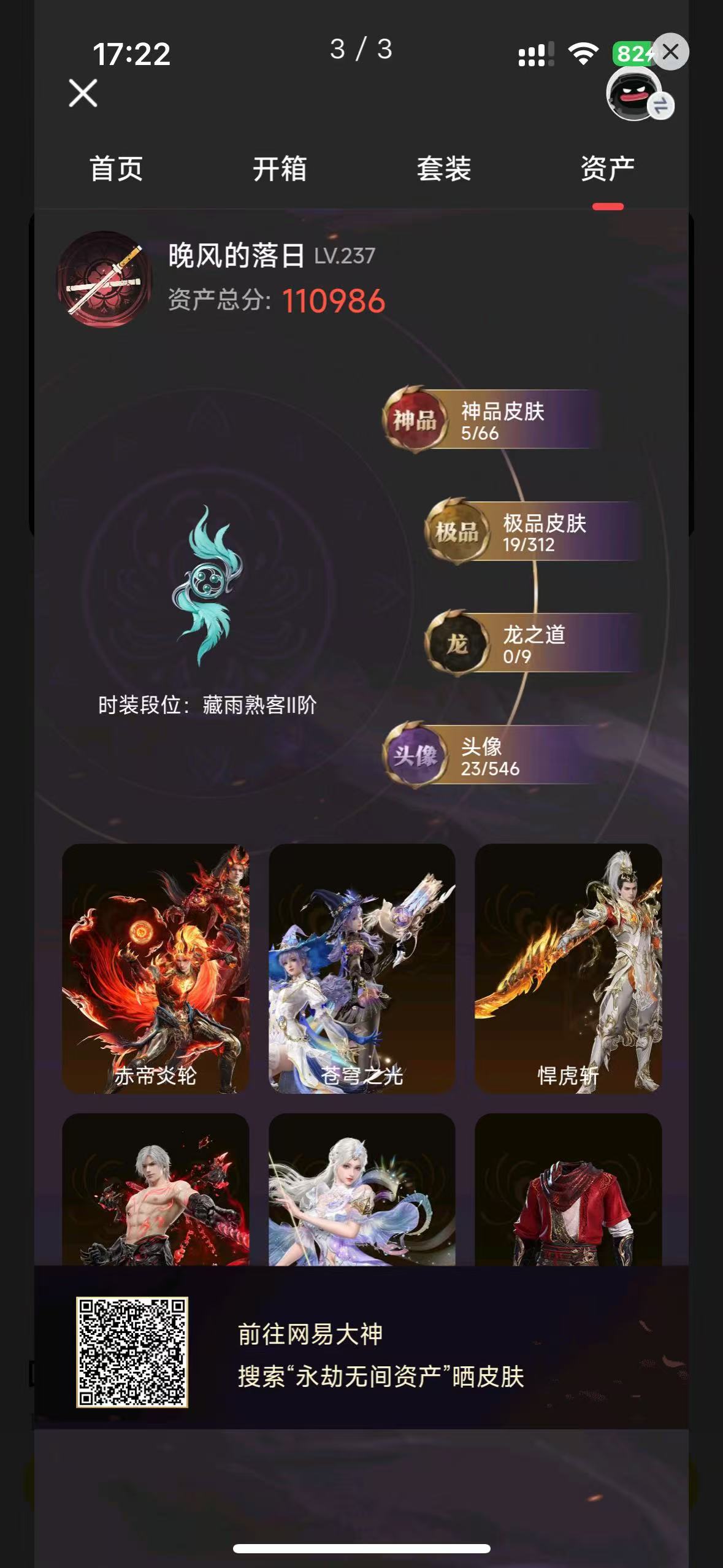 【游戏等级】240 5红 19金 悍虎斩 苍穹之光 赤帝炎轮 【大区】国服 【排位】陨星ⅳ 【神品皮肤】赤帝炎轮 苍穹之光 悍虎斩 监兵凶神 墨离 【极品皮肤】天虹咏 寿竹云春 封神录·申公豹 观山海·獬豸 斗罗大陆·唐三 若谷 清雅少女 贵胄少女 常胜袍 八宝龙王 一品仙君 畲族·凤凰装 新魔杰·斩魔天将 古冢行 梨